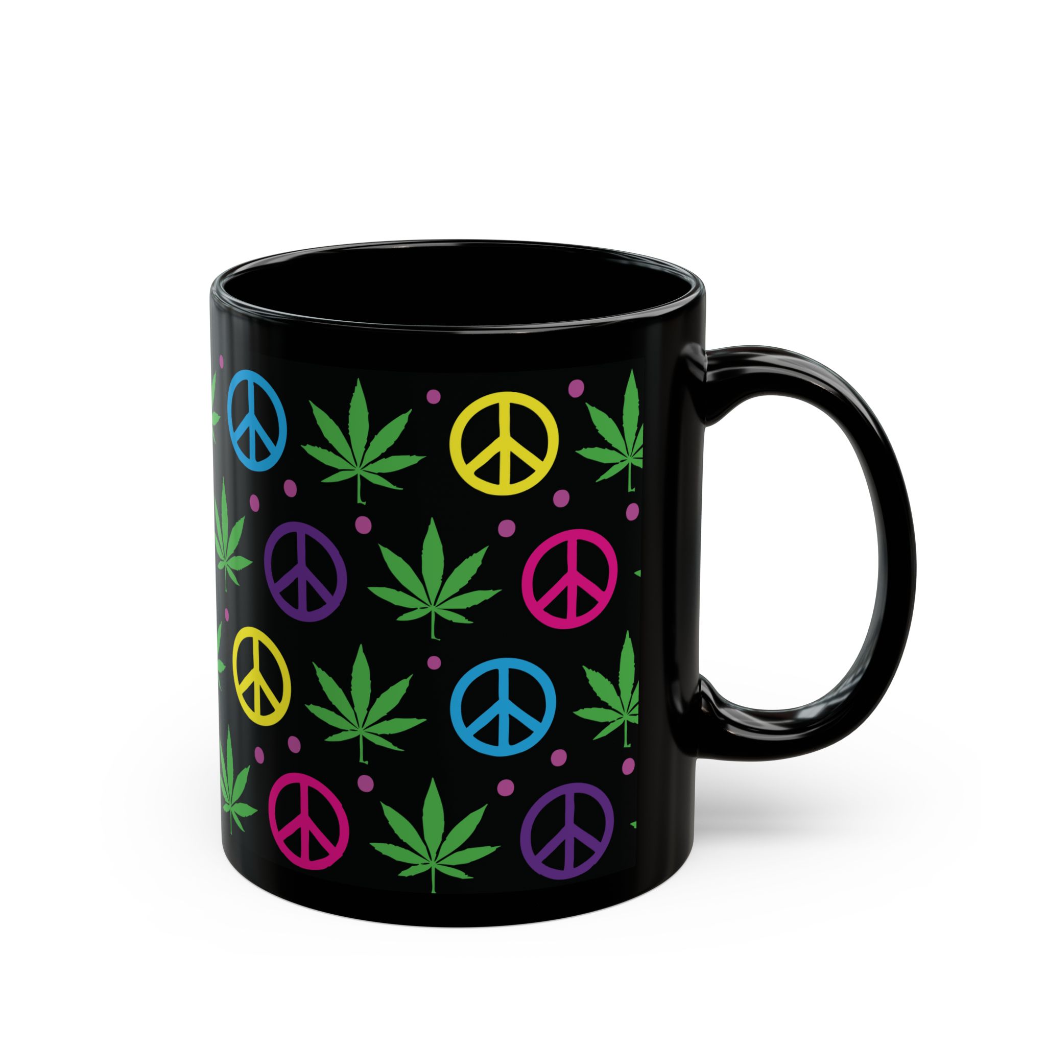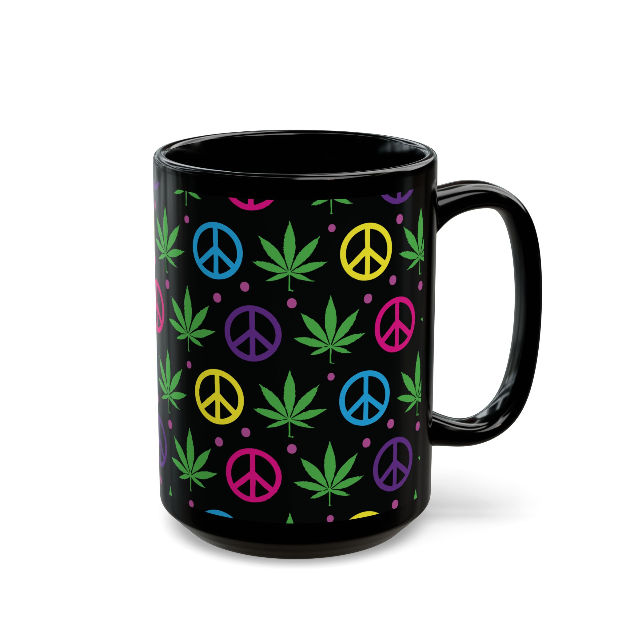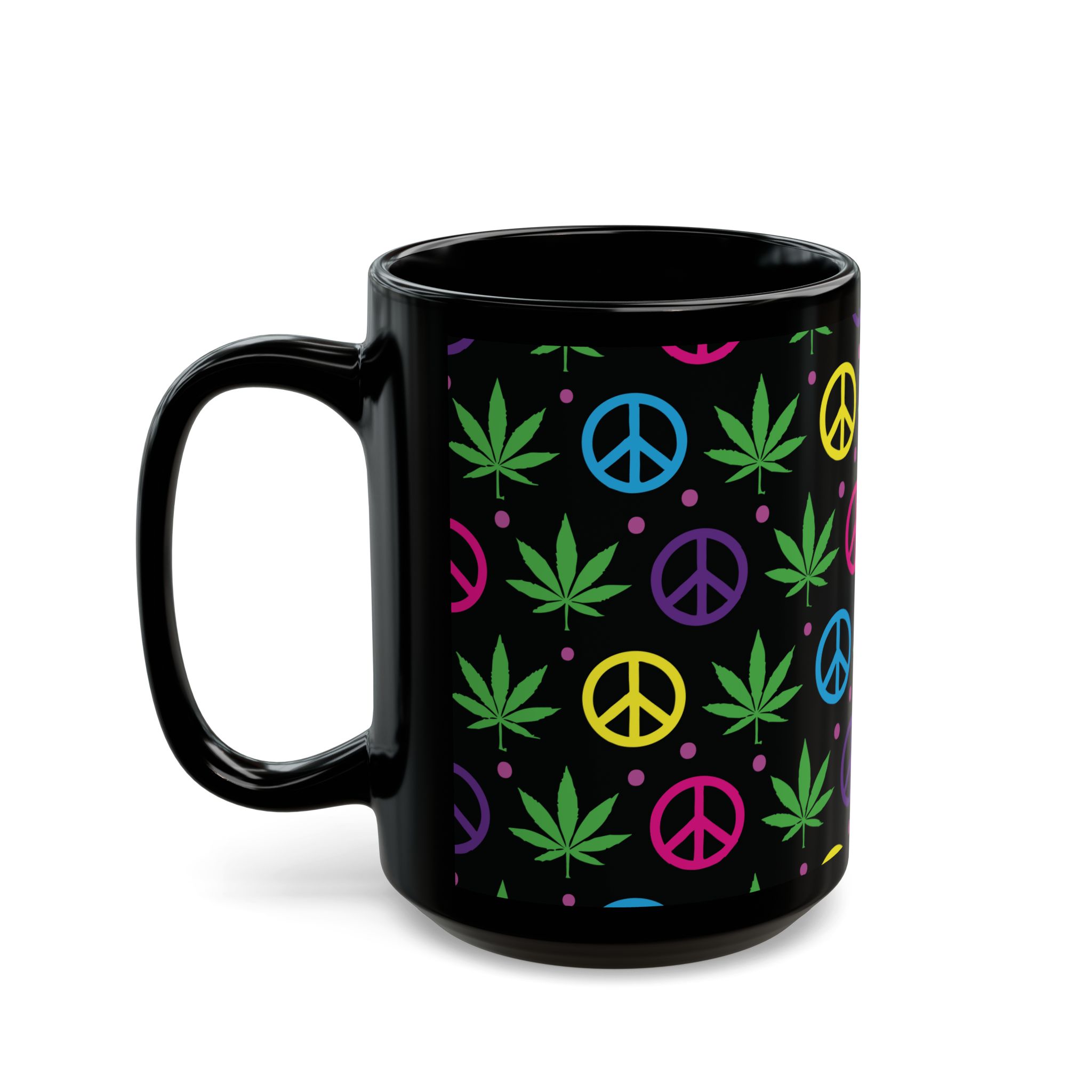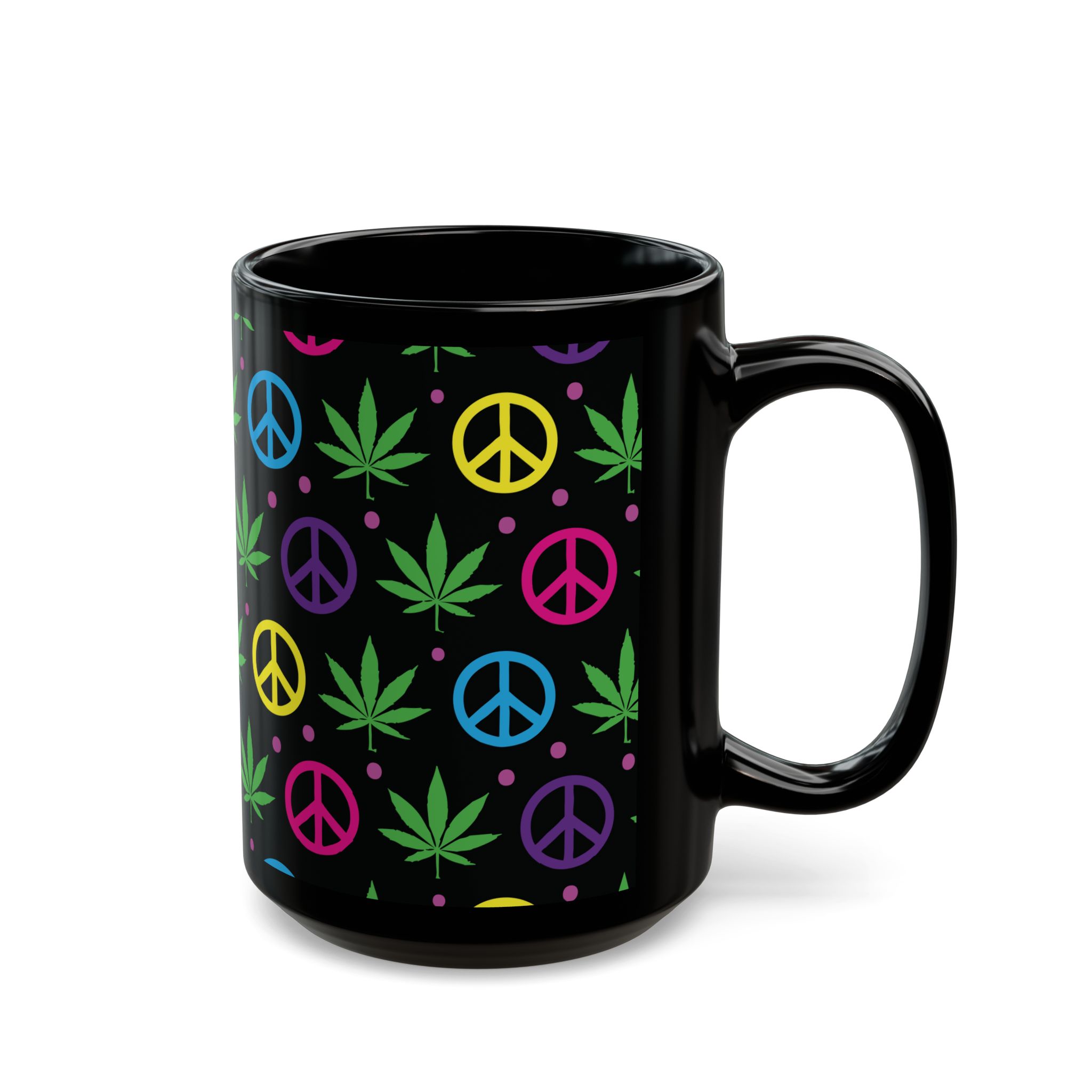 Sip in style with this black ceramic mug featuring colorful peace signs and pot leaves. Perfect for coffee, tea, or your favorite beverage, it adds a fun, laid-back vibe to your kitchen or workspace. Ideal for any relaxed occasion!