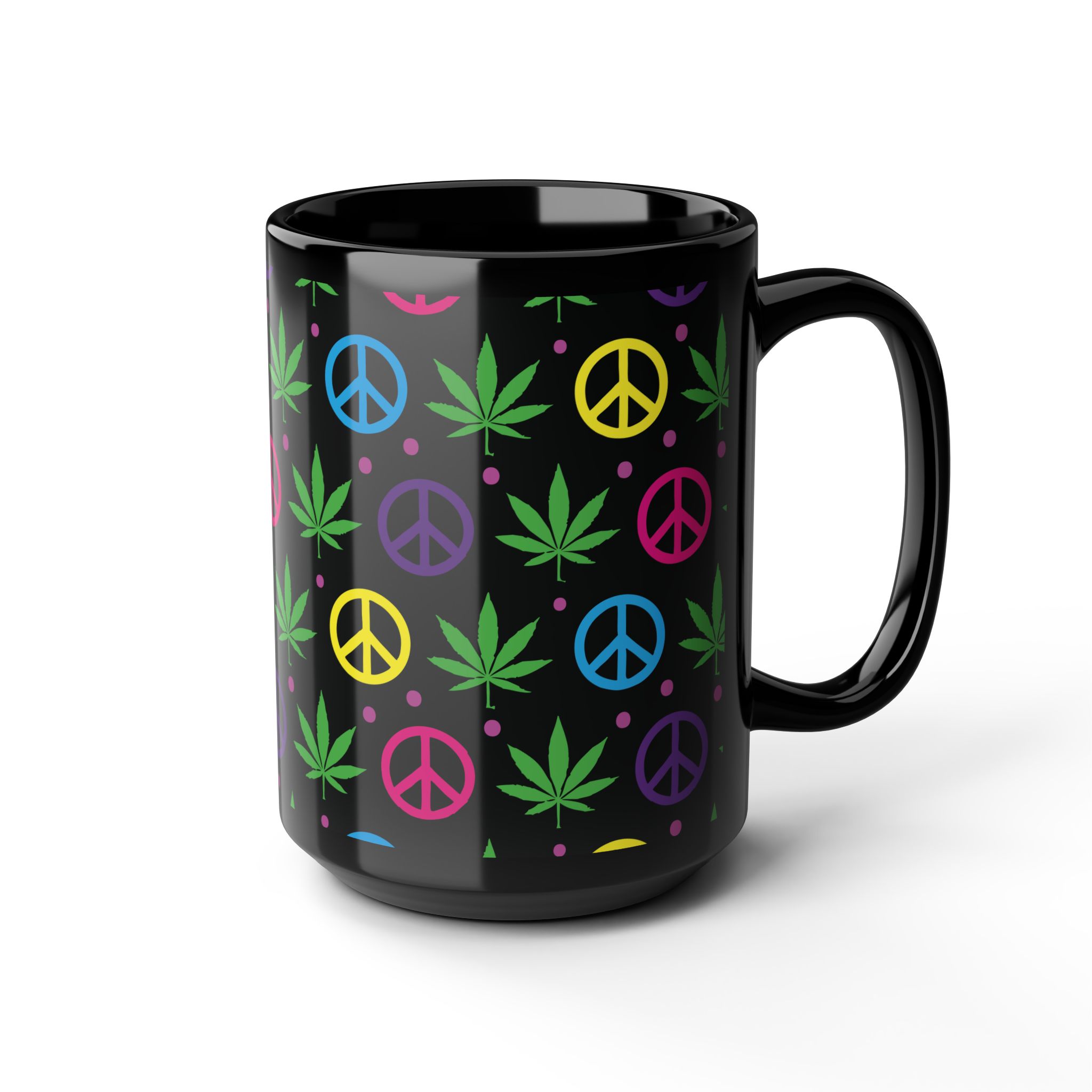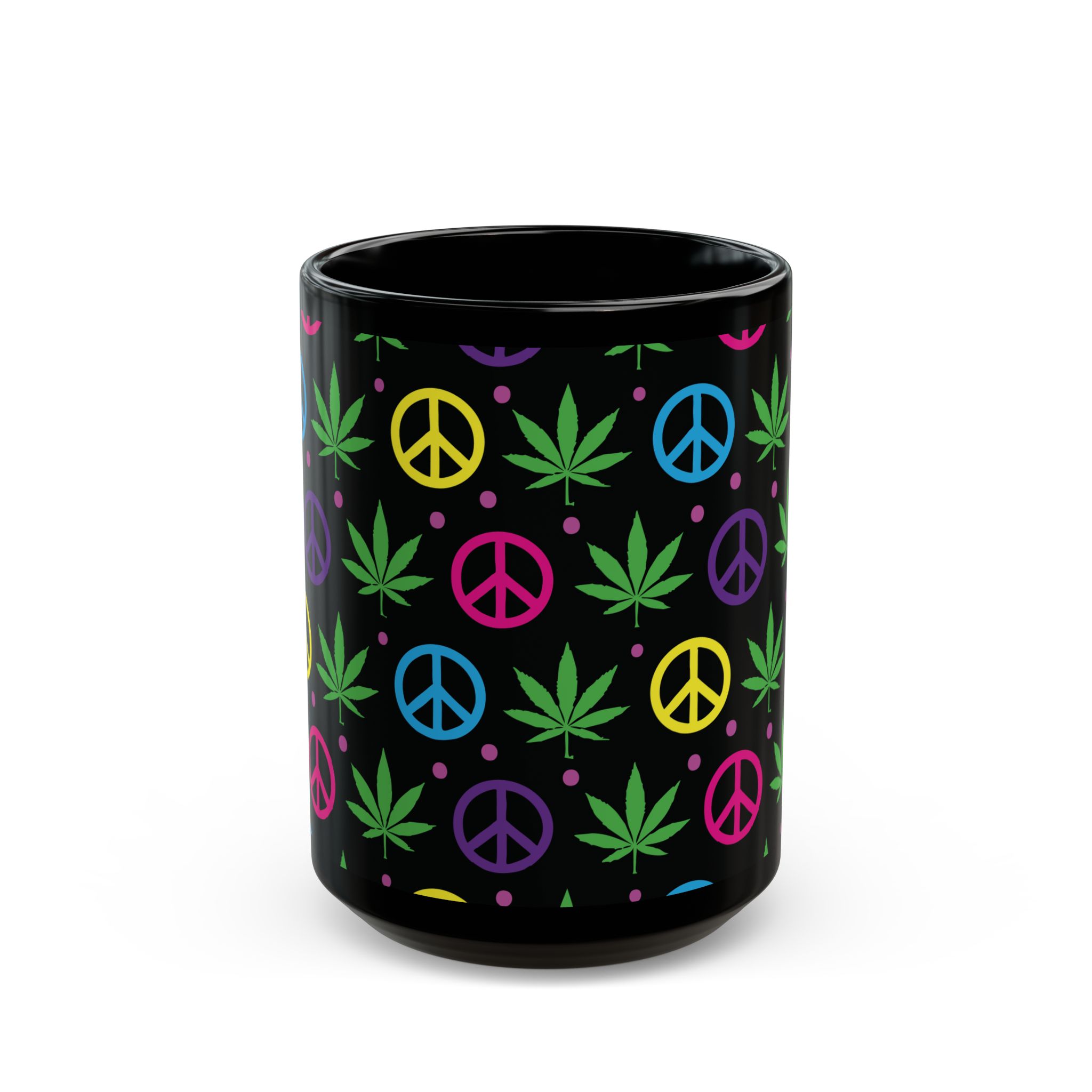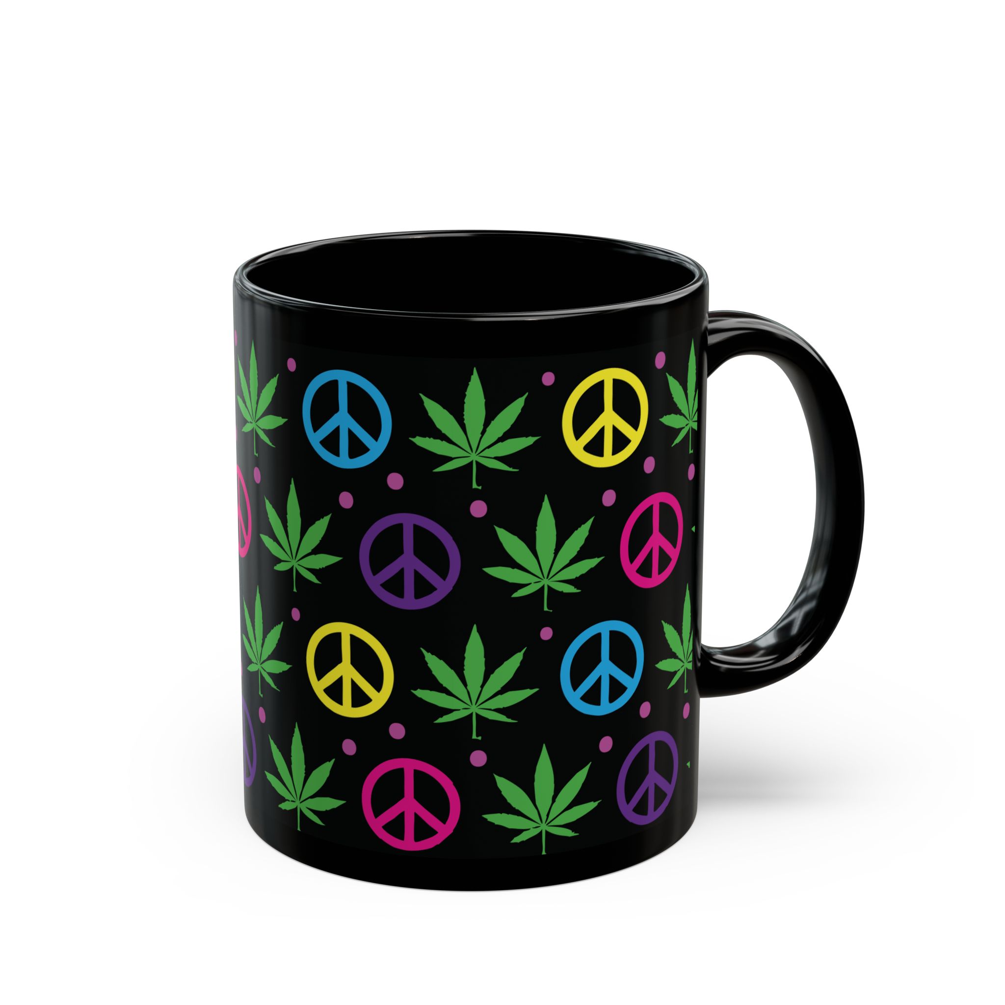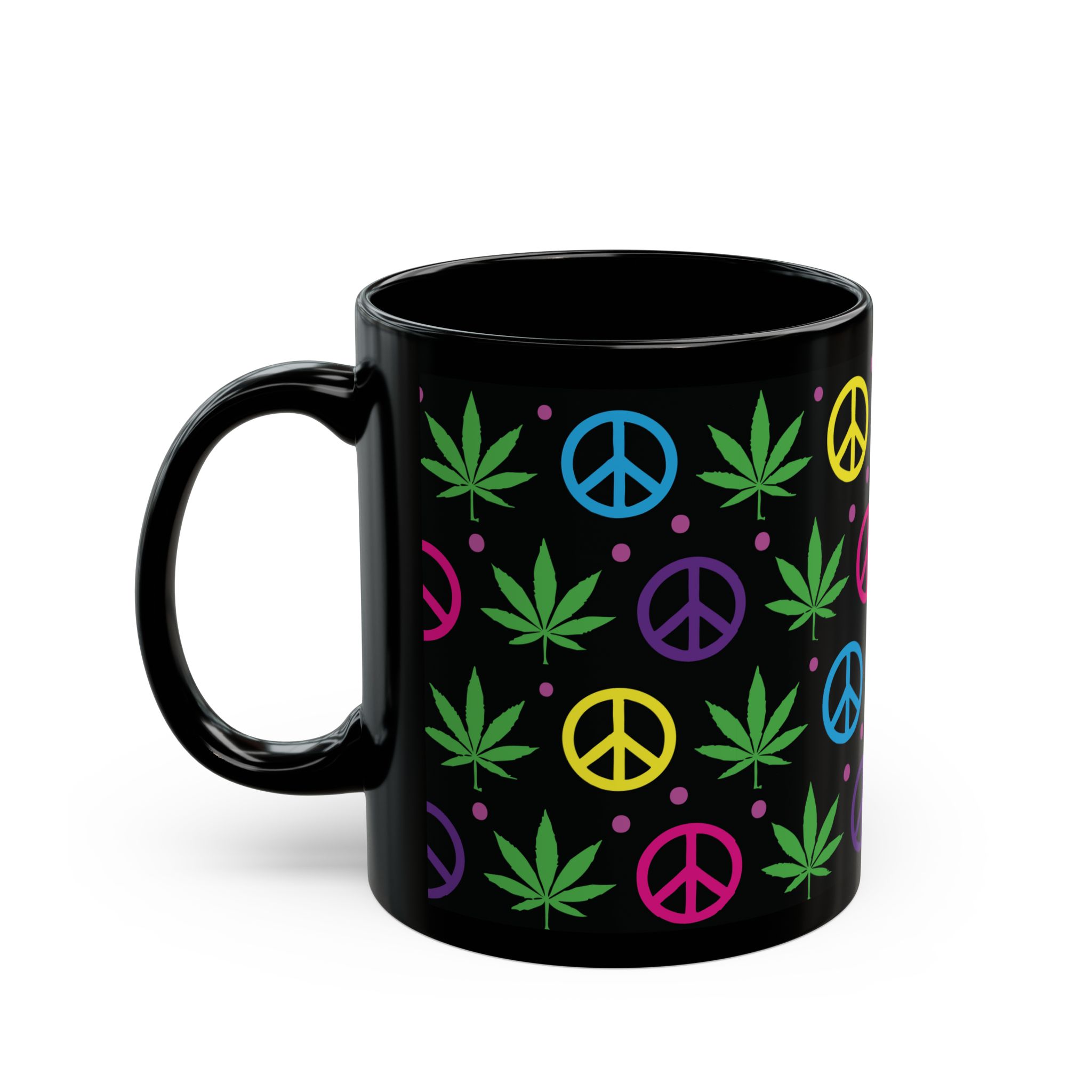 Sip in style with this black ceramic mug featuring colorful peace signs and pot leaves. Perfect for coffee, tea, or your favorite beverage, it adds a fun, laid-back vibe to your kitchen or workspace. Ideal for any relaxed occasion!