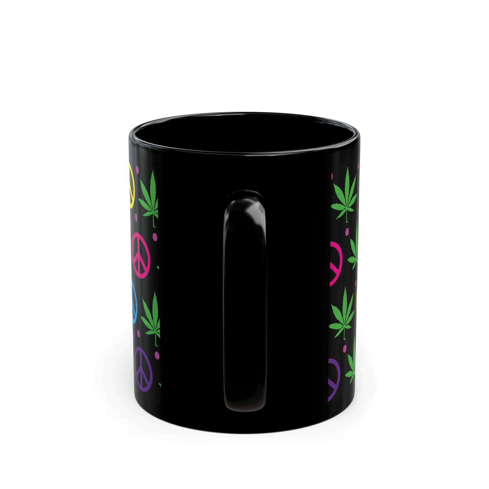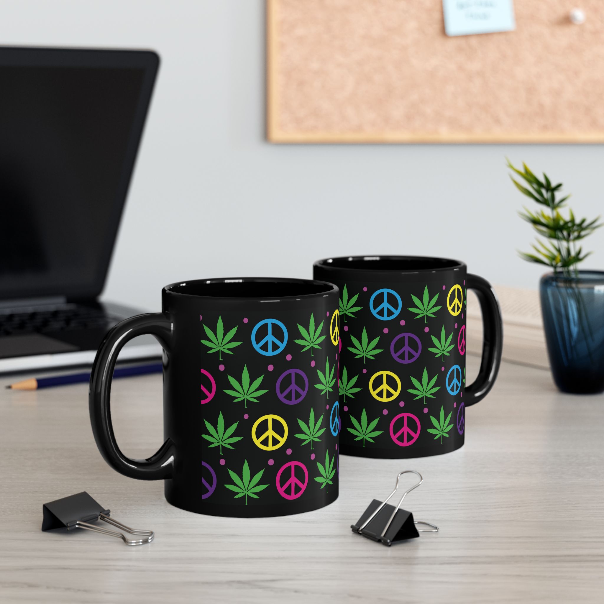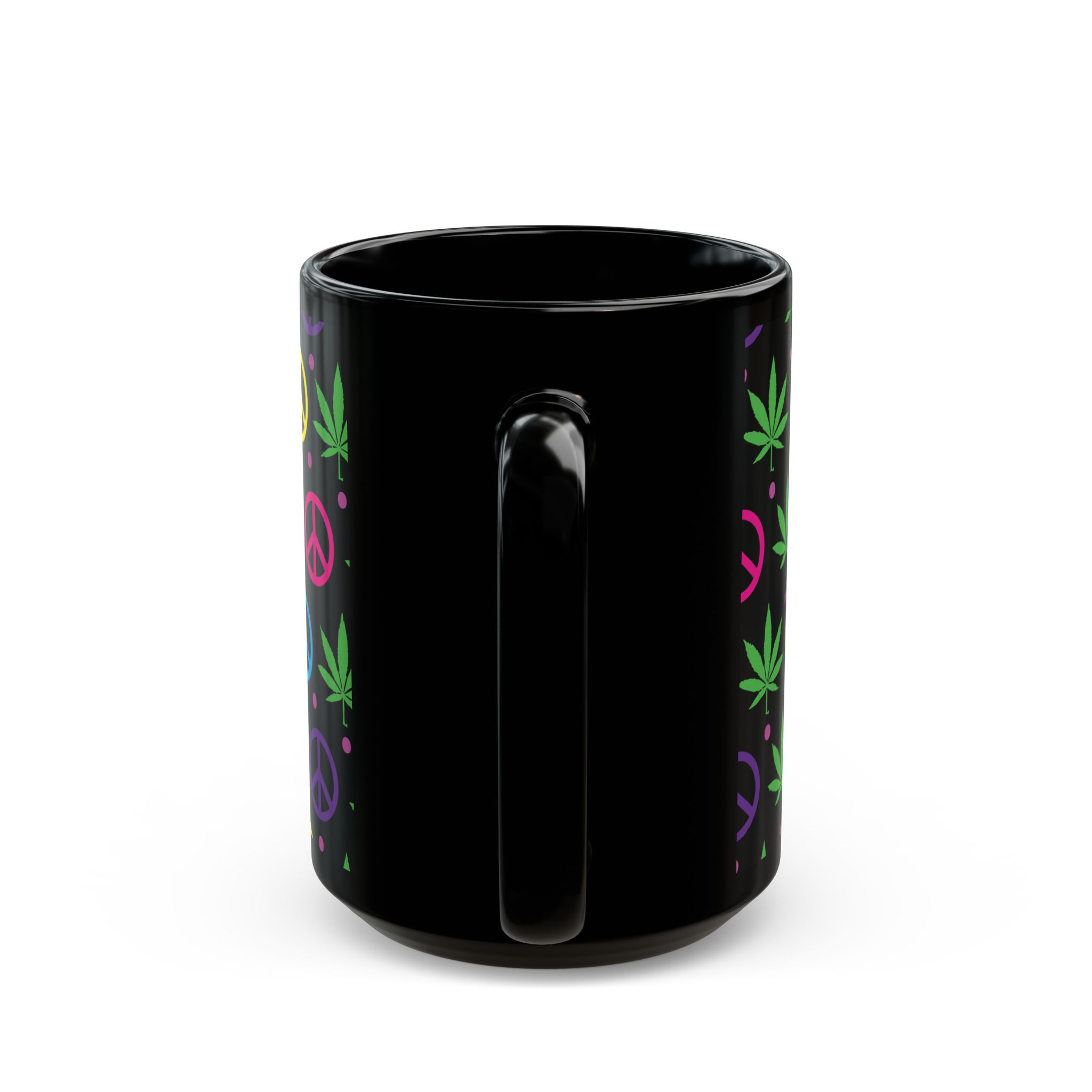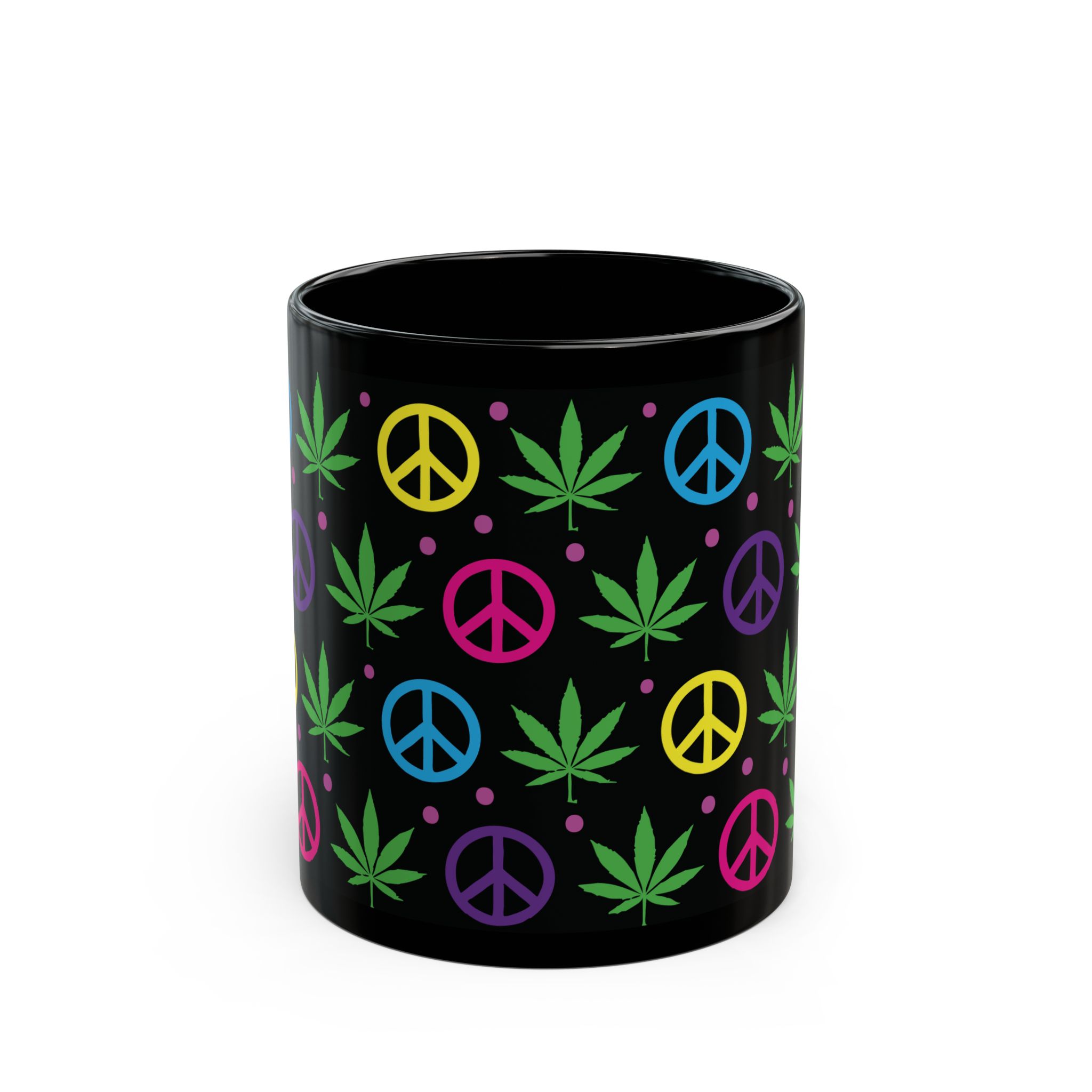 Sip in style with this black ceramic mug featuring colorful peace signs and pot leaves. Perfect for coffee, tea, or your favorite beverage, it adds a fun, laid-back vibe to your kitchen or workspace. Ideal for any relaxed occasion!