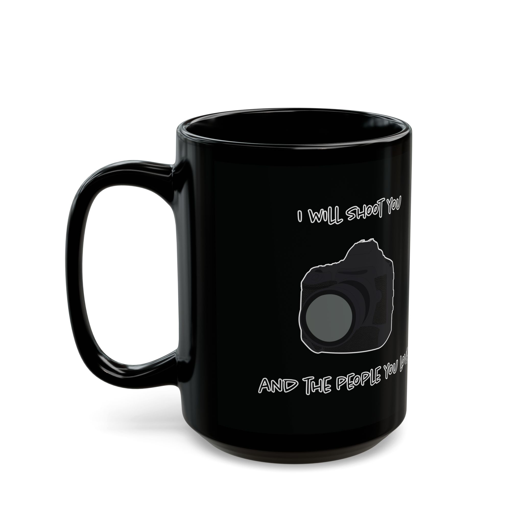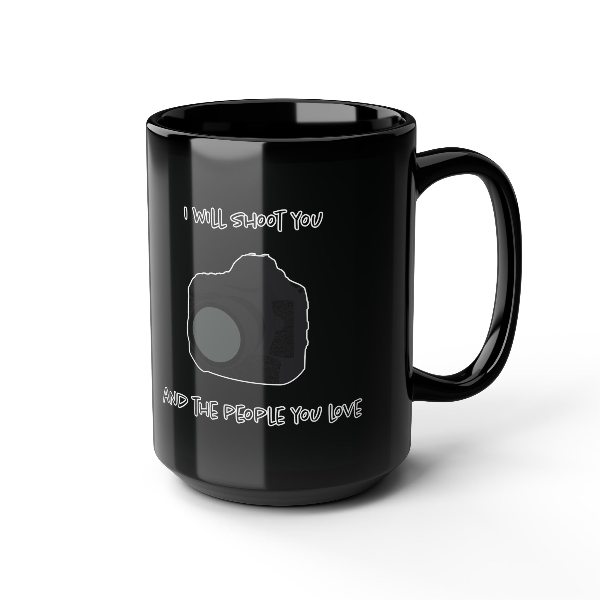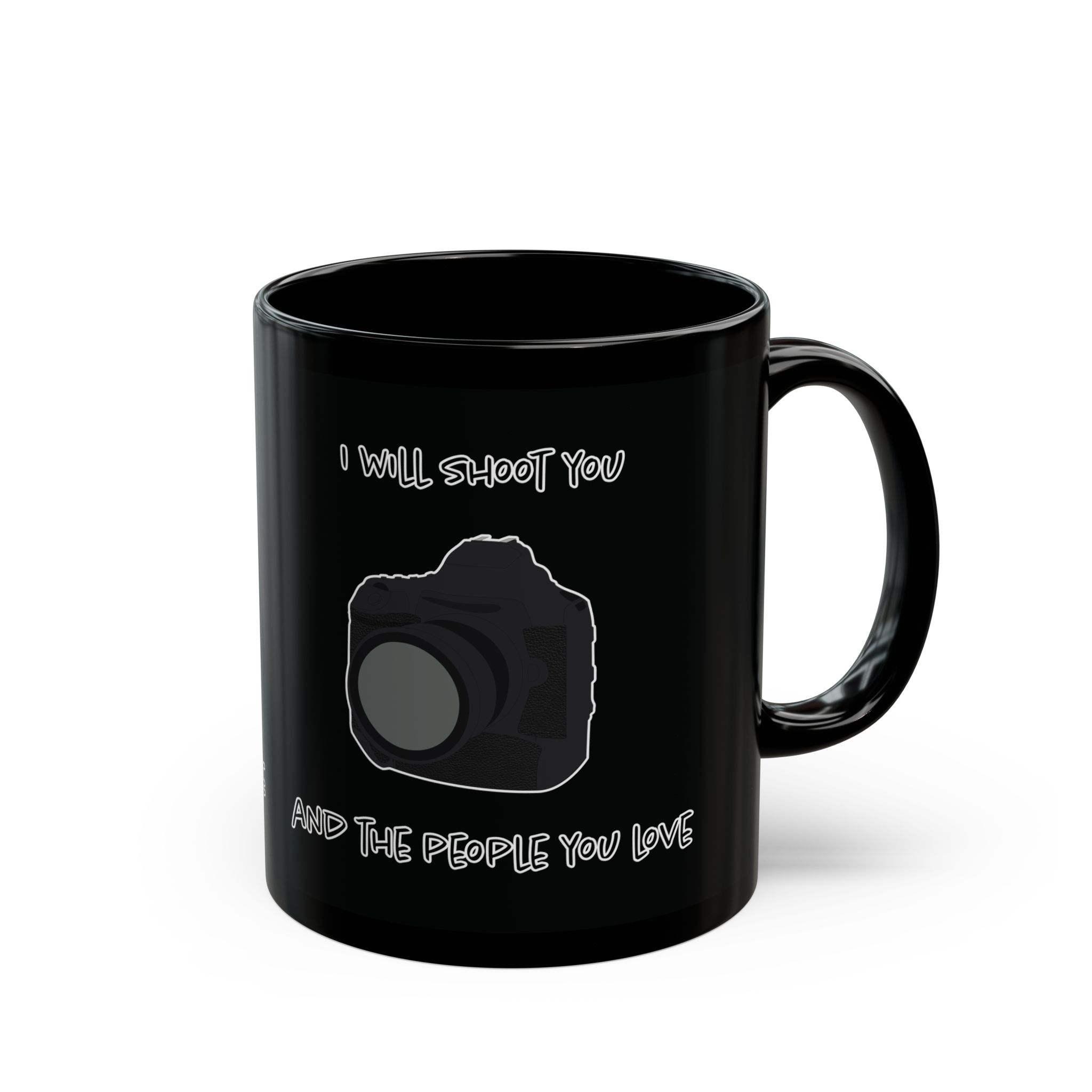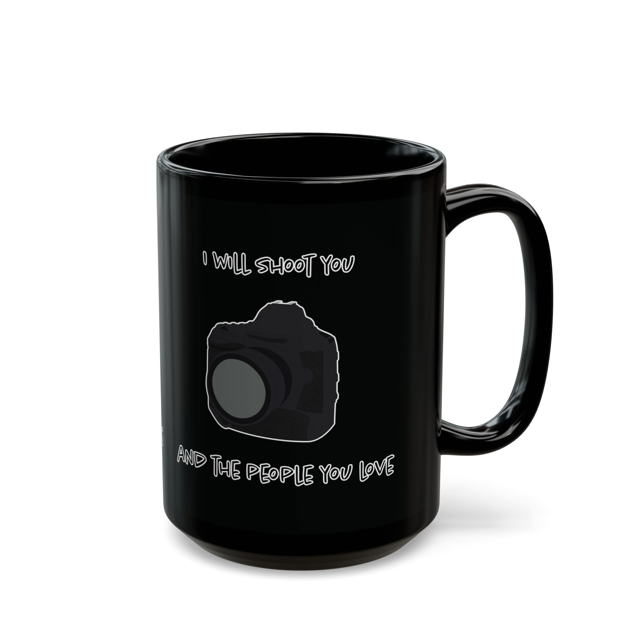 Black mug featuring a modern DSLR camera and the phrase 'I Will Shoot You and the People You Love.' Perfect for photographers with a sense of humor. A fun, unique gift for coffee lovers and camera enthusiasts alike.