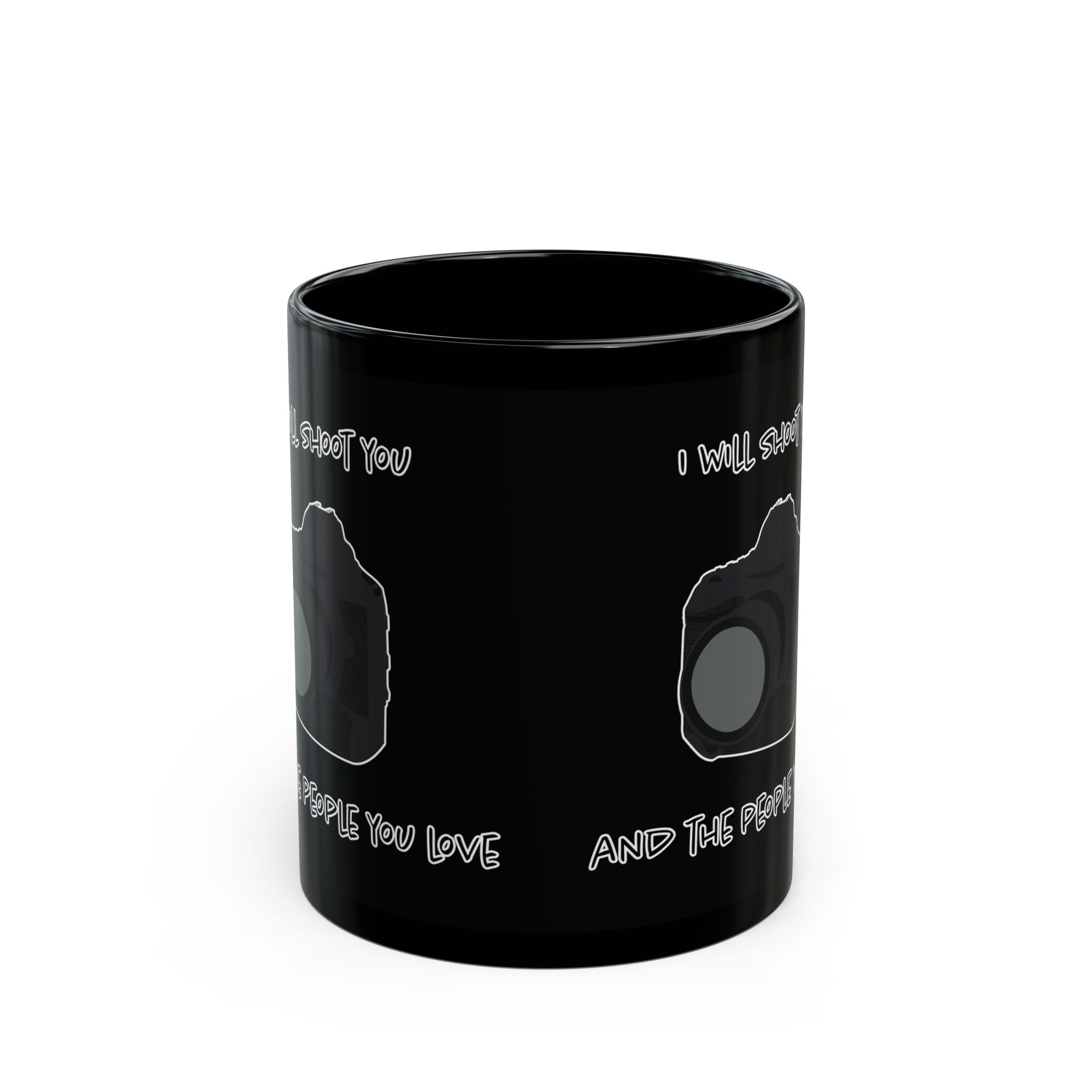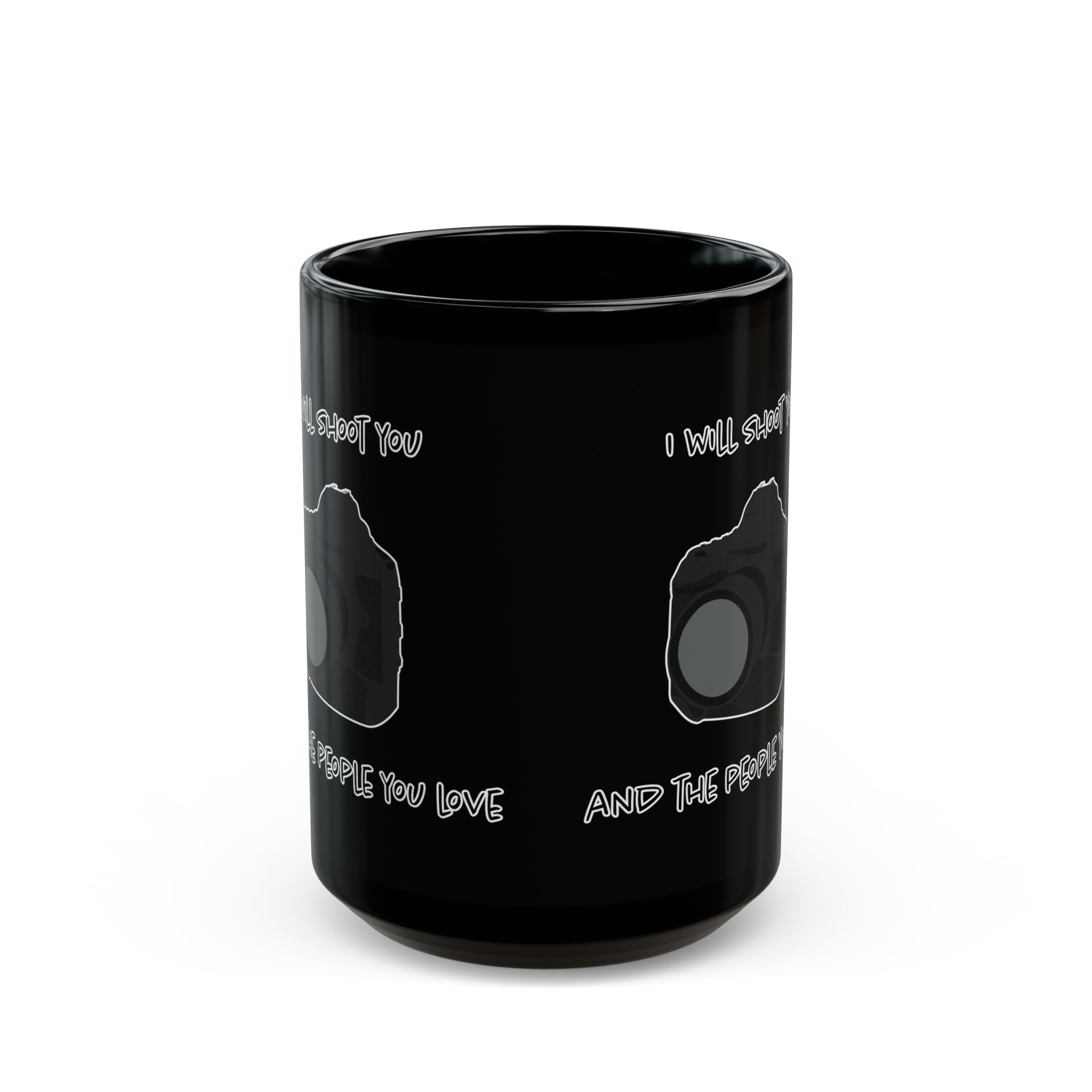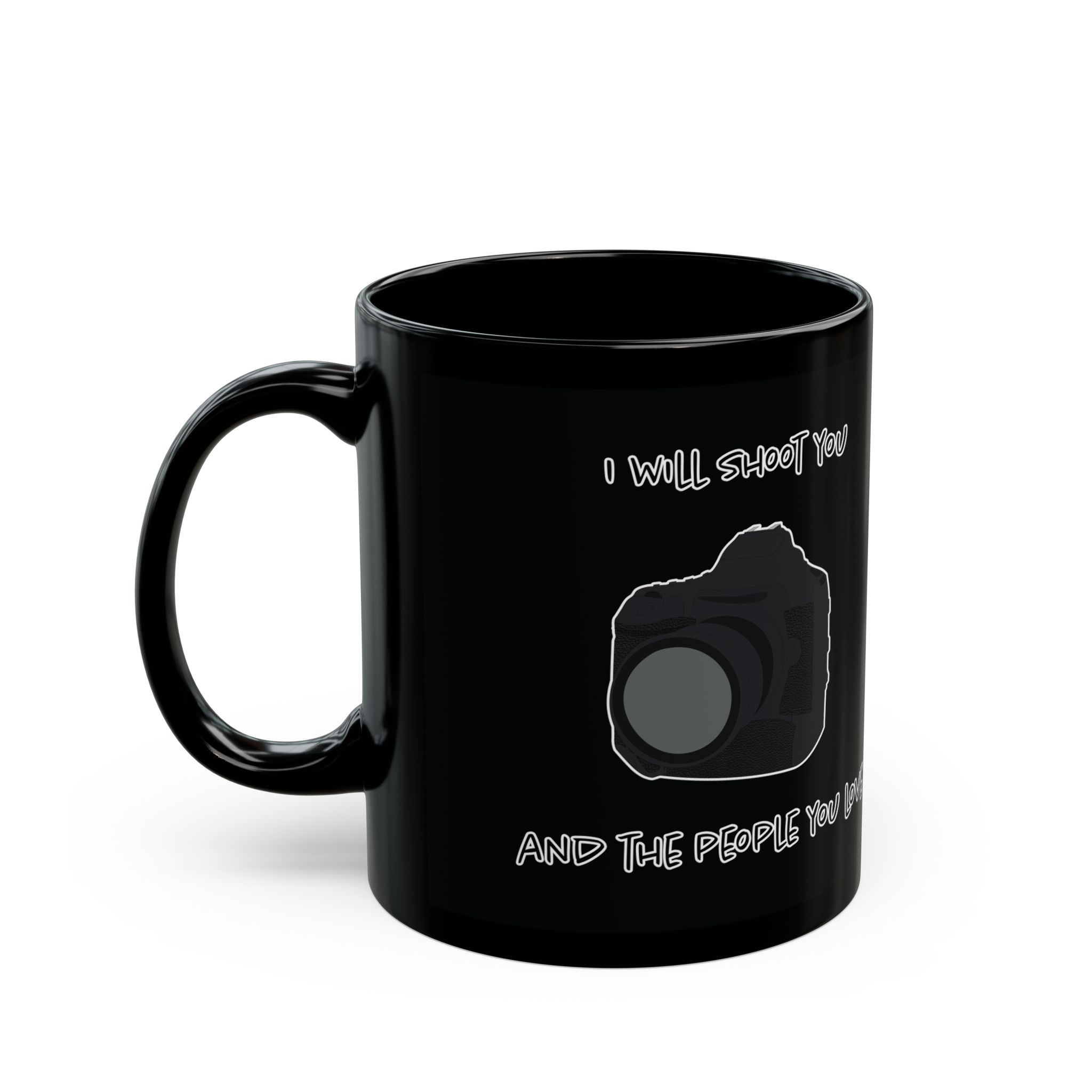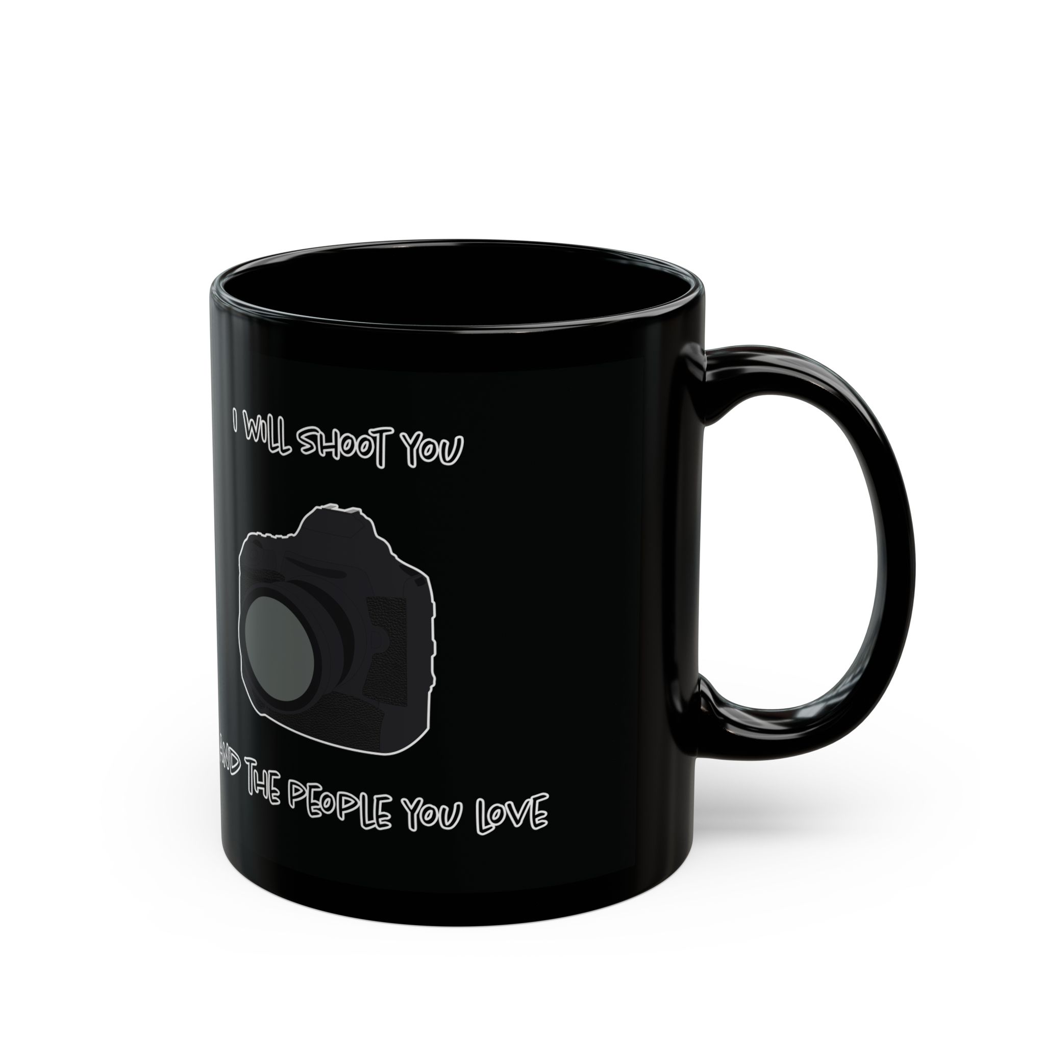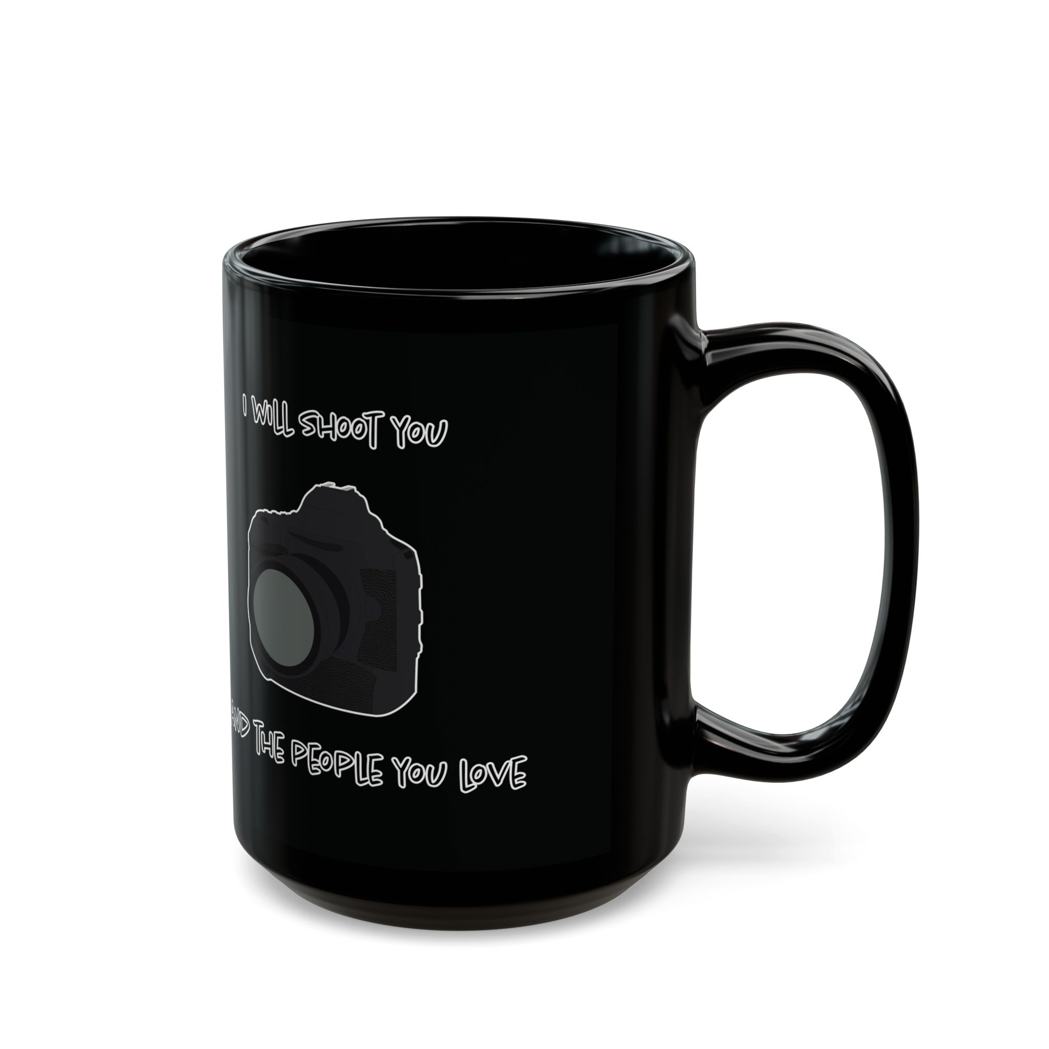 Black mug featuring a modern DSLR camera and the phrase 'I Will Shoot You and the People You Love.' Perfect for photographers with a sense of humor. A fun, unique gift for coffee lovers and camera enthusiasts alike.