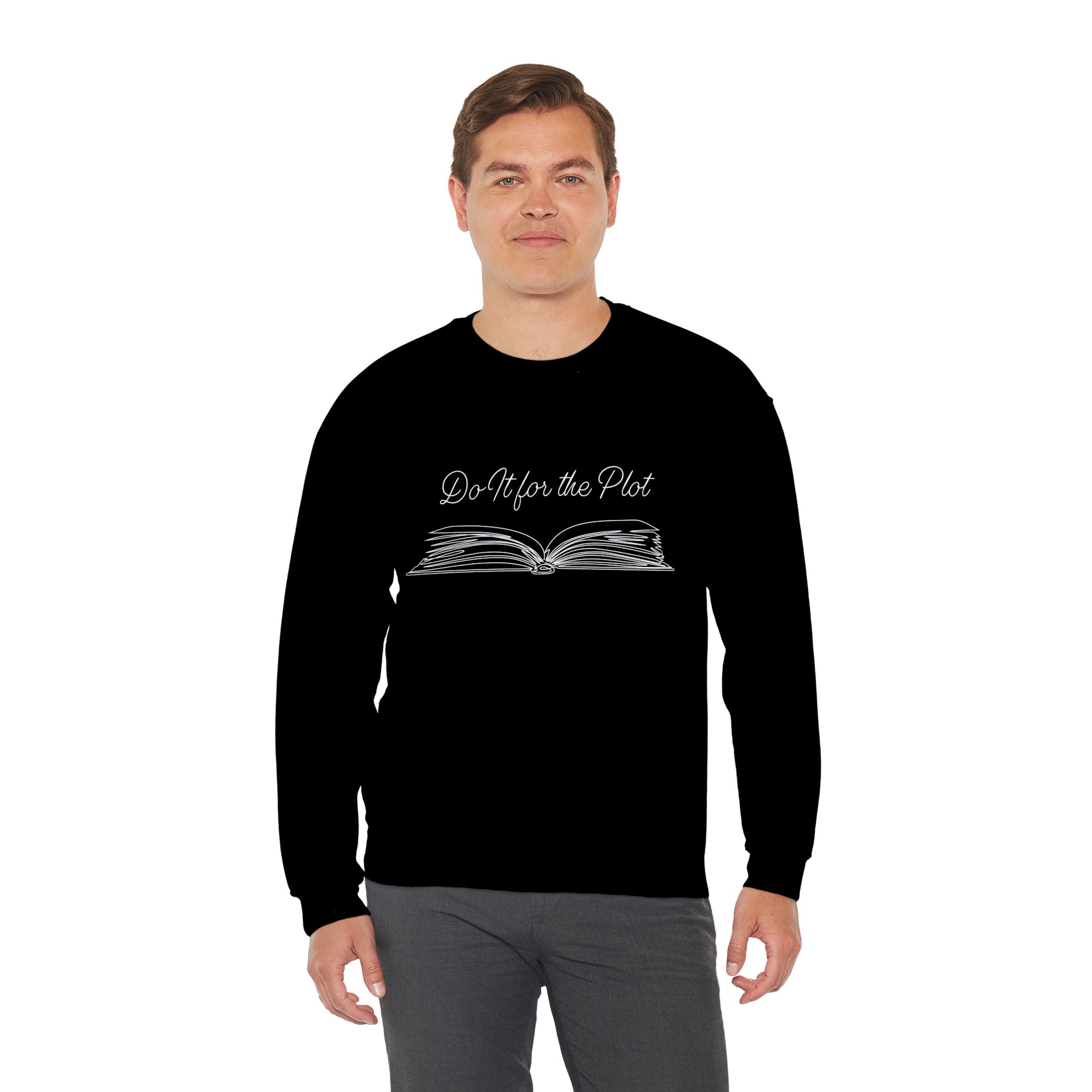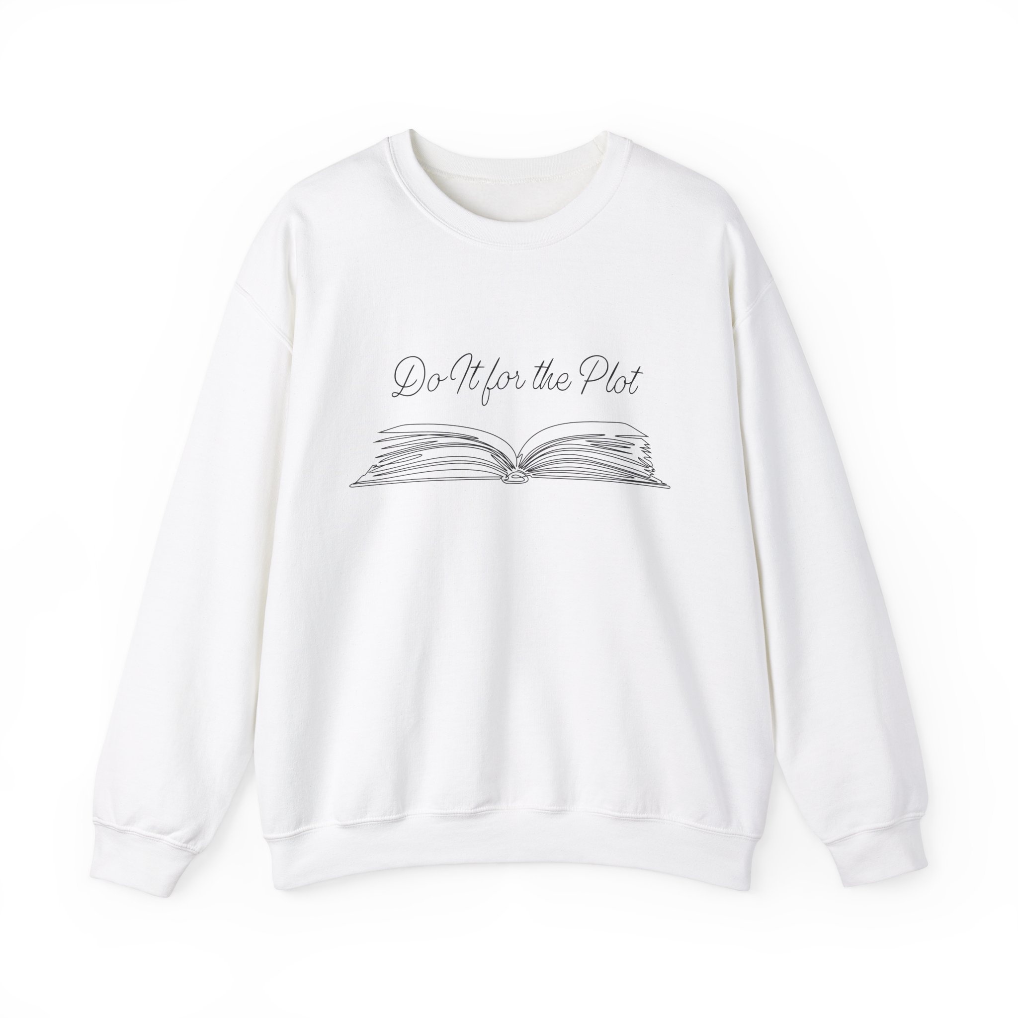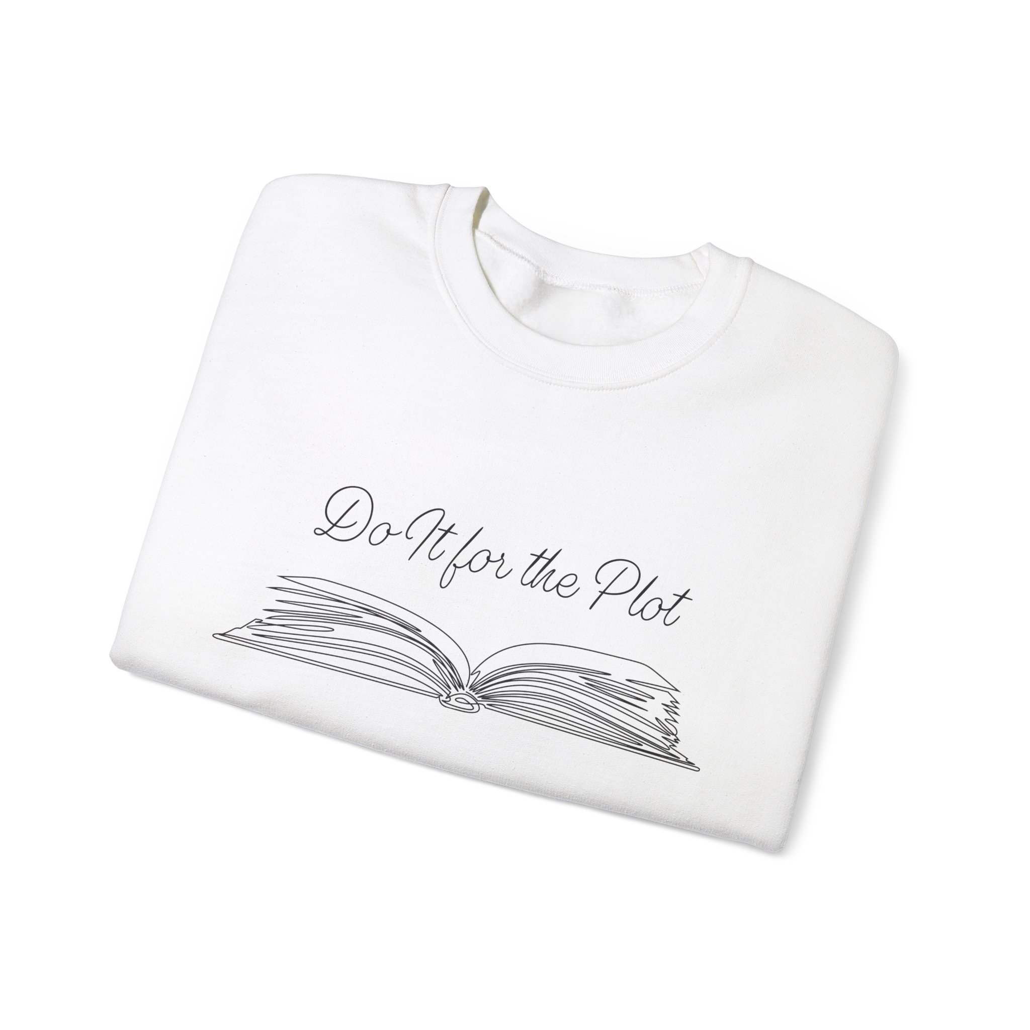 Cozy up in this soft sweatshirt featuring an open book and 'Do It for the Plot'—perfect for readers and storytellers chasing epic adventures.