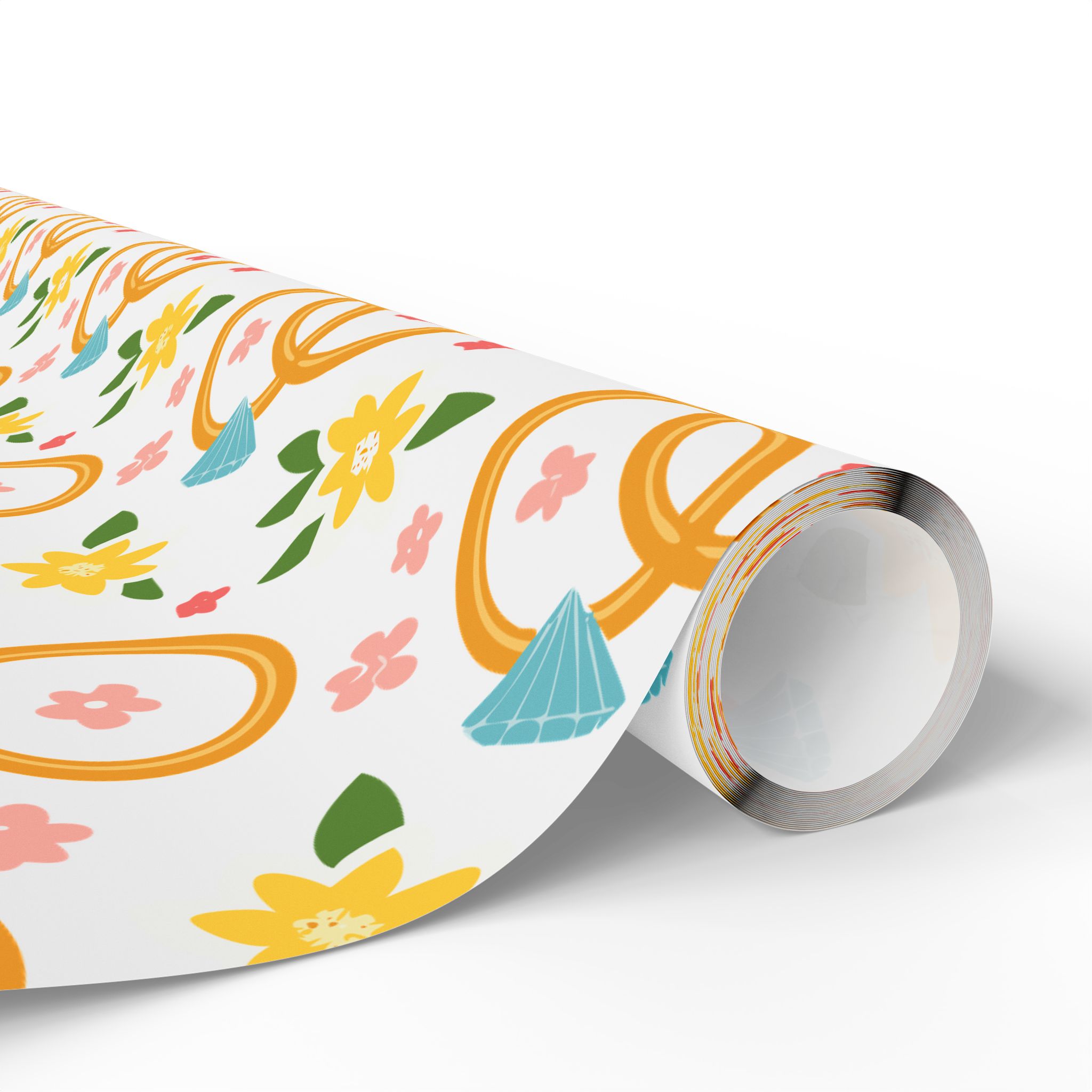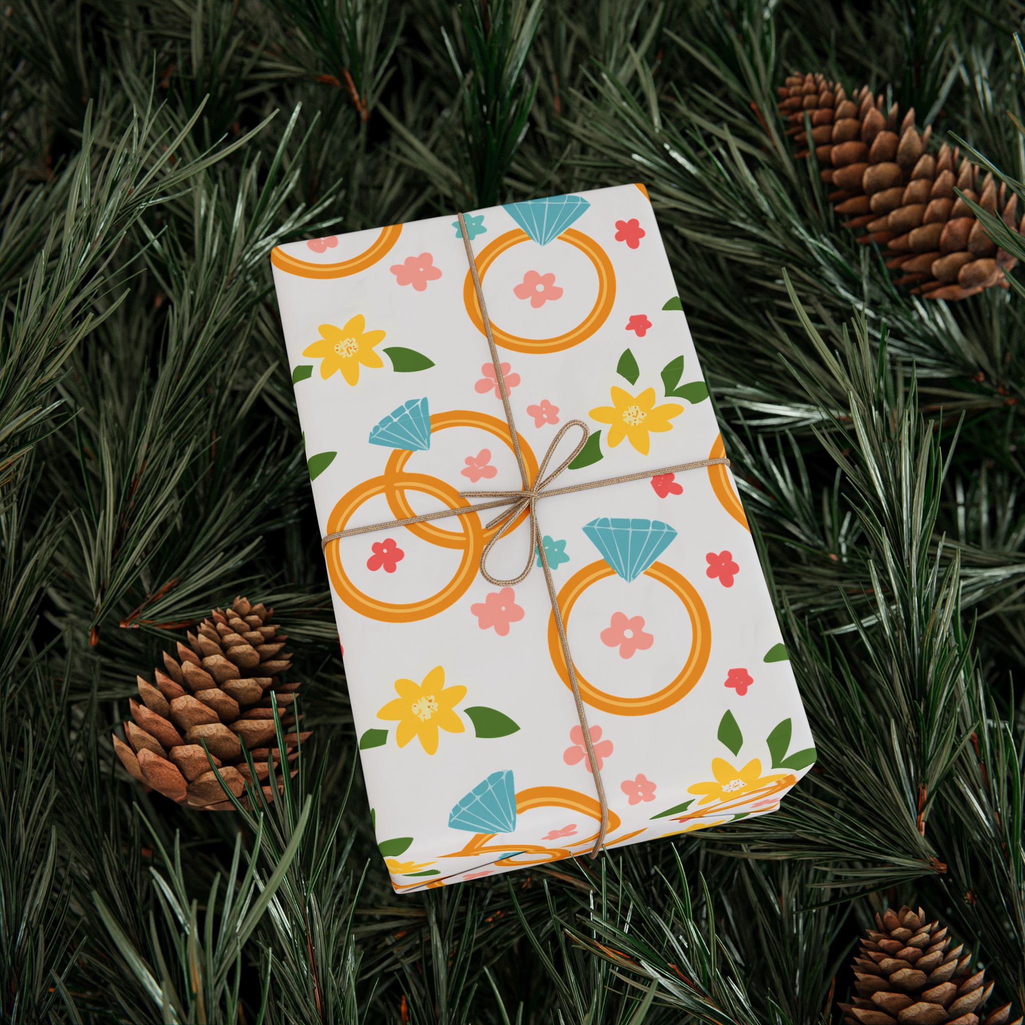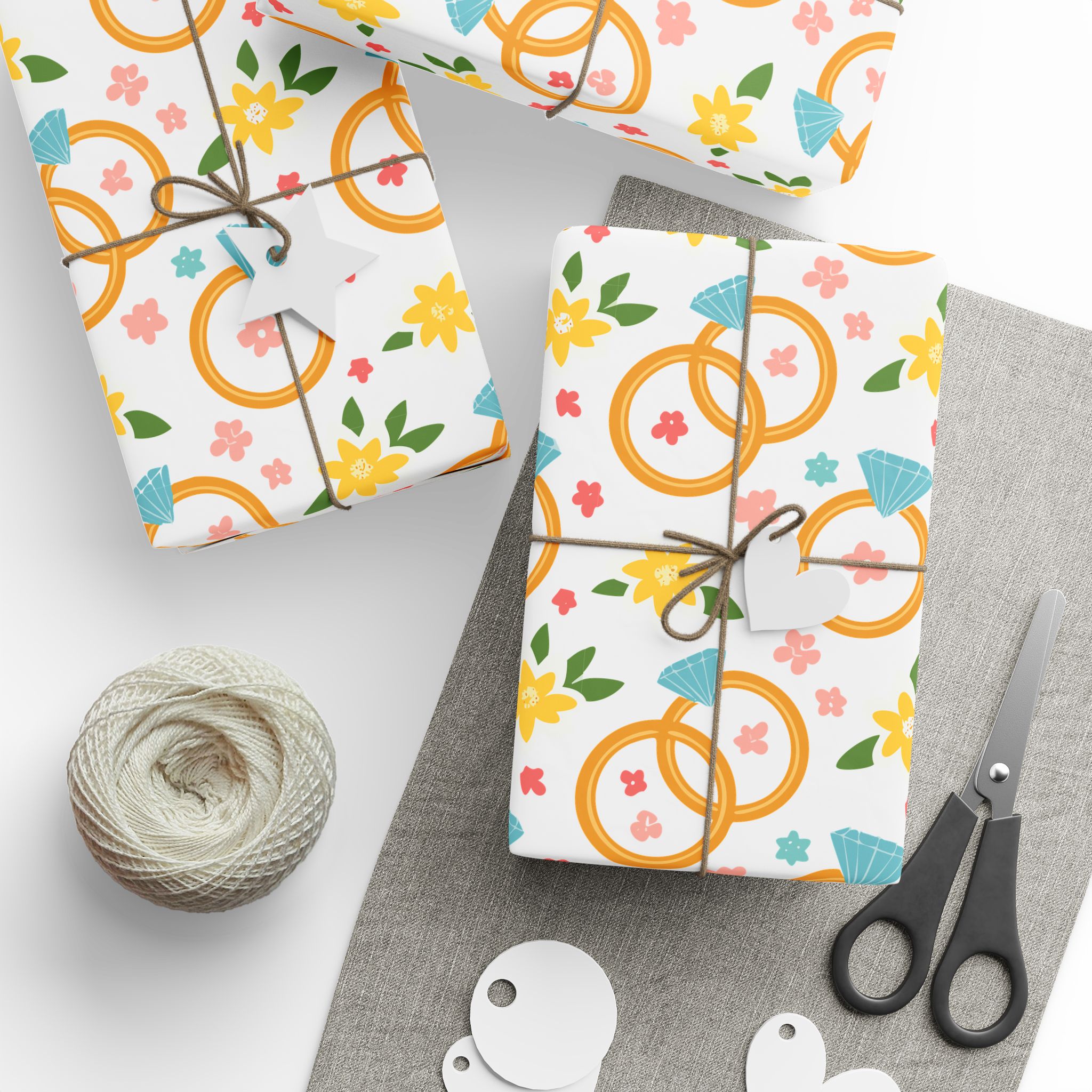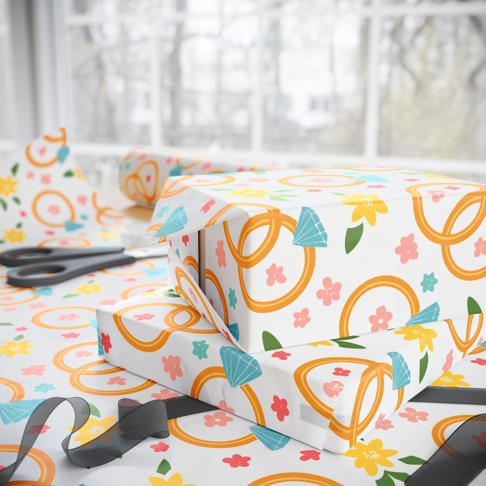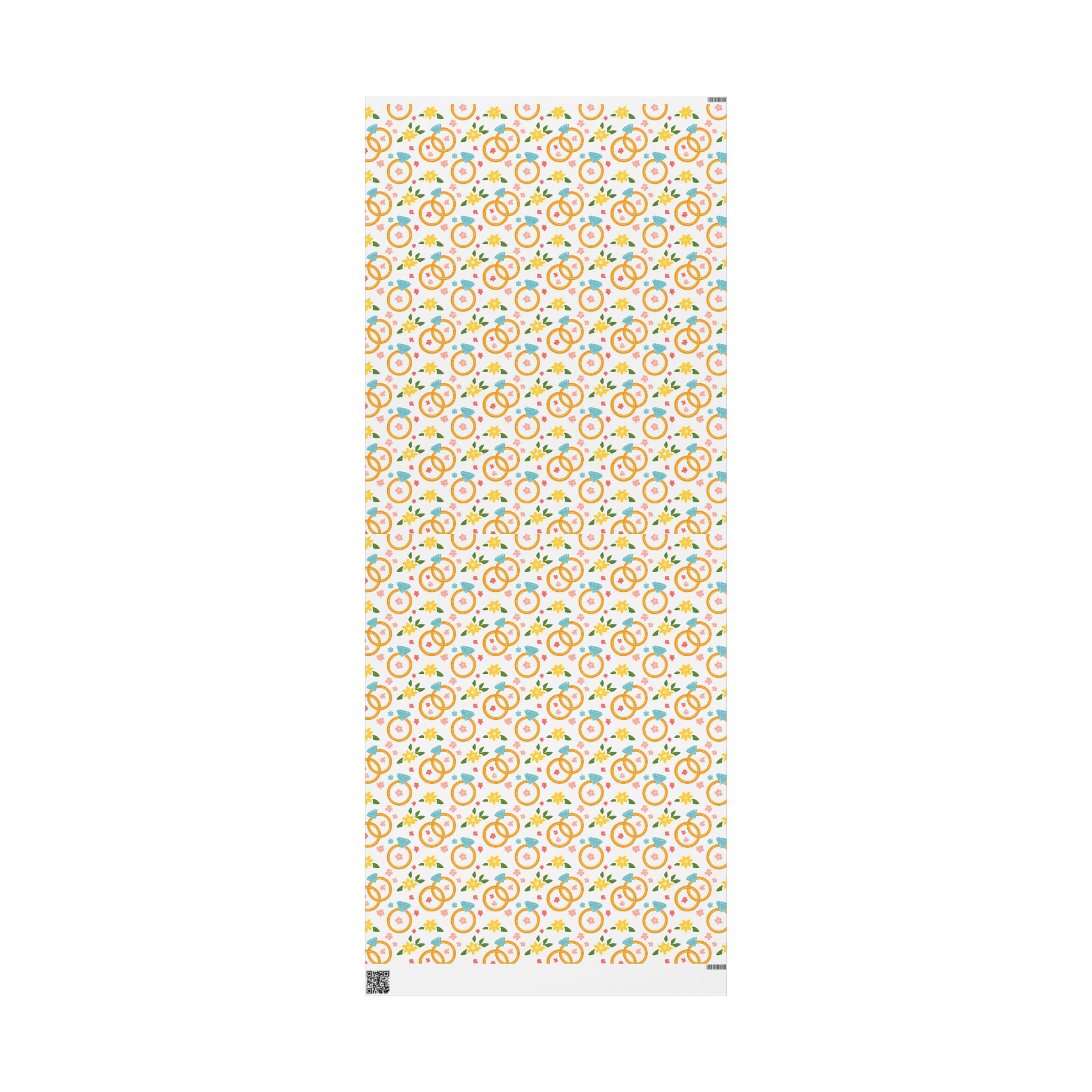 Celebrate love with our elegant wrapping paper, featuring wedding rings and delicate flowers on a crisp white background. Perfect for weddings, anniversaries, and bridal showers. Add a touch of romance to every gift!