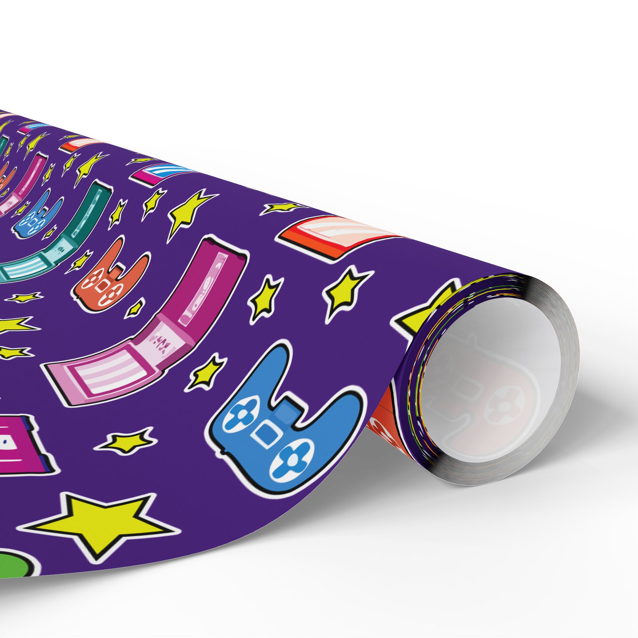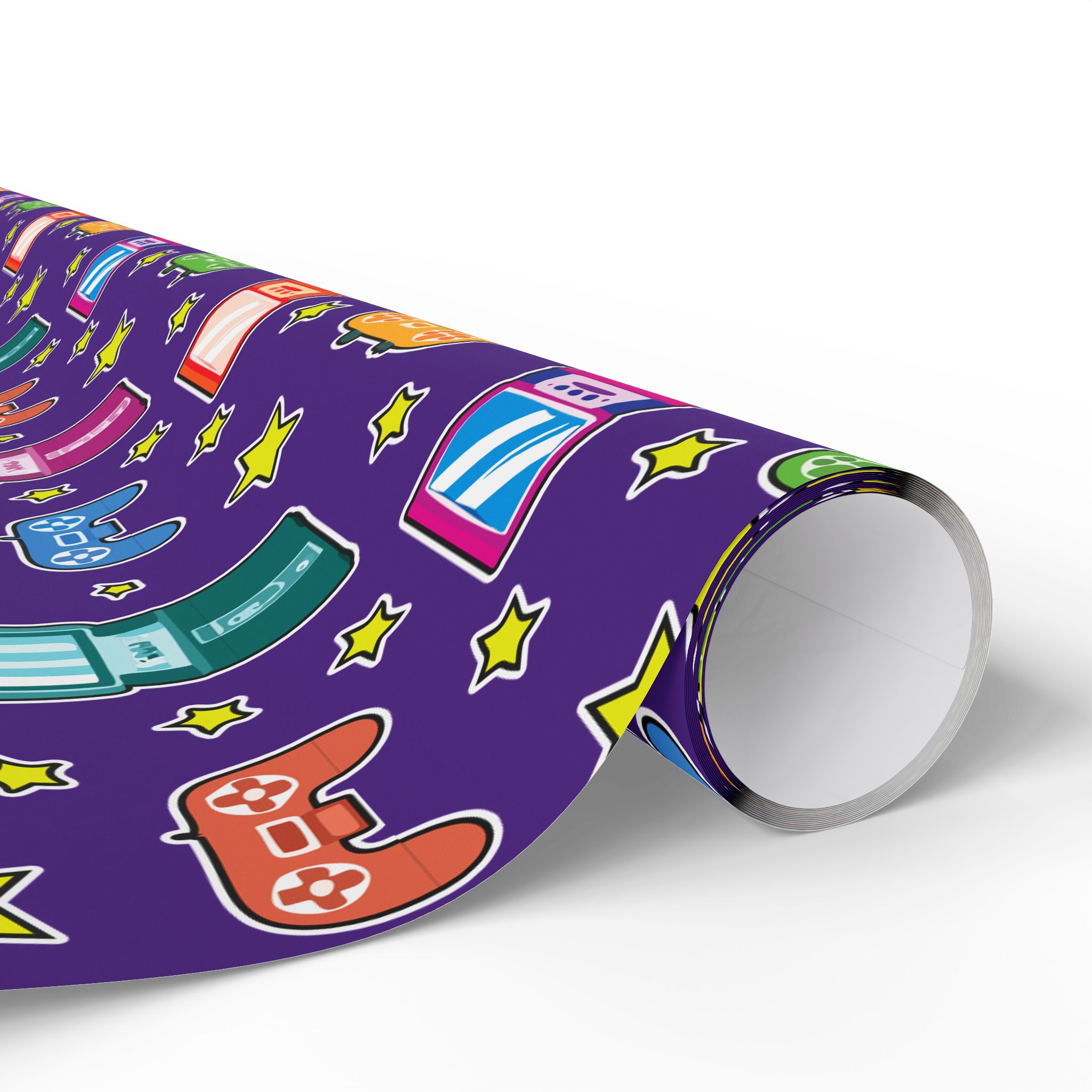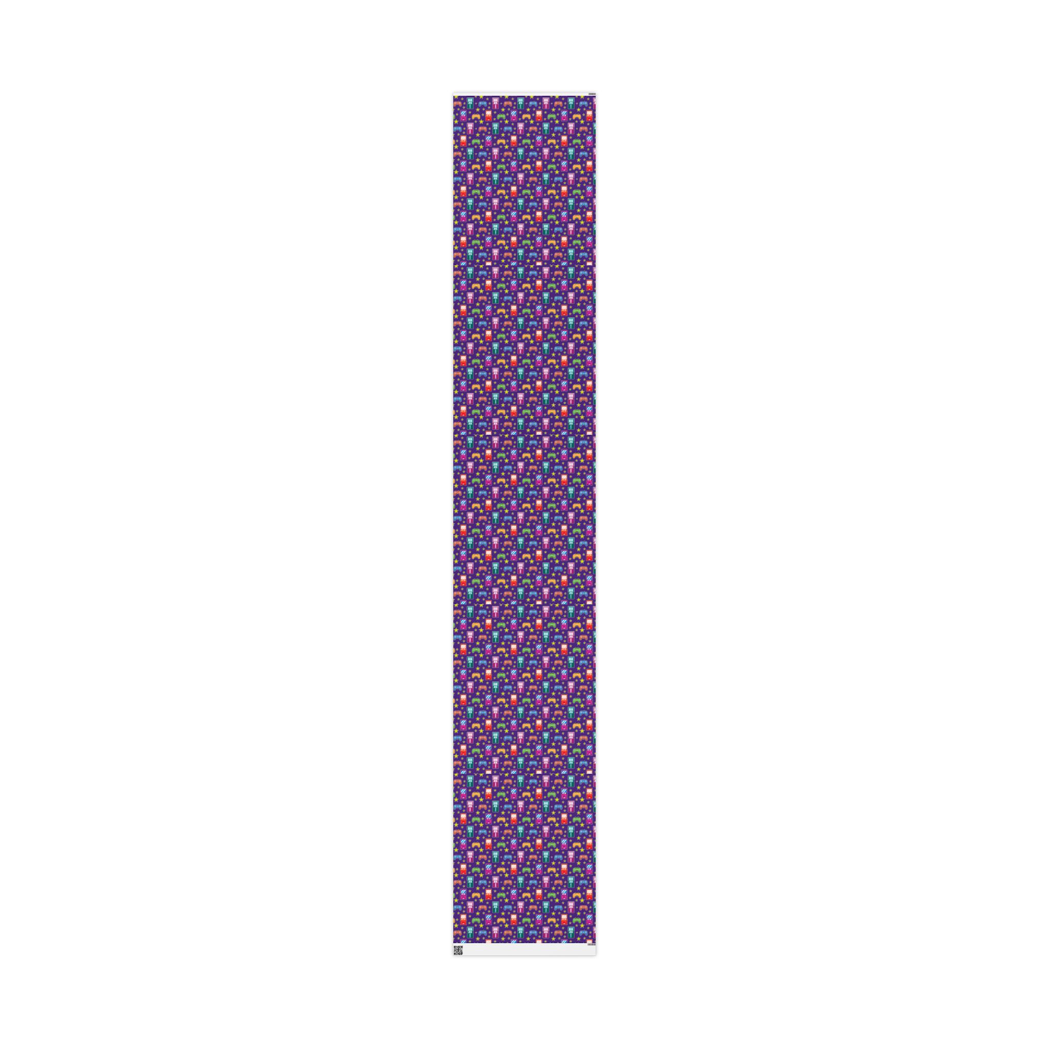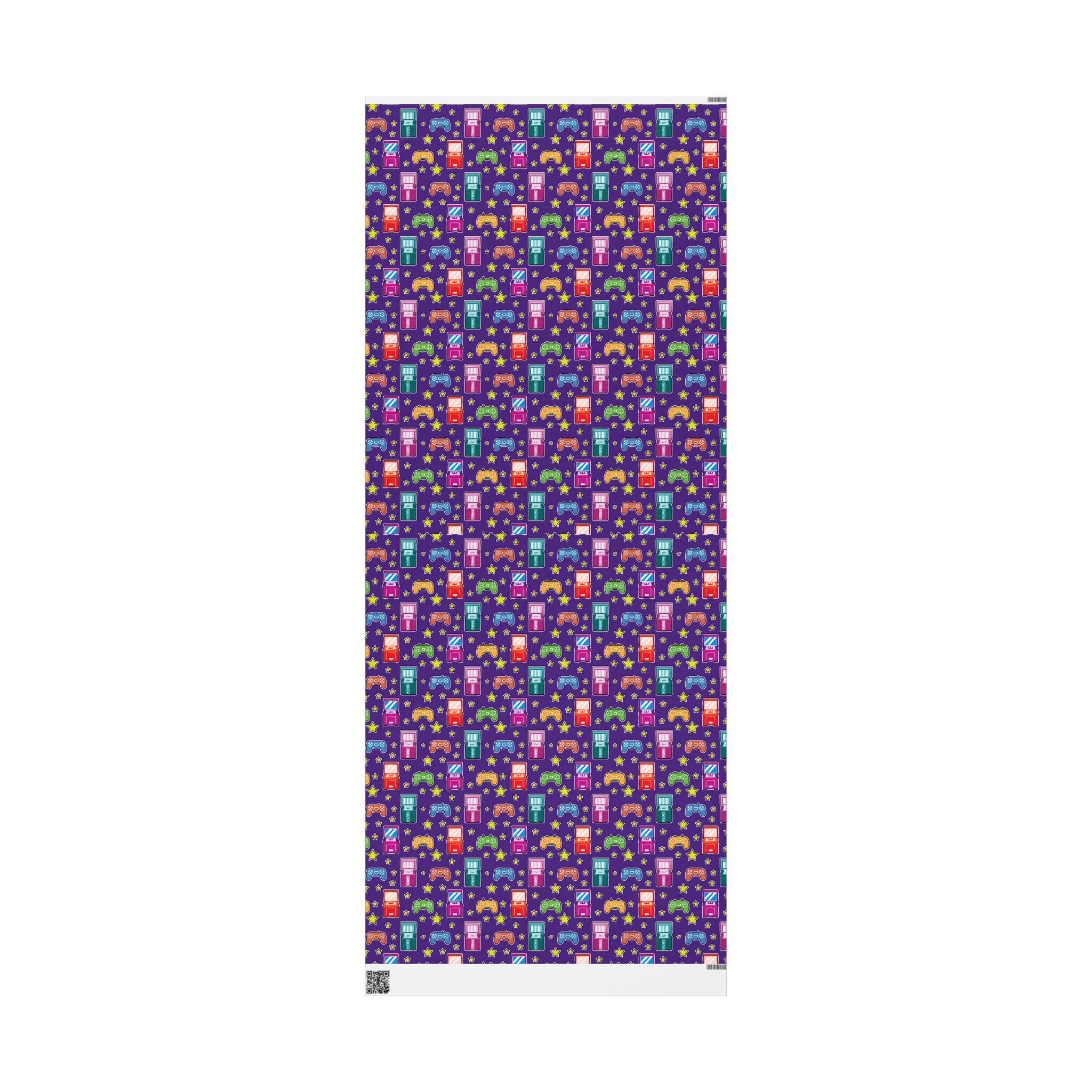 Wrapping paper featuring video game controllers and arcade machines on a bold purple background. Perfect for gamers and retro lovers. Add a playful touch to gifts for birthdays, holidays, or any special occasion.