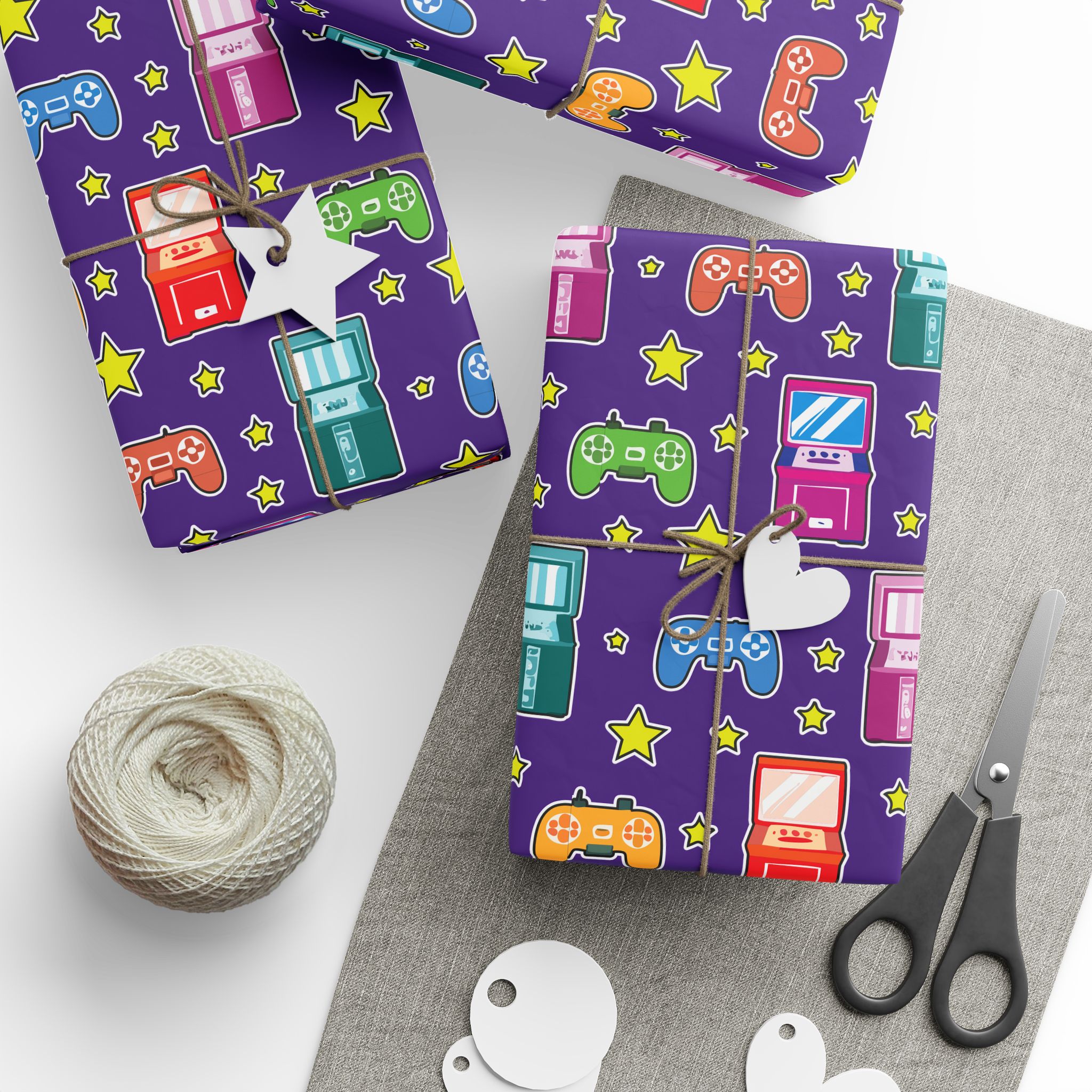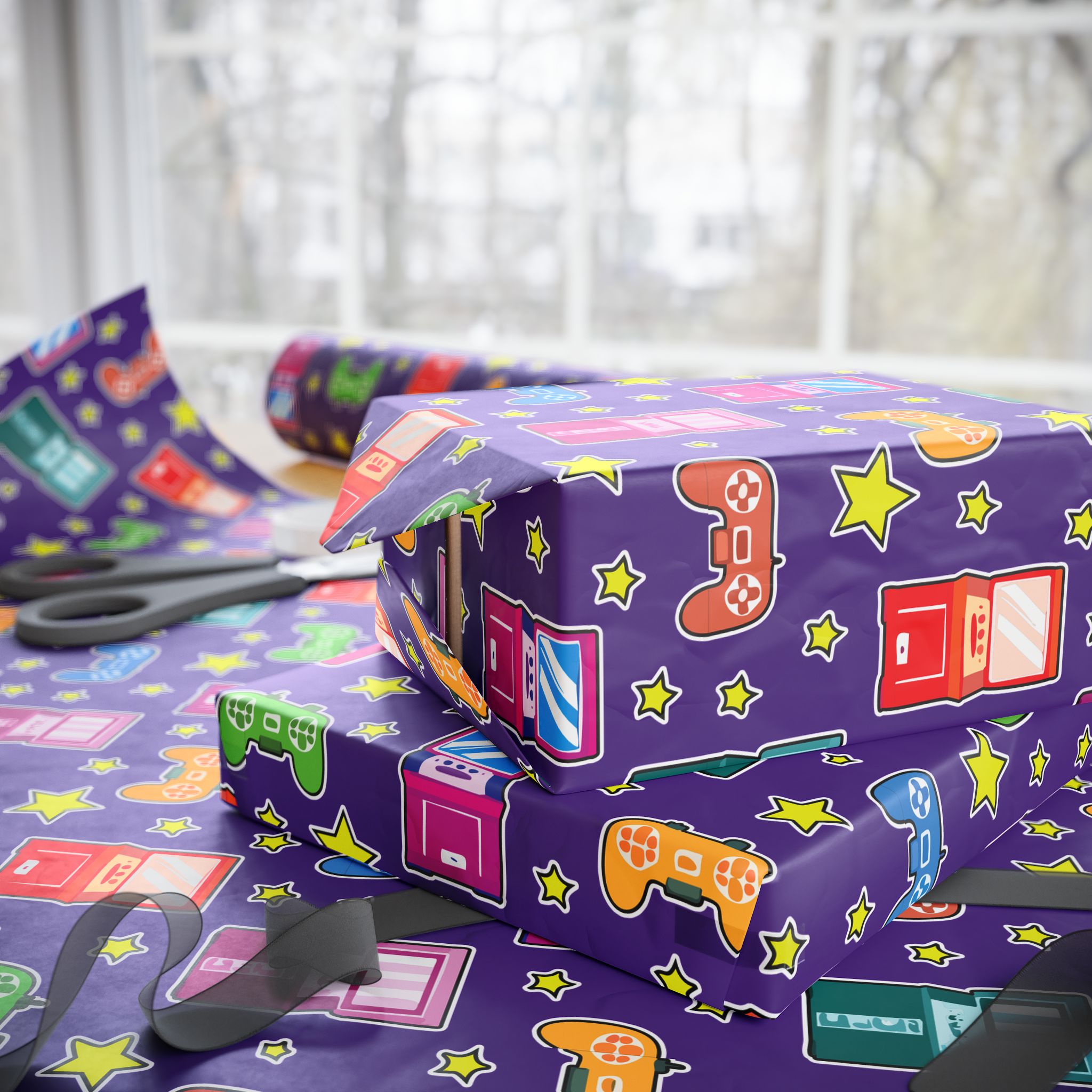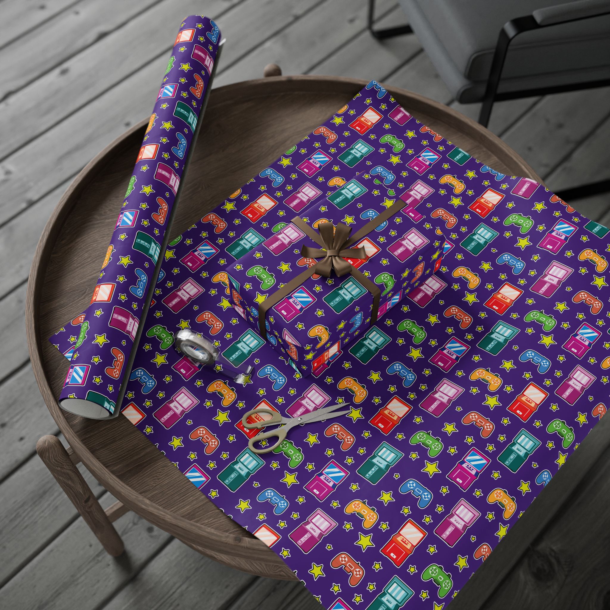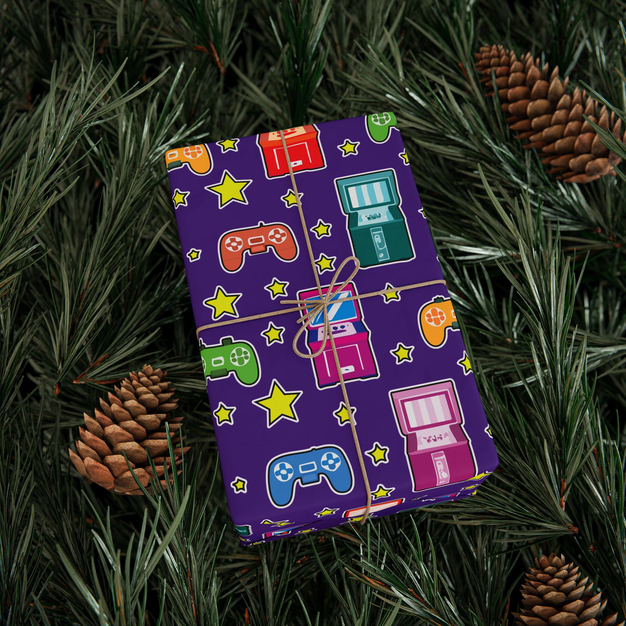Wrapping paper featuring video game controllers and arcade machines on a bold purple background. Perfect for gamers and retro lovers. Add a playful touch to gifts for birthdays, holidays, or any special occasion.