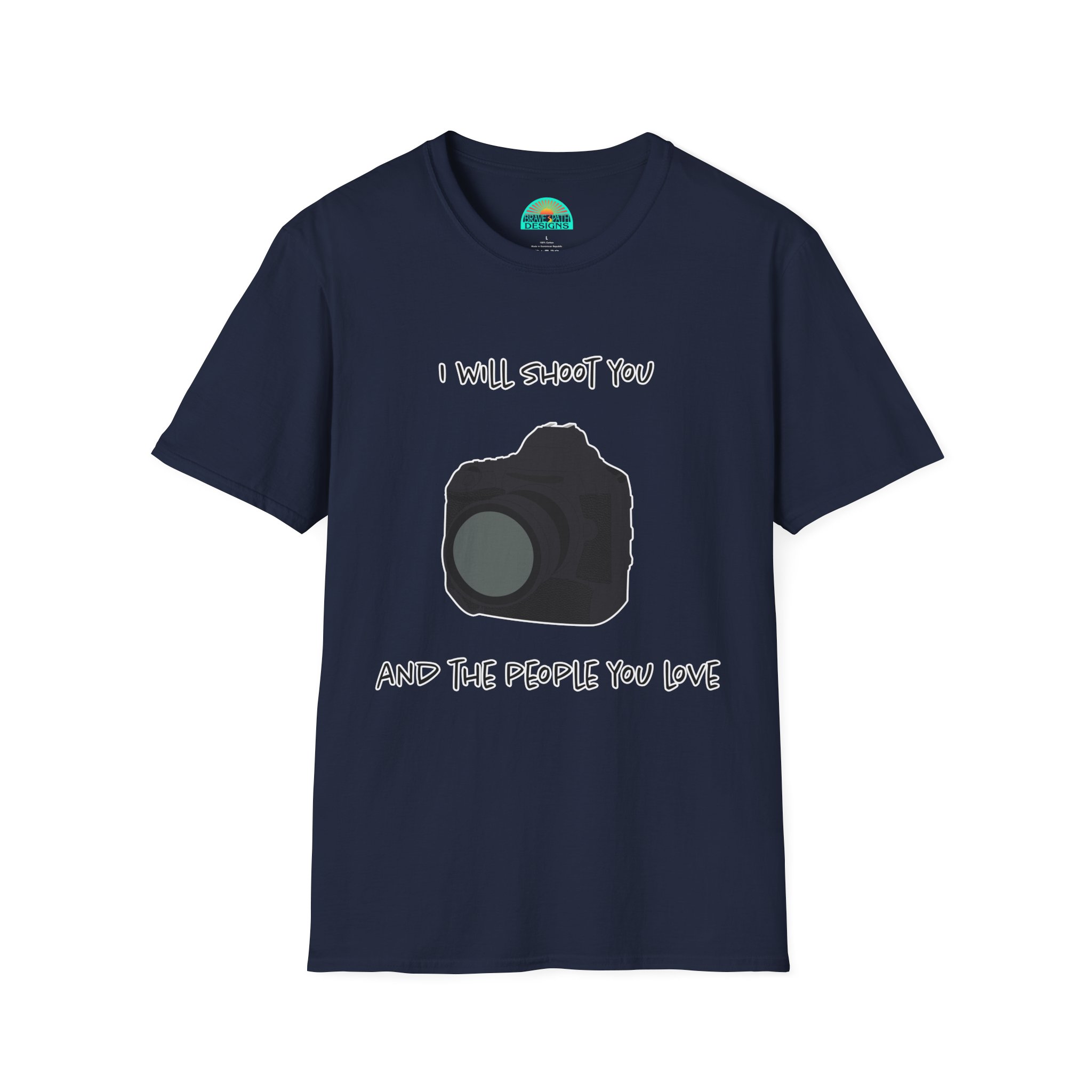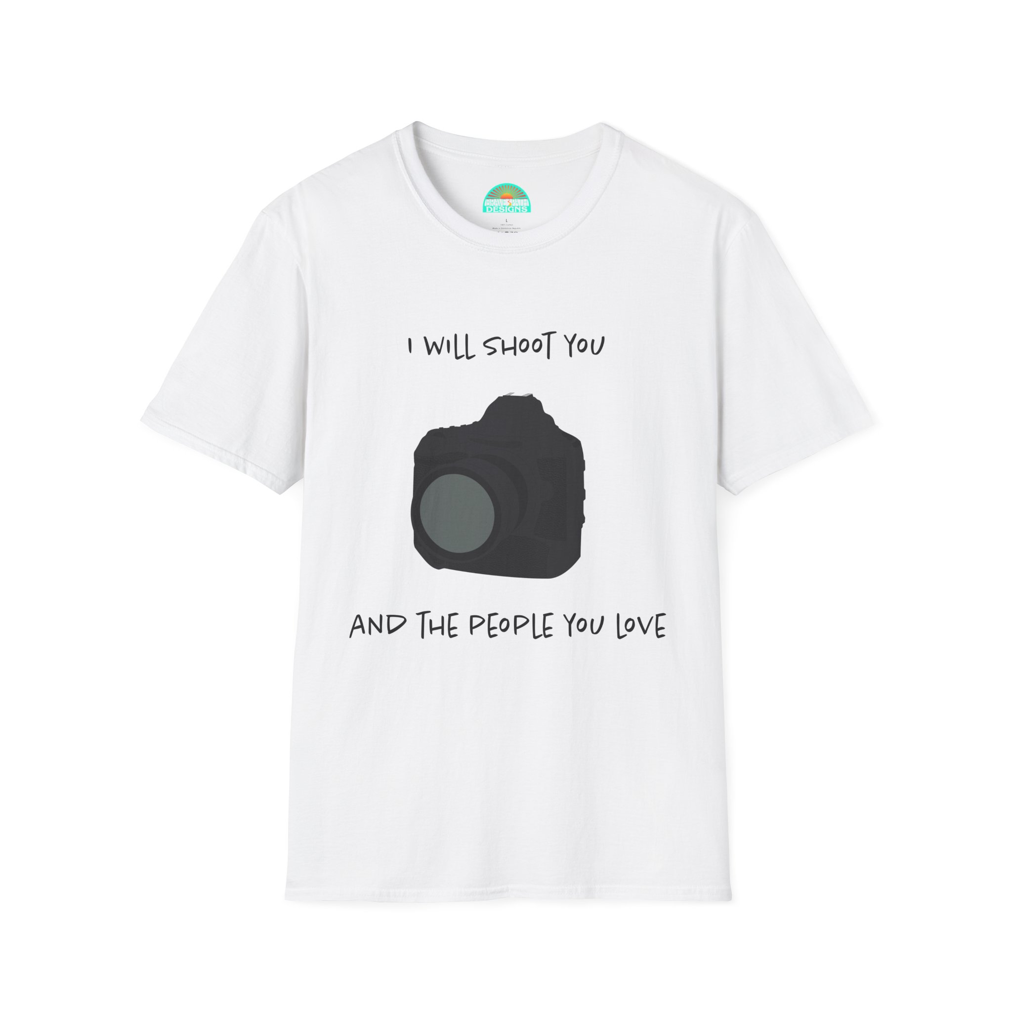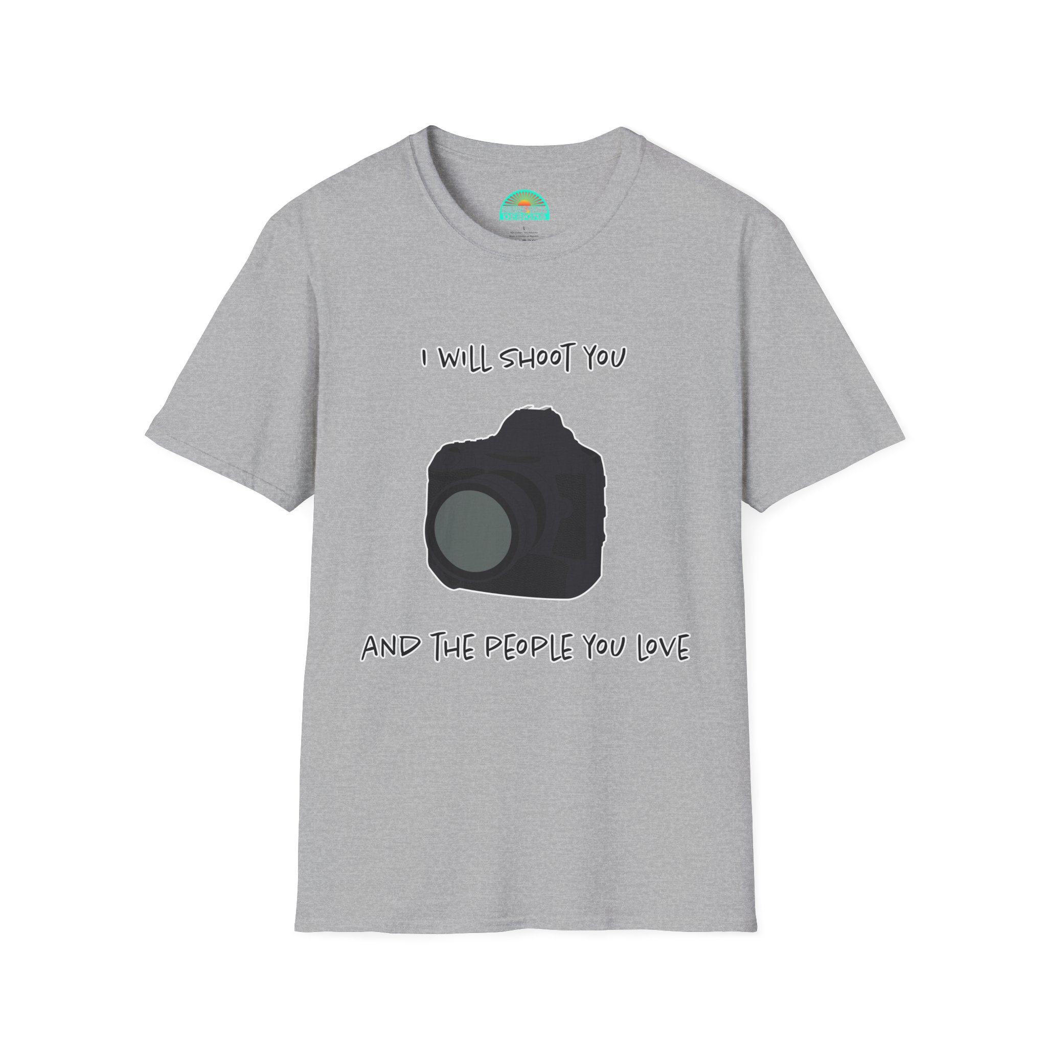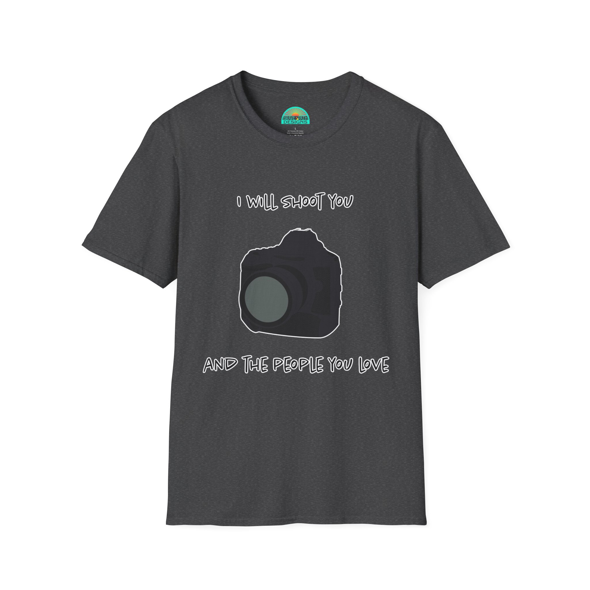 Modern camera tee with 'I will shoot you and the people you love' quote. Soft, durable, unisex design. Perfect for photography lovers and storytellers. Ideal for everyday wear or as a thoughtful gift for any occasion.