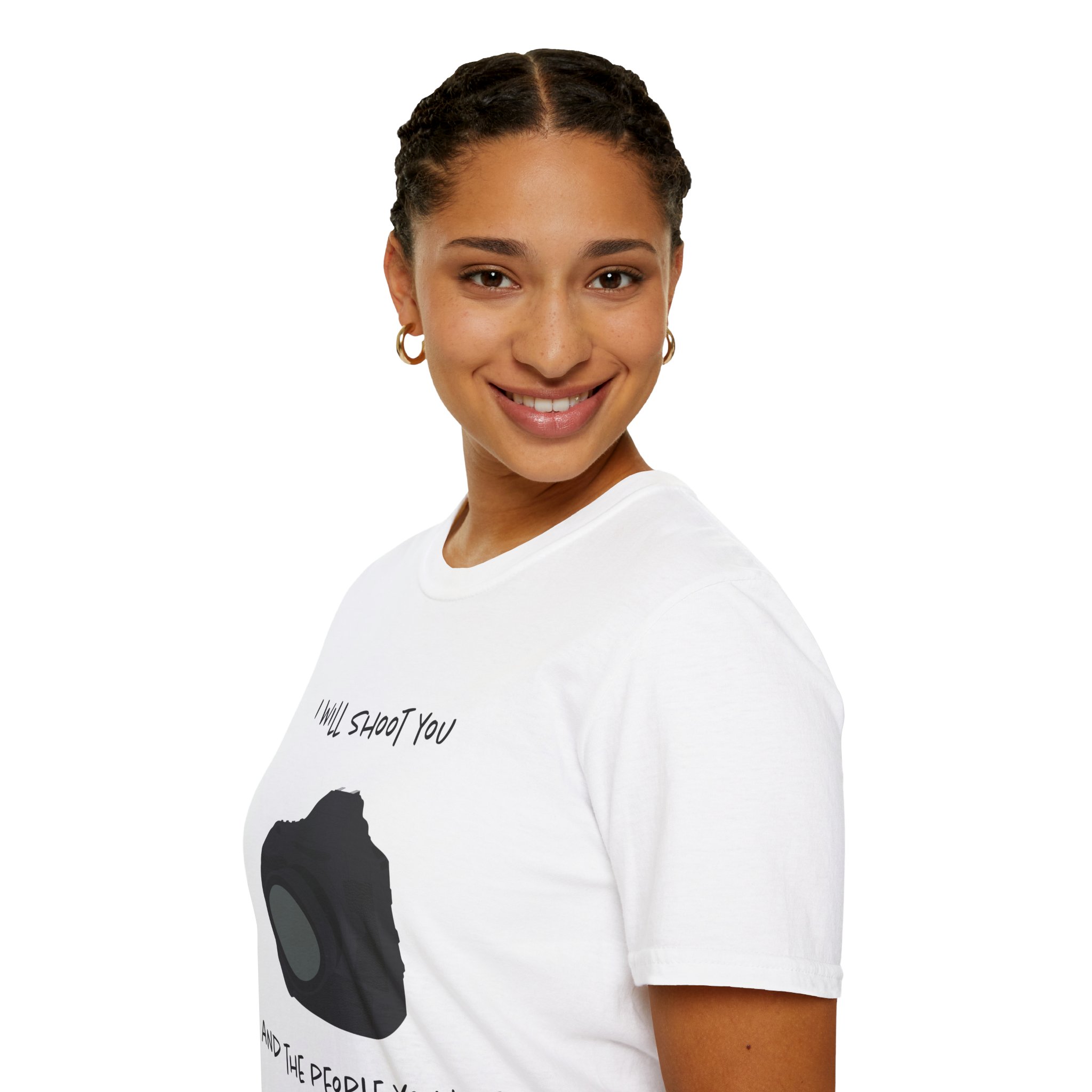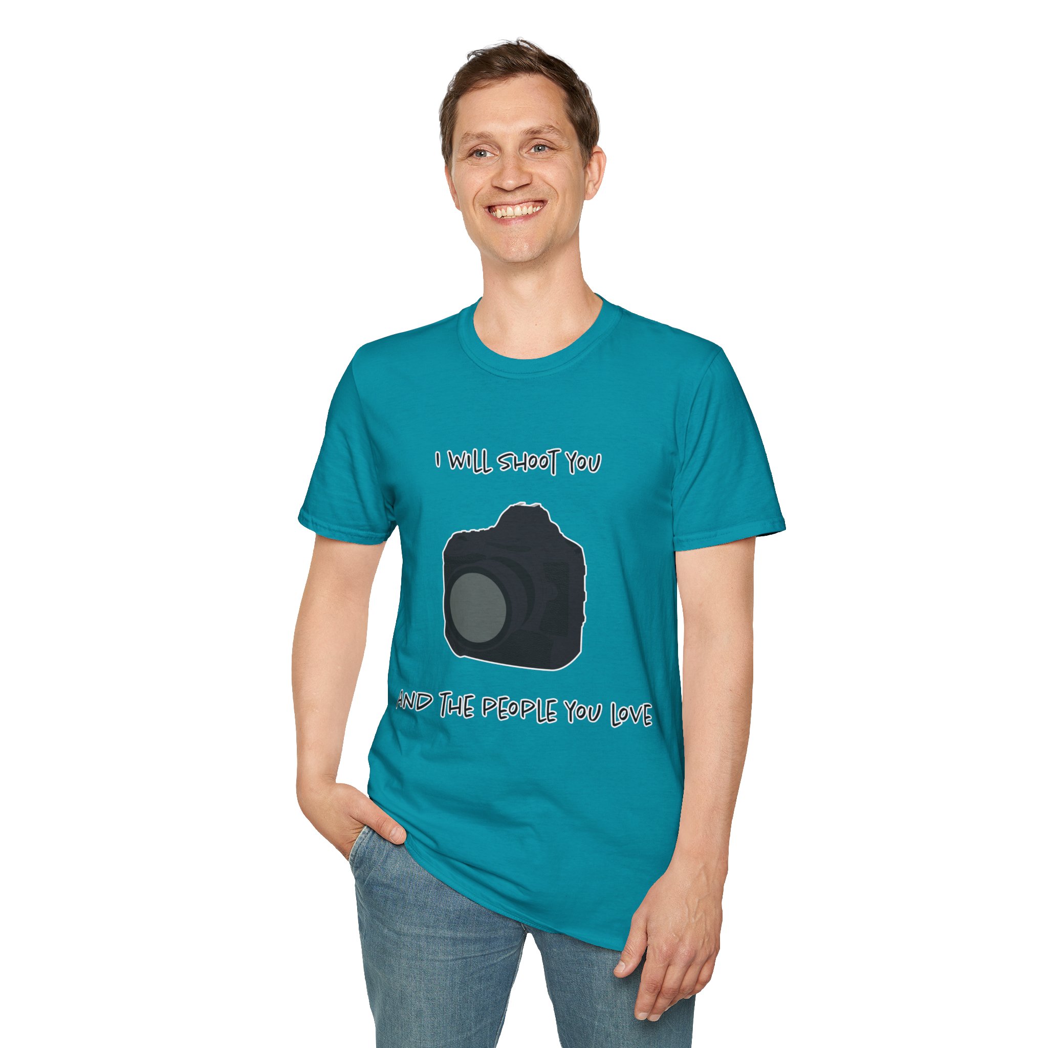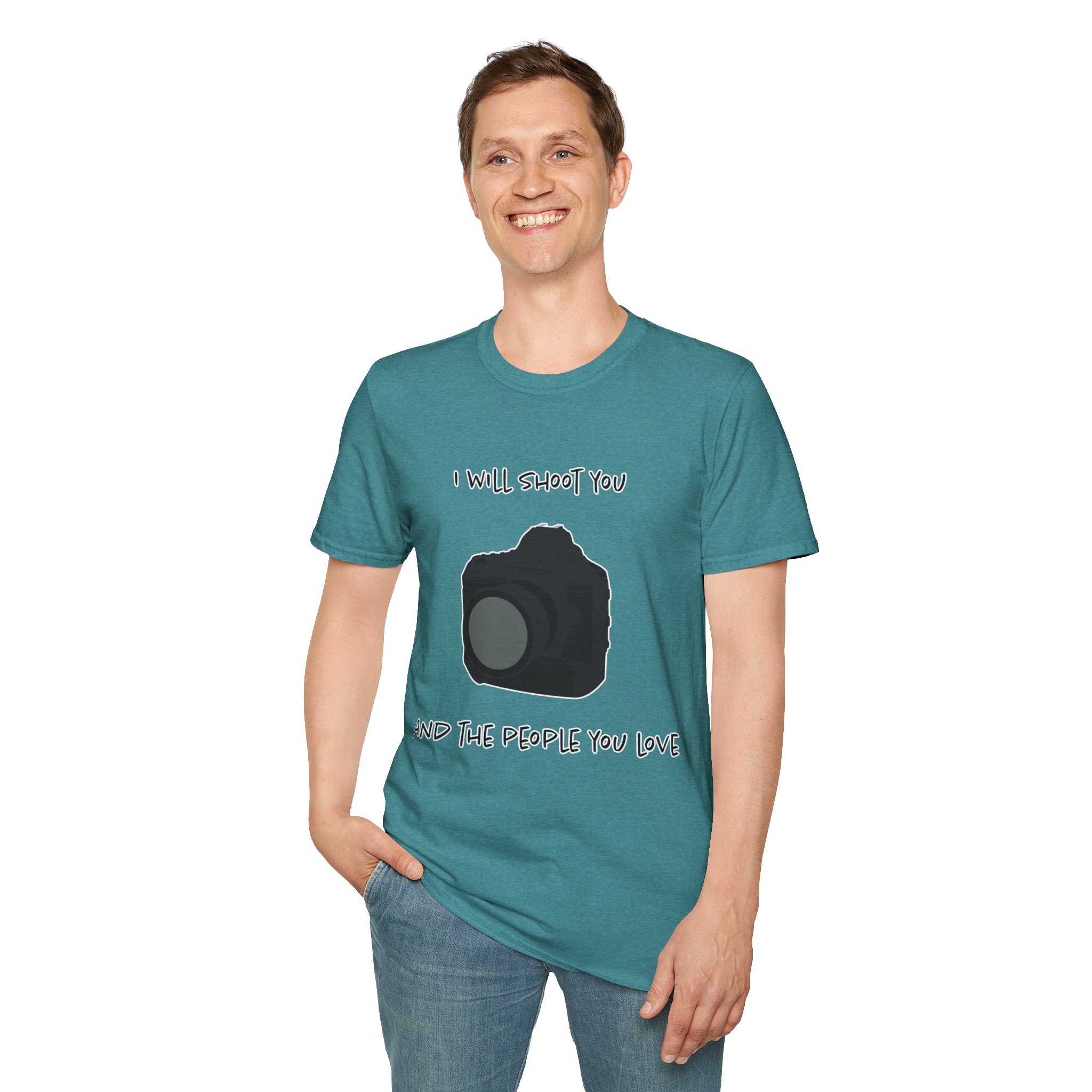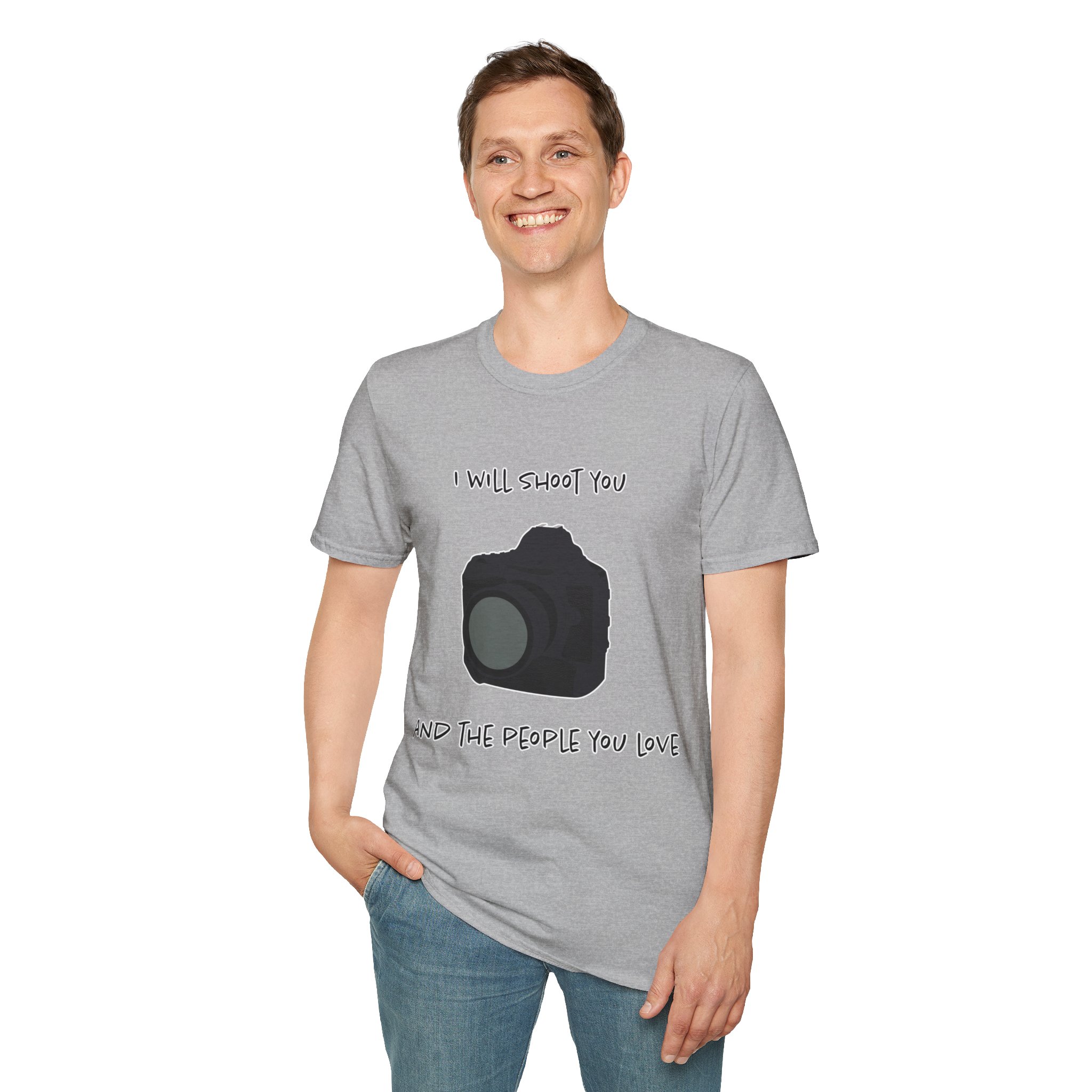 Modern camera tee with 'I will shoot you and the people you love' quote. Soft, durable, unisex design. Perfect for photography lovers and storytellers. Ideal for everyday wear or as a thoughtful gift for any occasion.