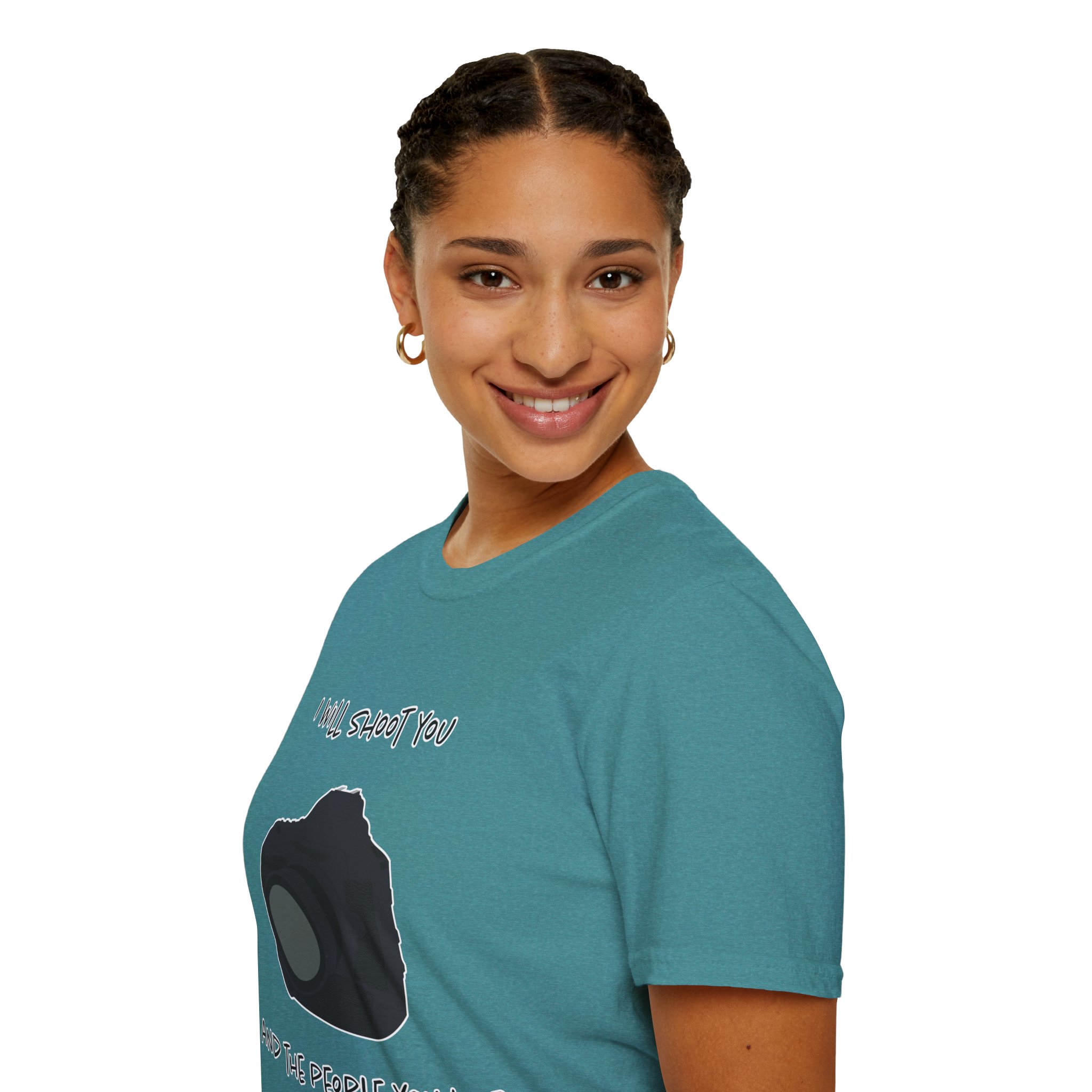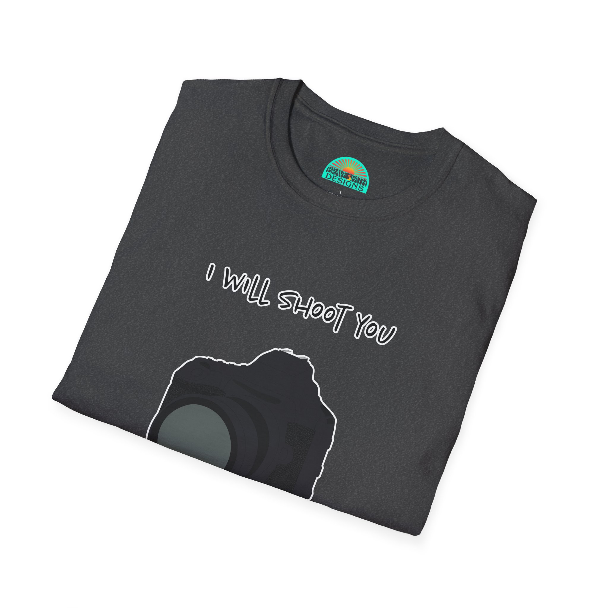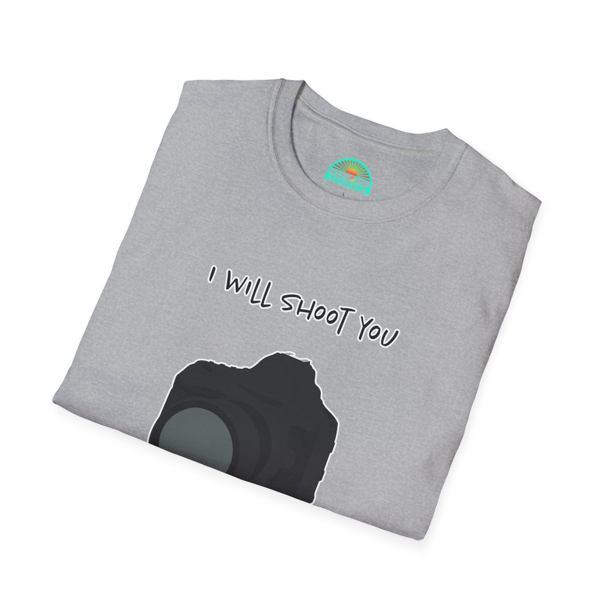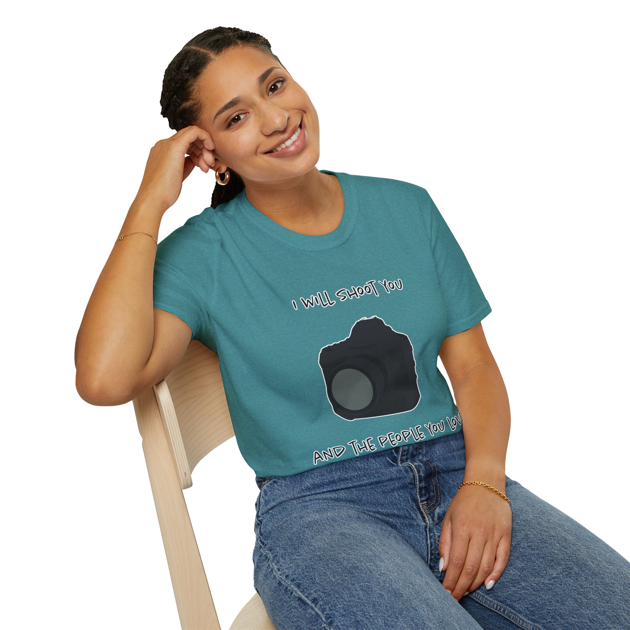 Modern camera tee with 'I will shoot you and the people you love' quote. Soft, durable, unisex design. Perfect for photography lovers and storytellers. Ideal for everyday wear or as a thoughtful gift for any occasion.
