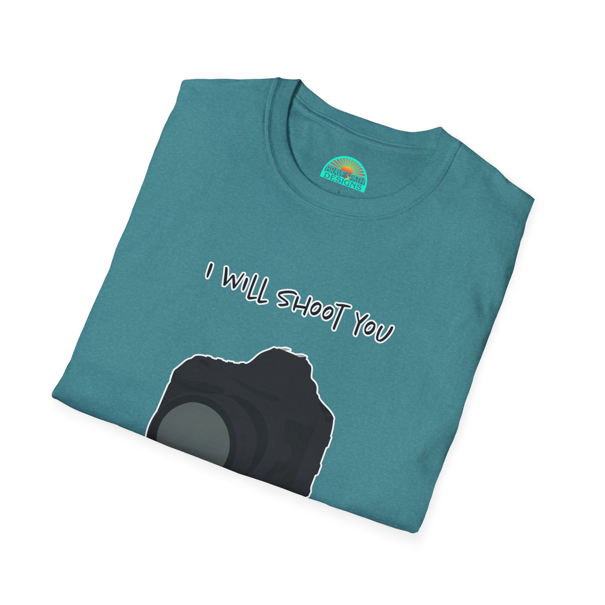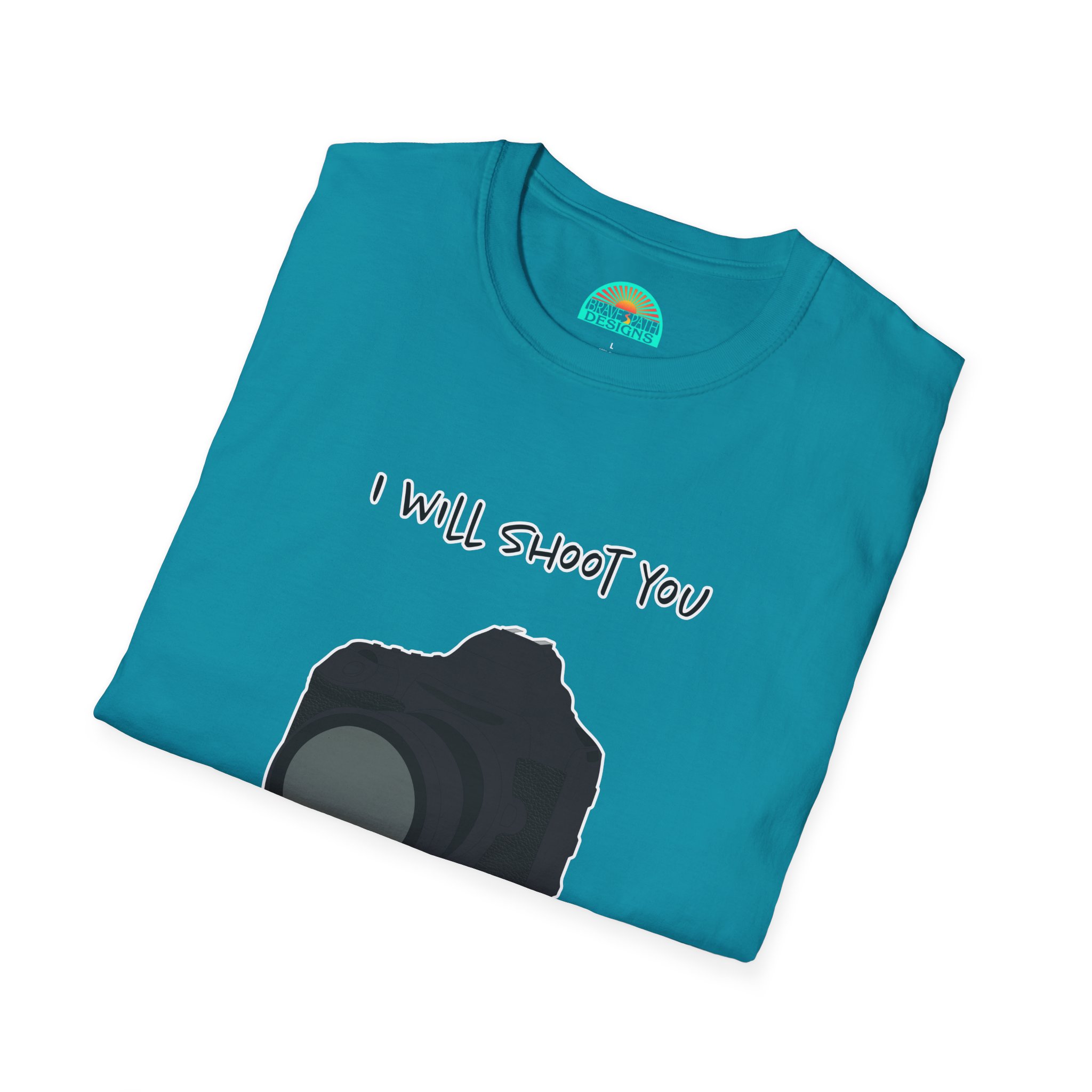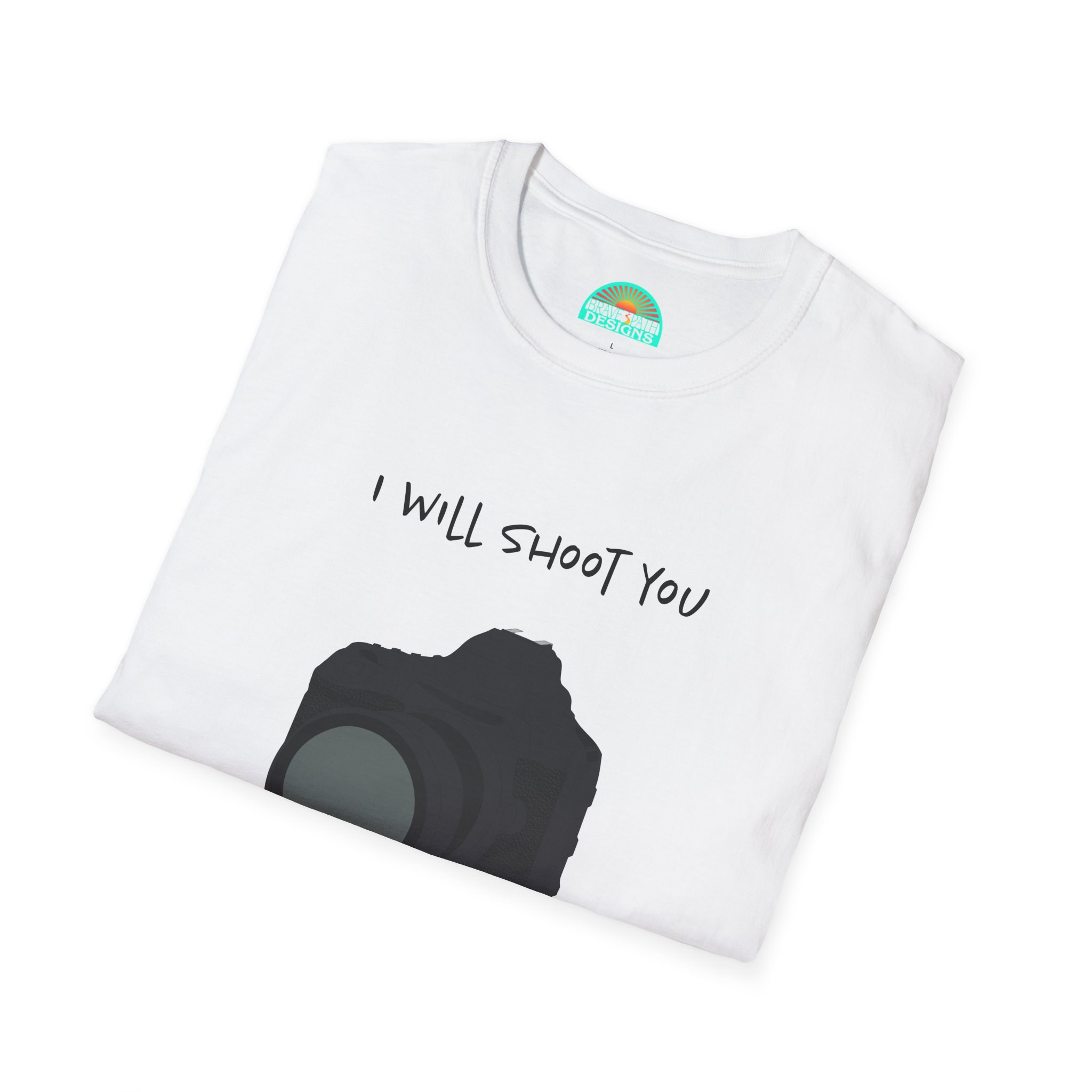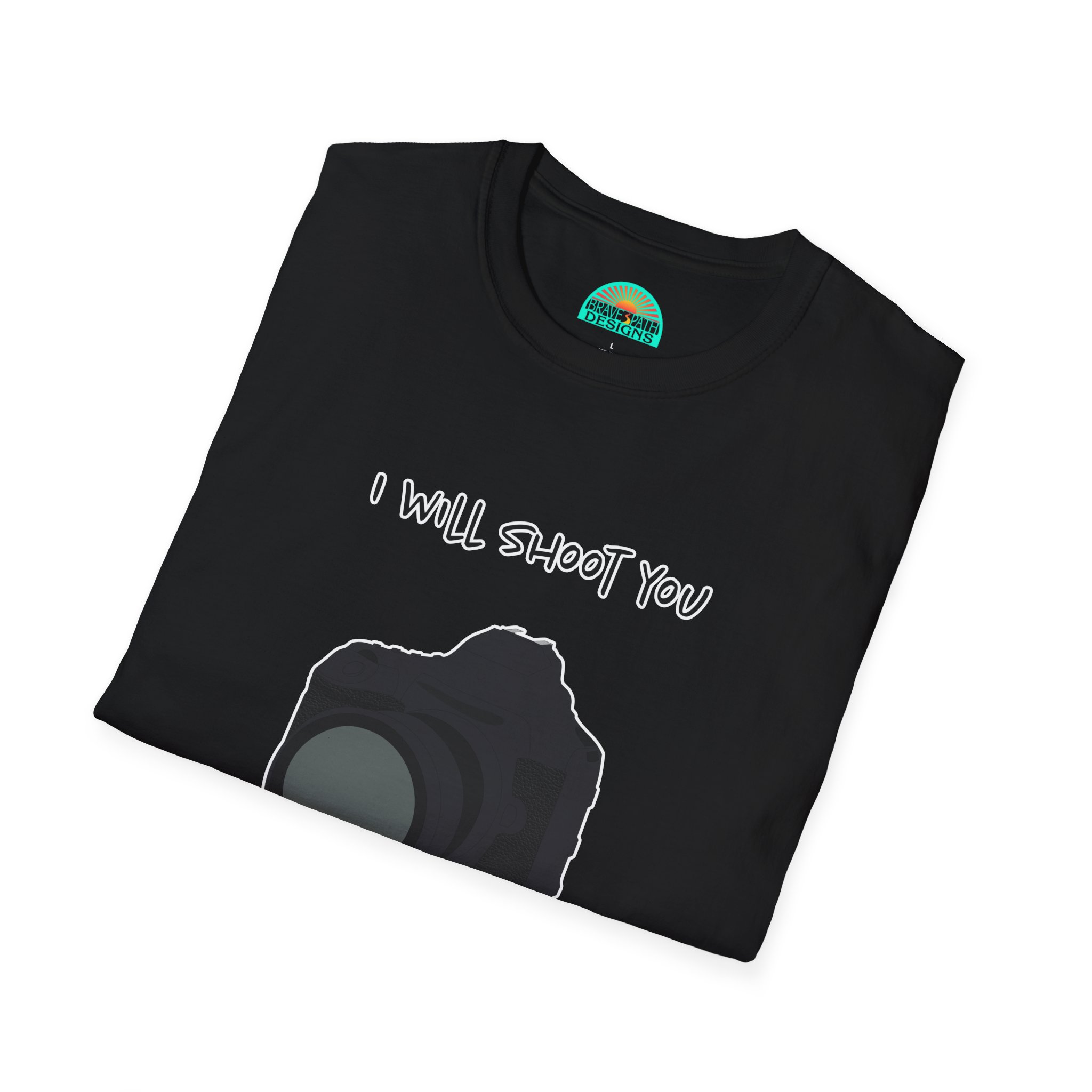 Modern camera tee with 'I will shoot you and the people you love' quote. Soft, durable, unisex design. Perfect for photography lovers and storytellers. Ideal for everyday wear or as a thoughtful gift for any occasion.
