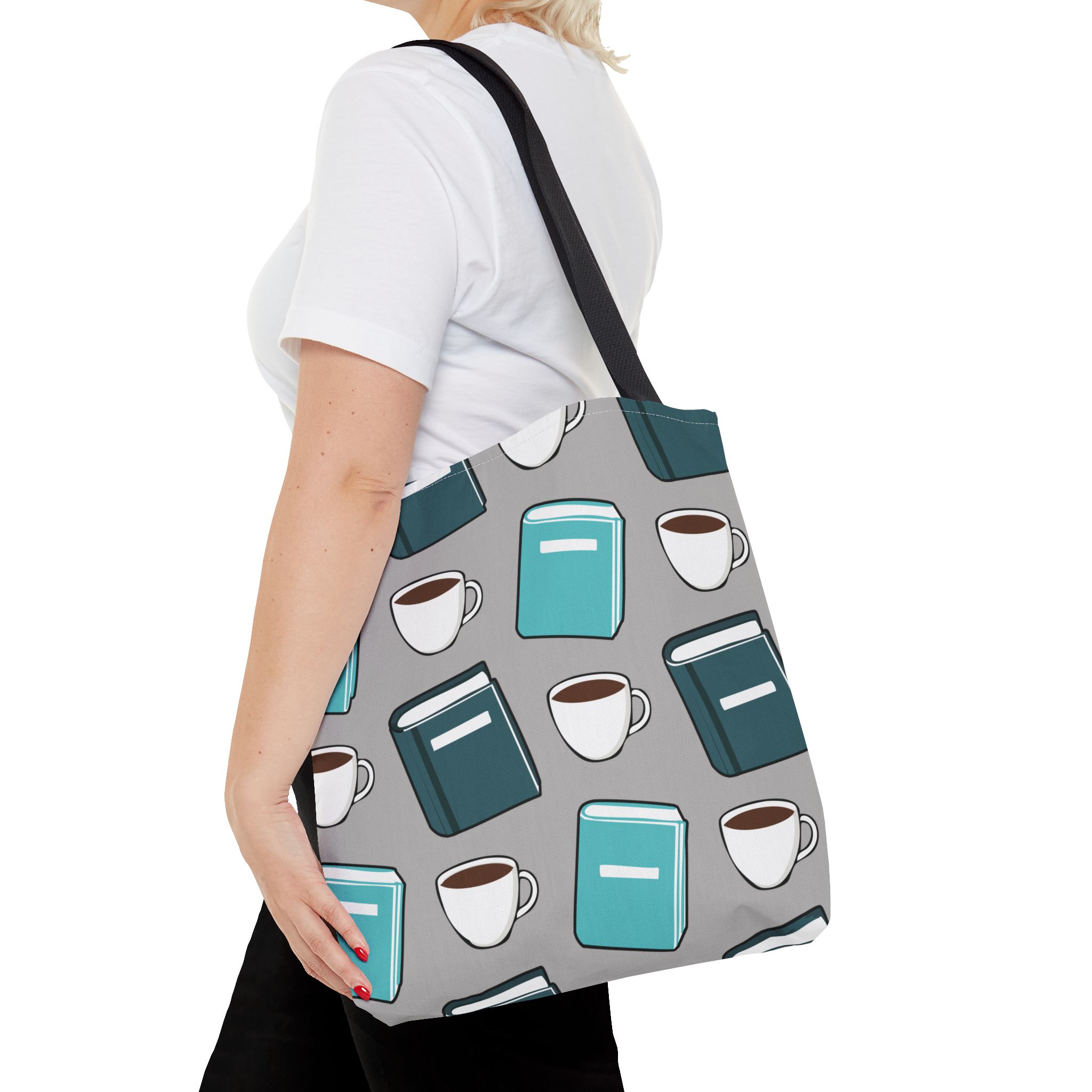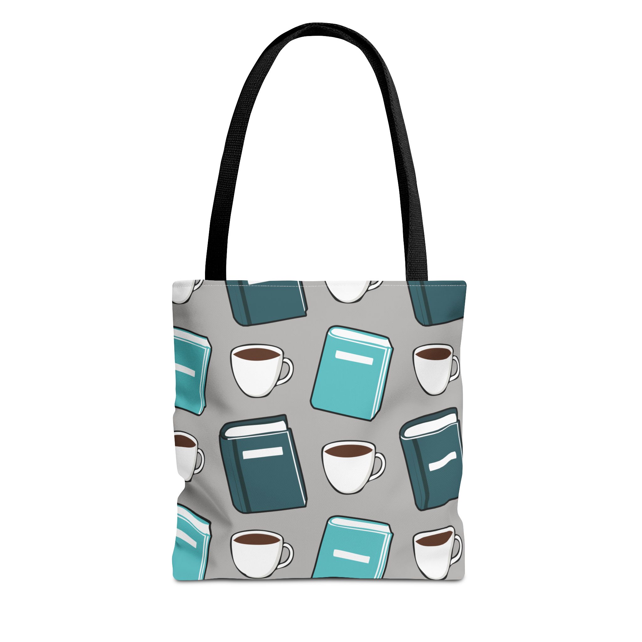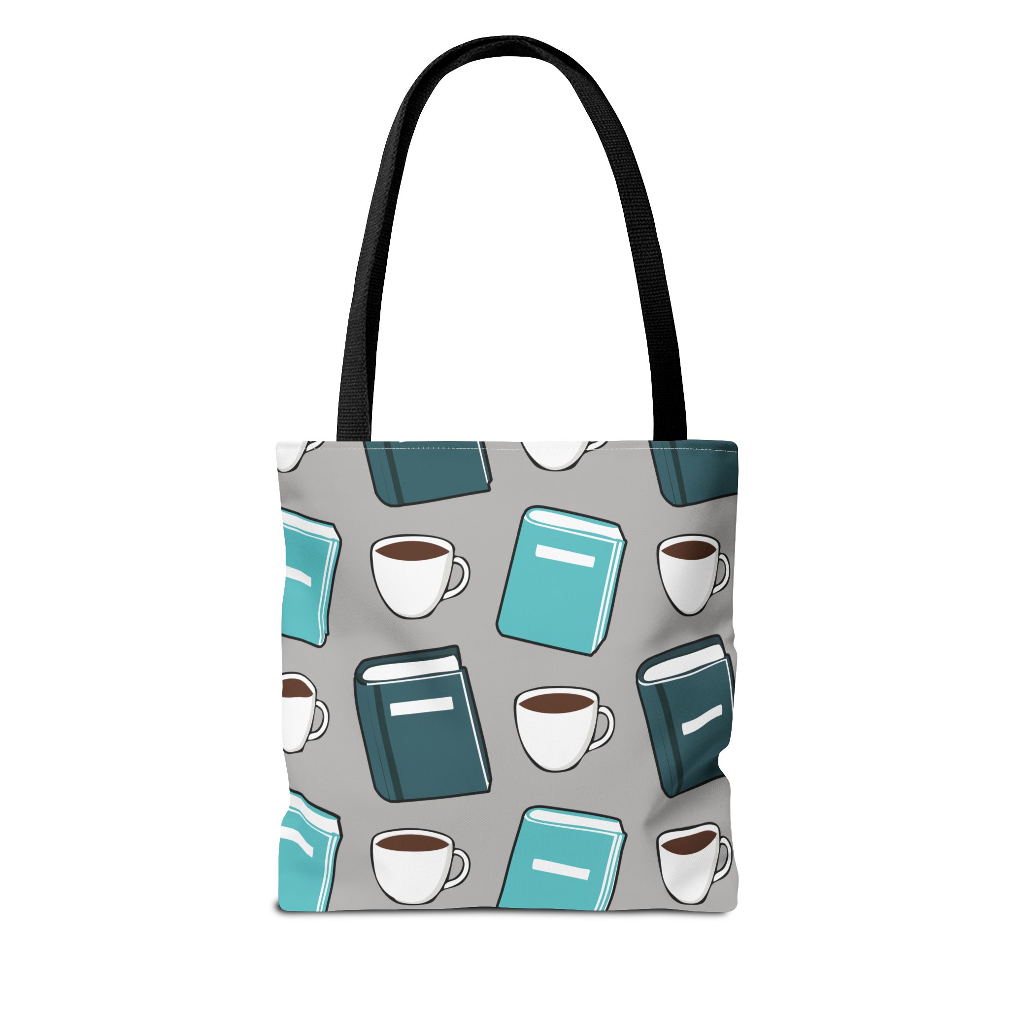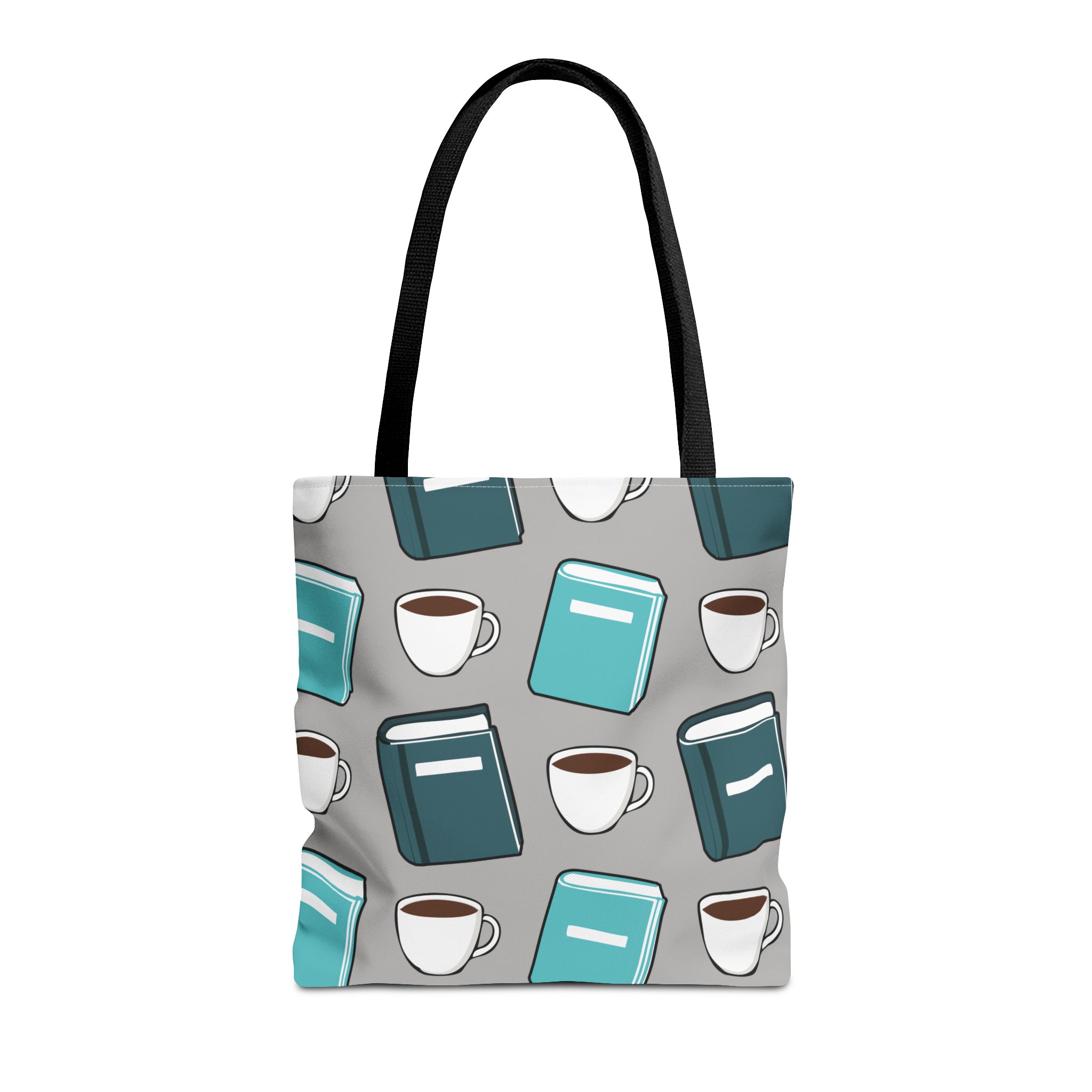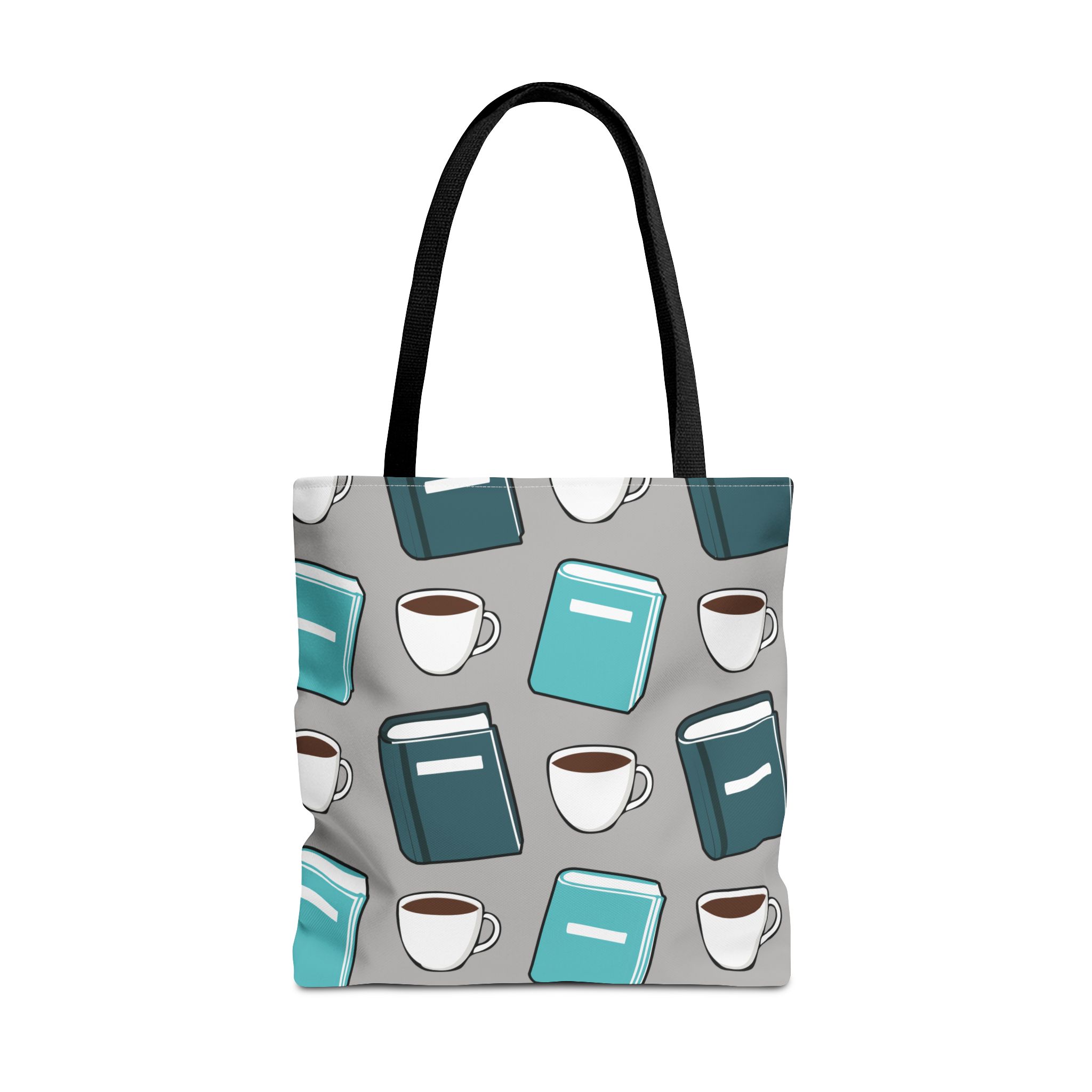 Carry your essentials in this tote bag featuring a playful pattern of books and coffee cups—ideal for book lovers and coffee enthusiasts on the go.