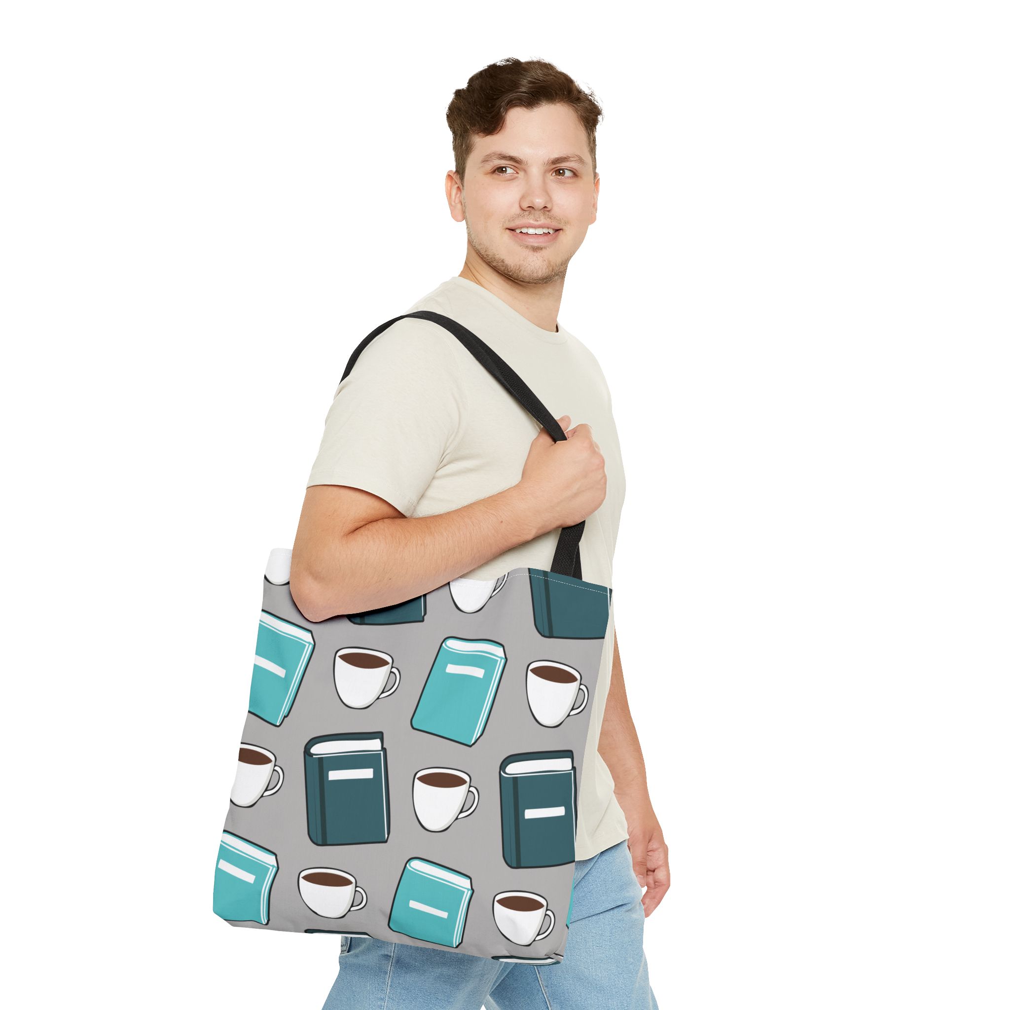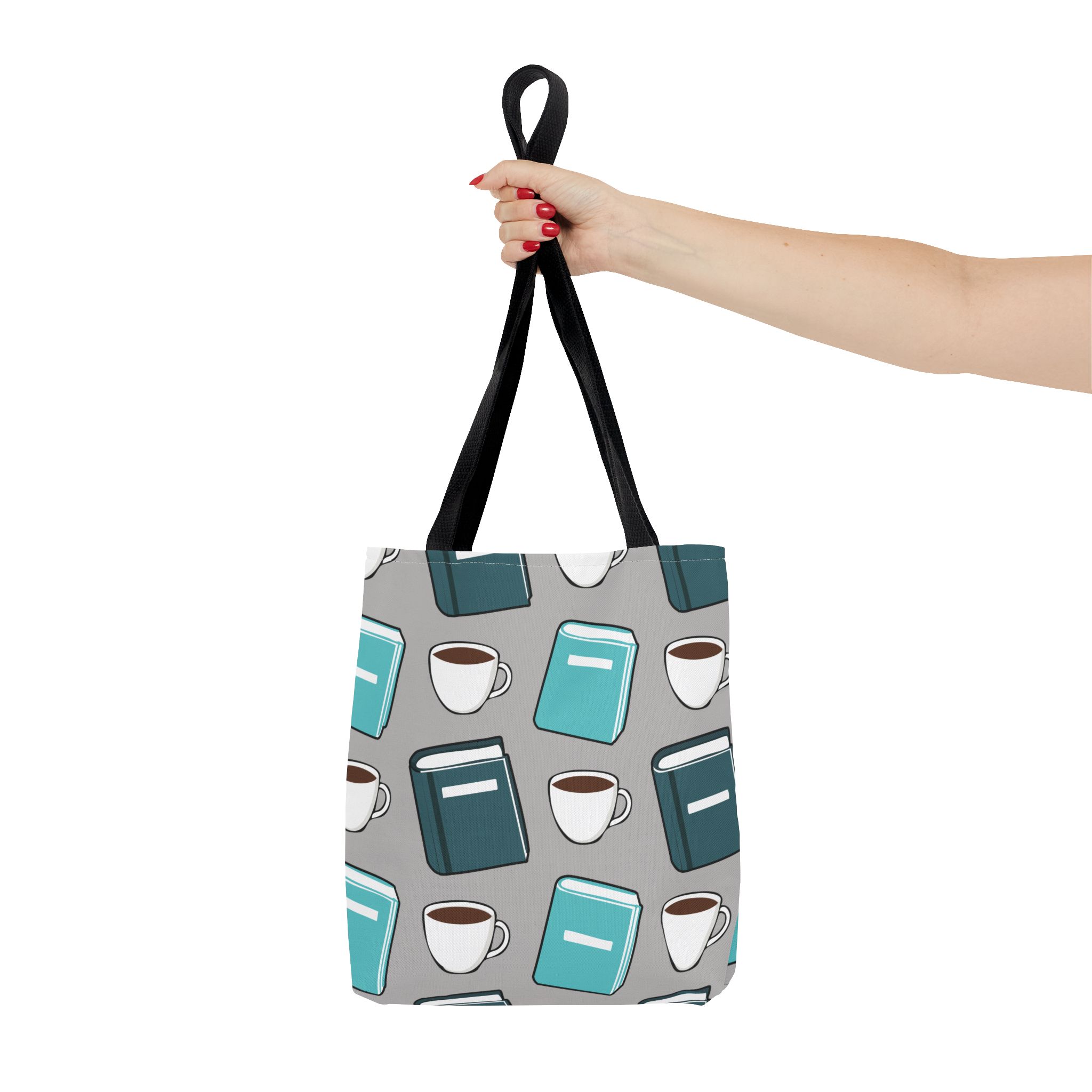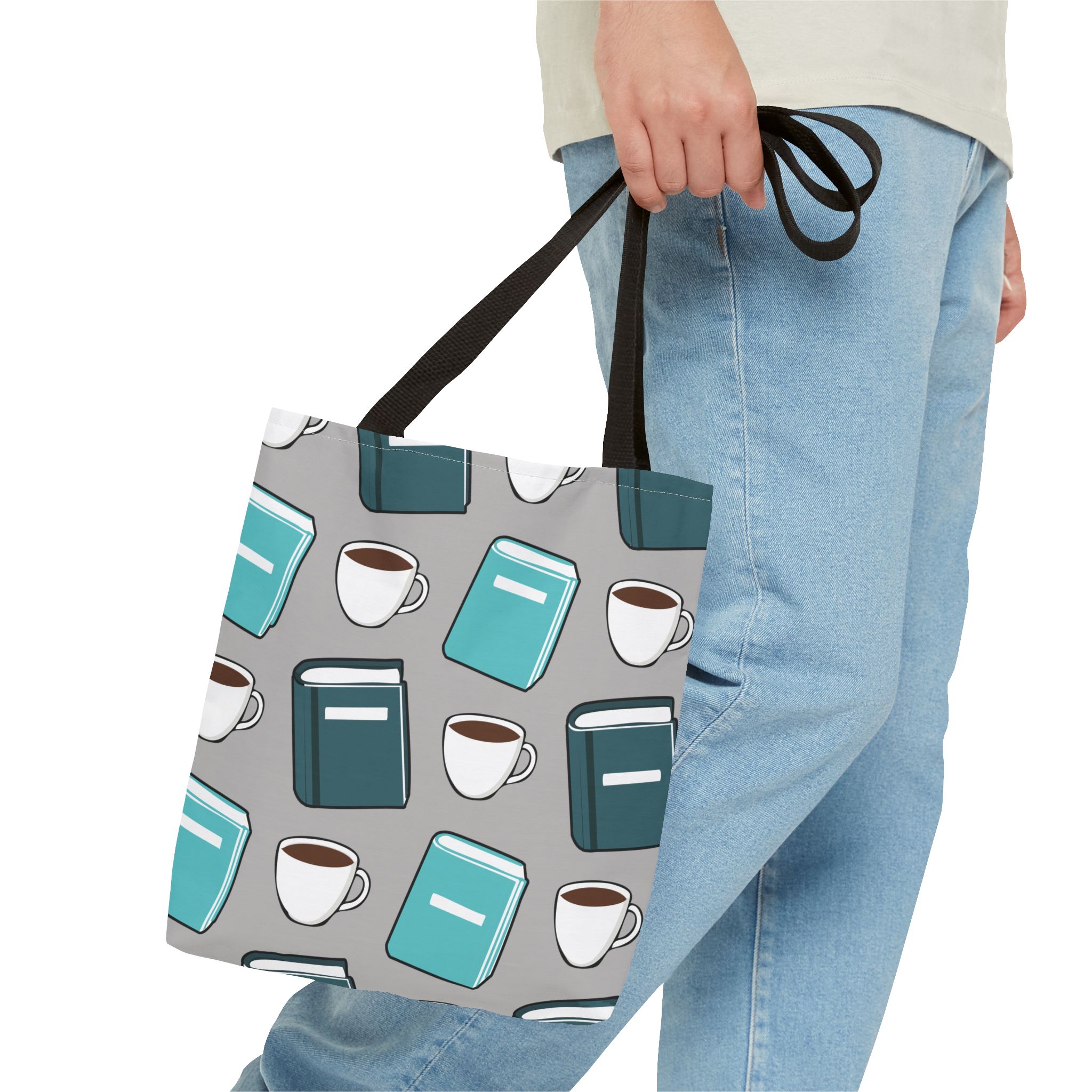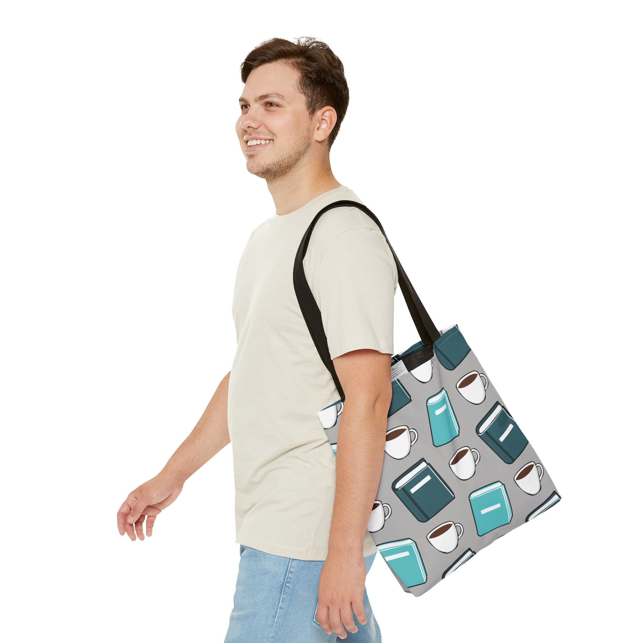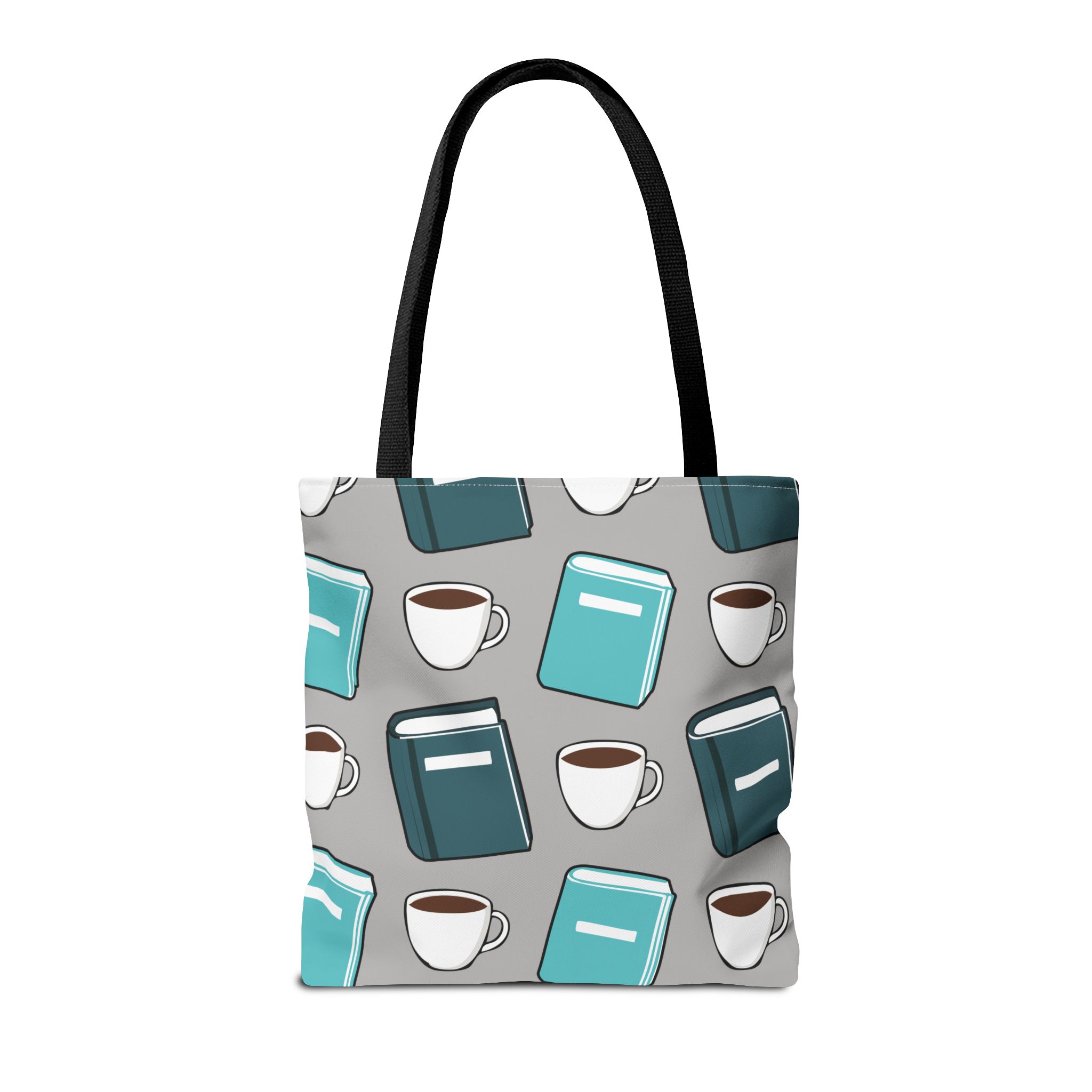 Carry your essentials in this tote bag featuring a playful pattern of books and coffee cups—ideal for book lovers and coffee enthusiasts on the go.