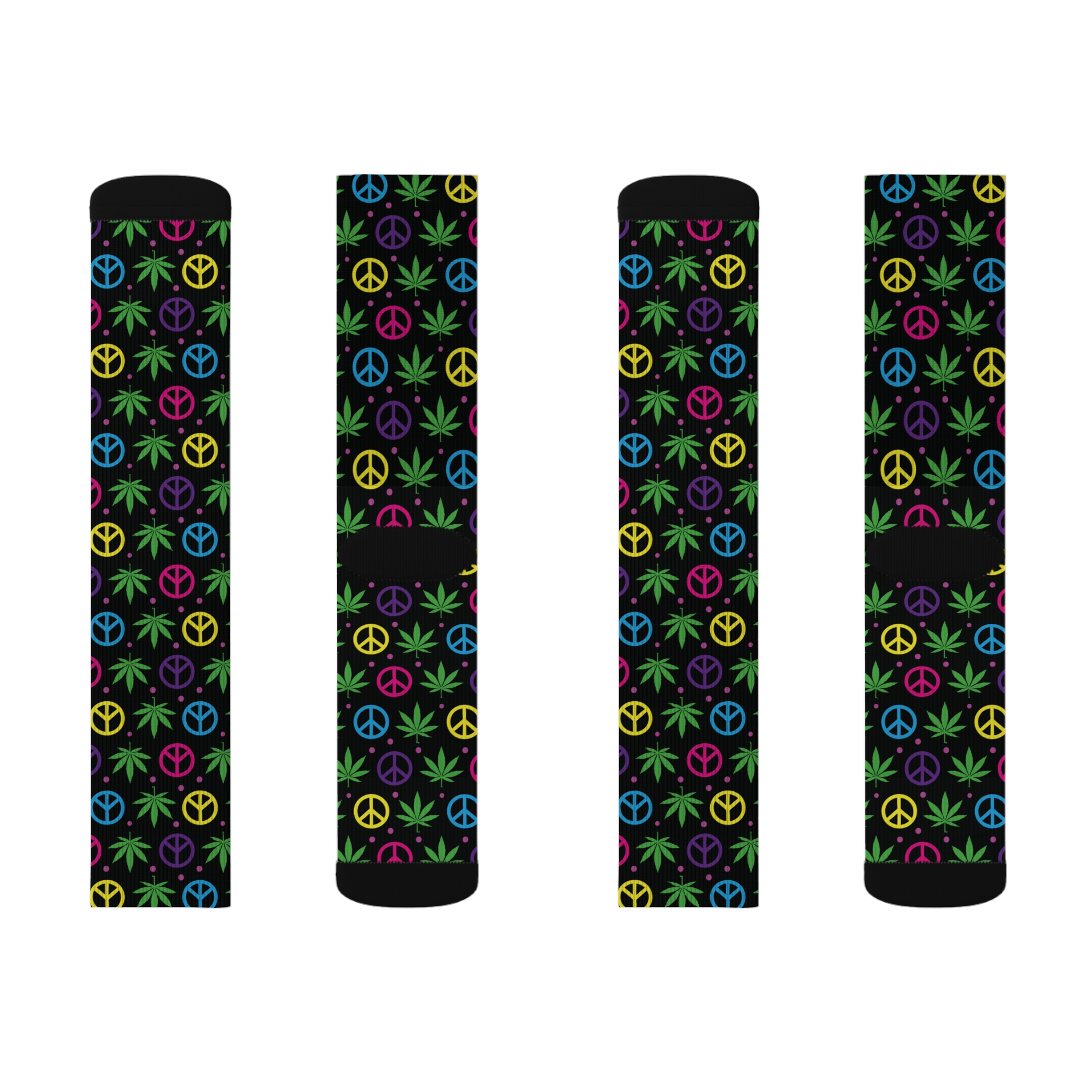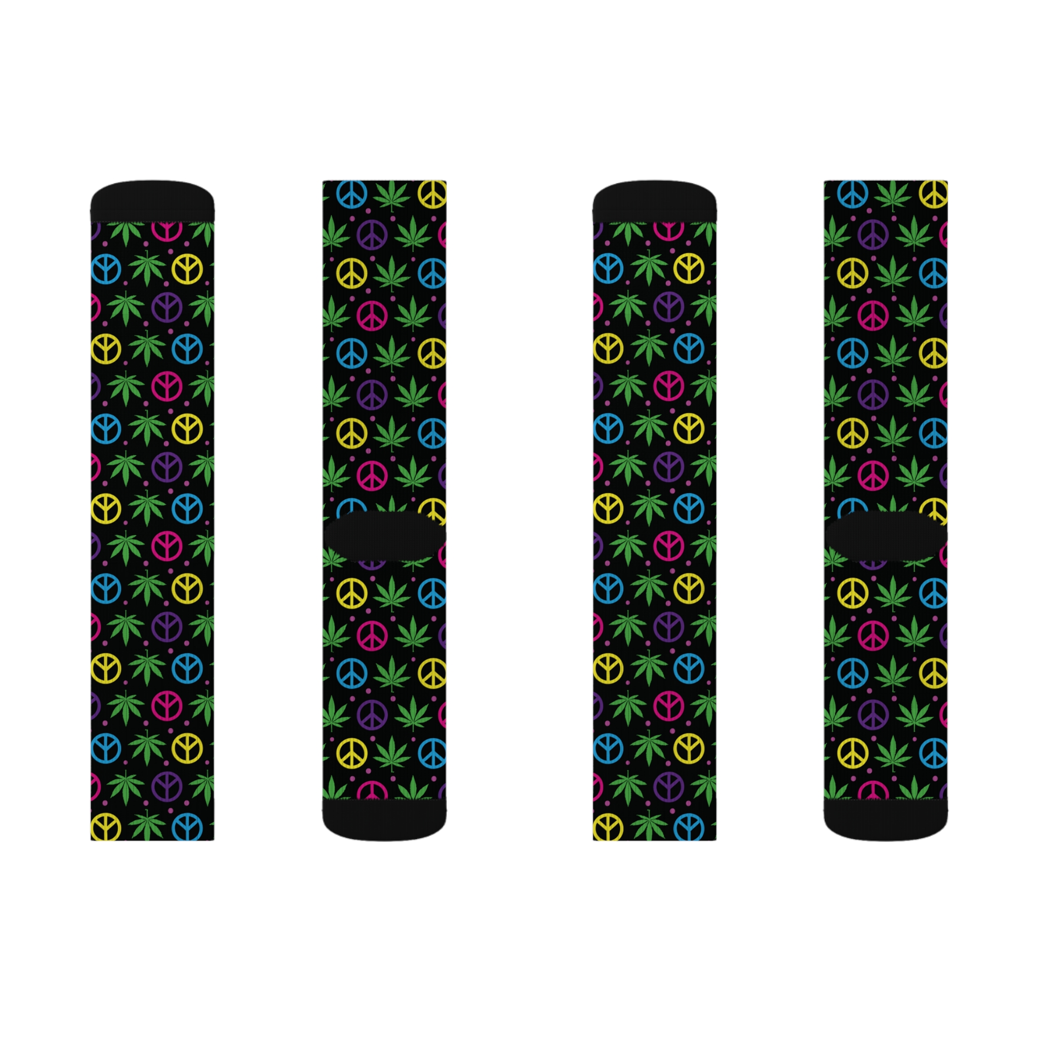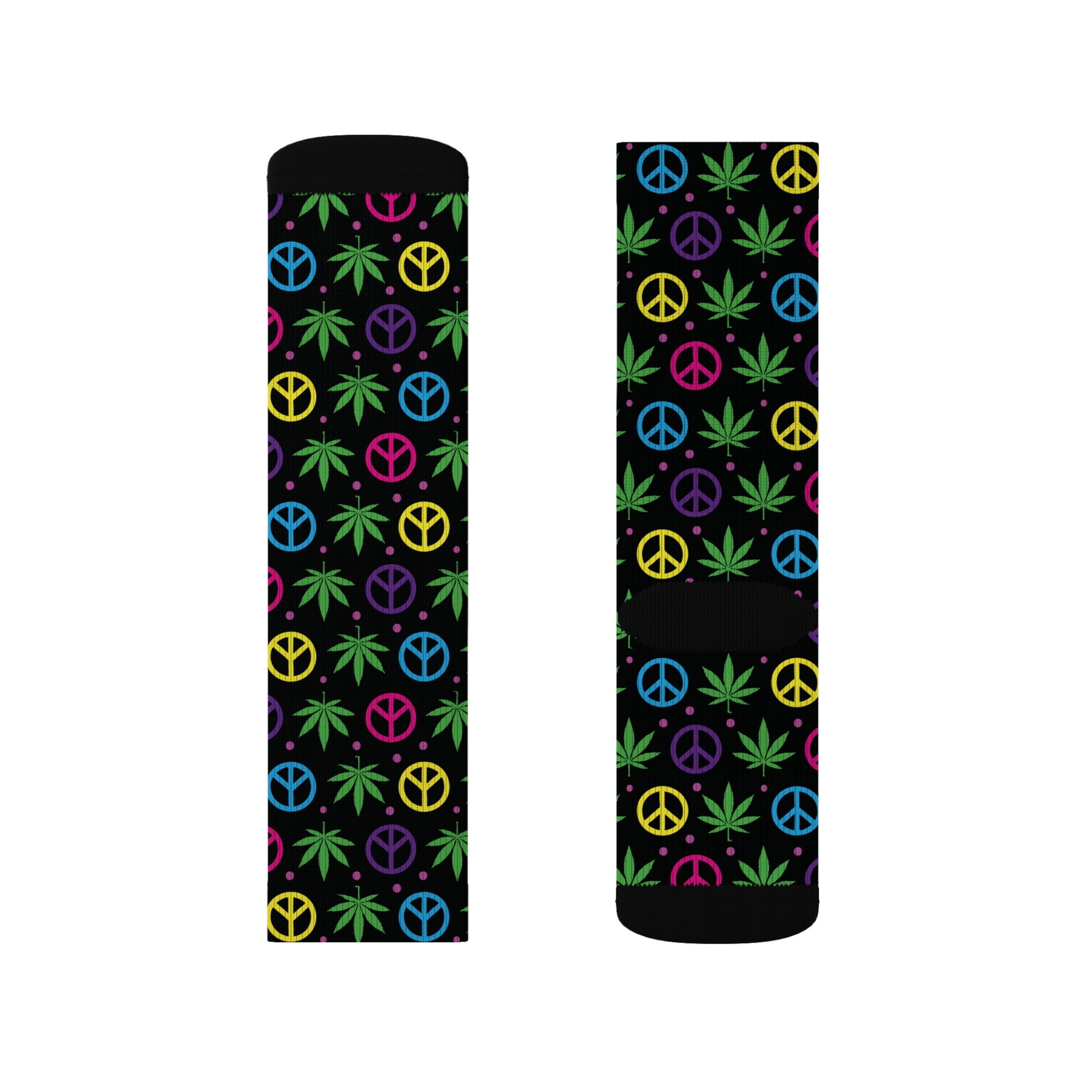 Embrace laid-back vibes with these bold socks featuring peace signs and pot leaves on a sleek black background. Perfect for those who love making a statement, they combine fun, edgy style with soft, breathable fabric for all-day comfort. Let your …