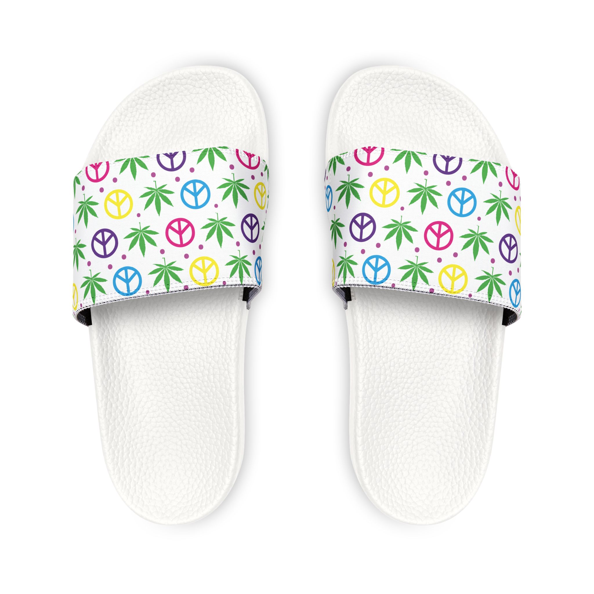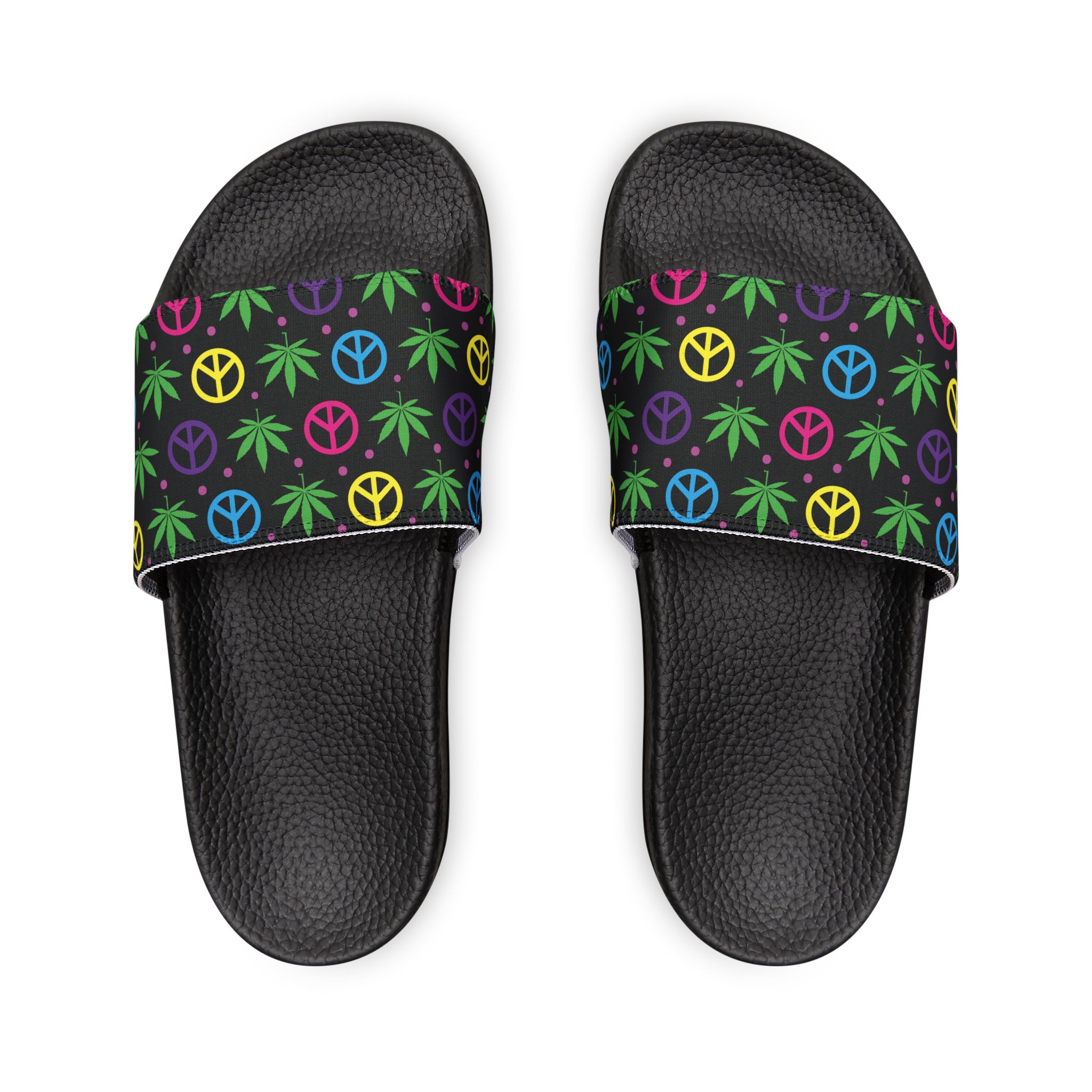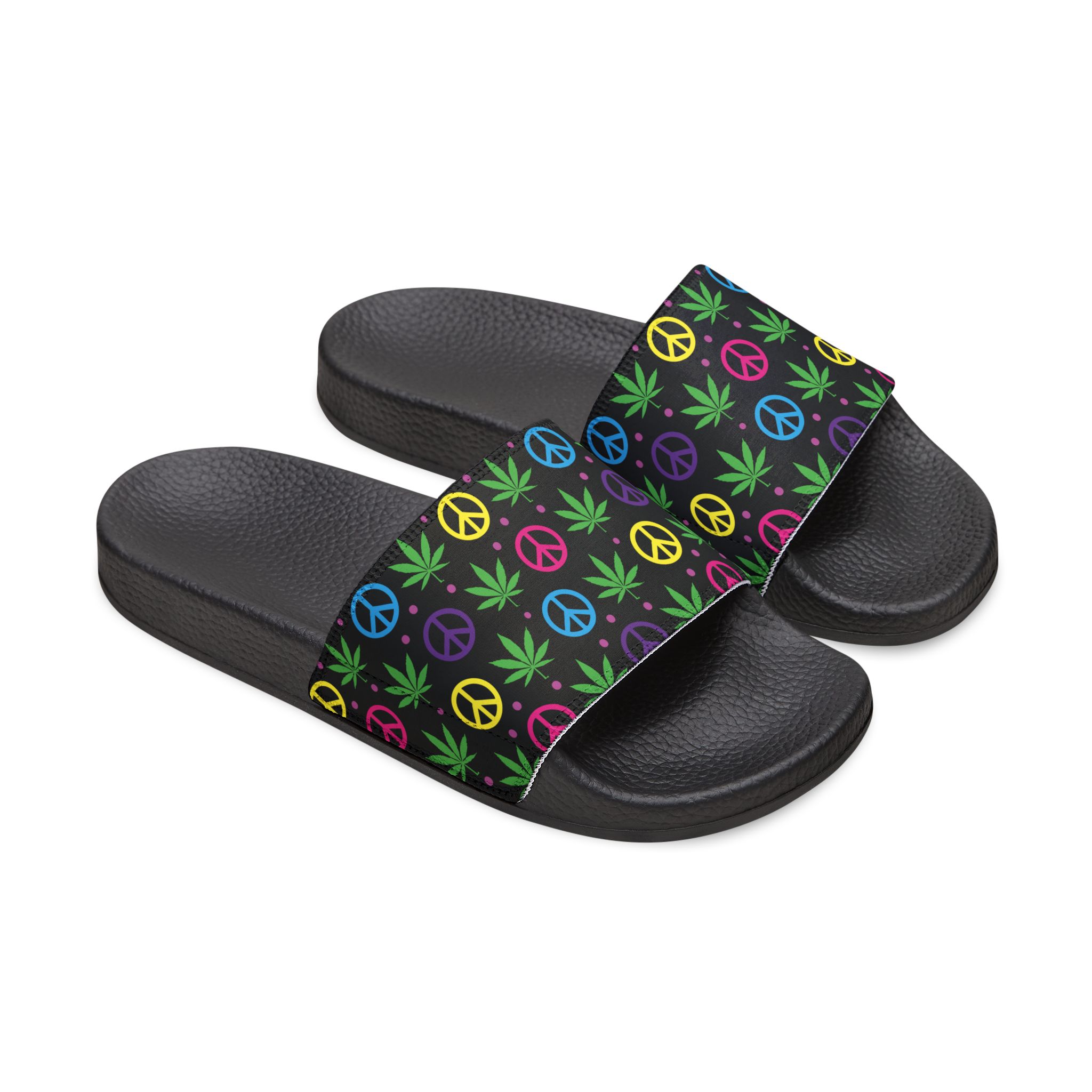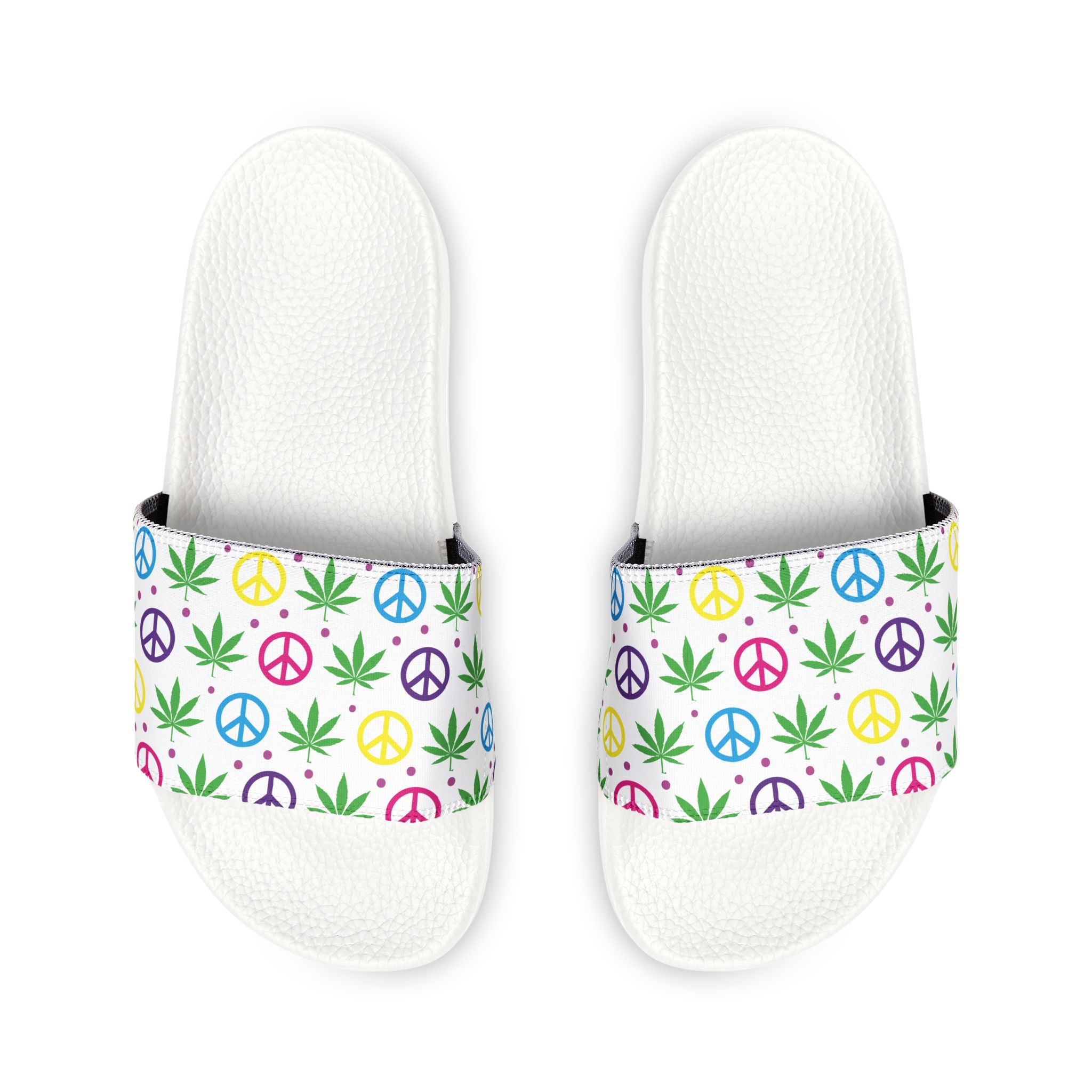 Stay cool with these women's slide sandals featuring peace signs and pot leaves. Durable PU outsoles and neoprene straps prevent chafing, while the ergonomic sole offers comfort for all your summer adventures!
