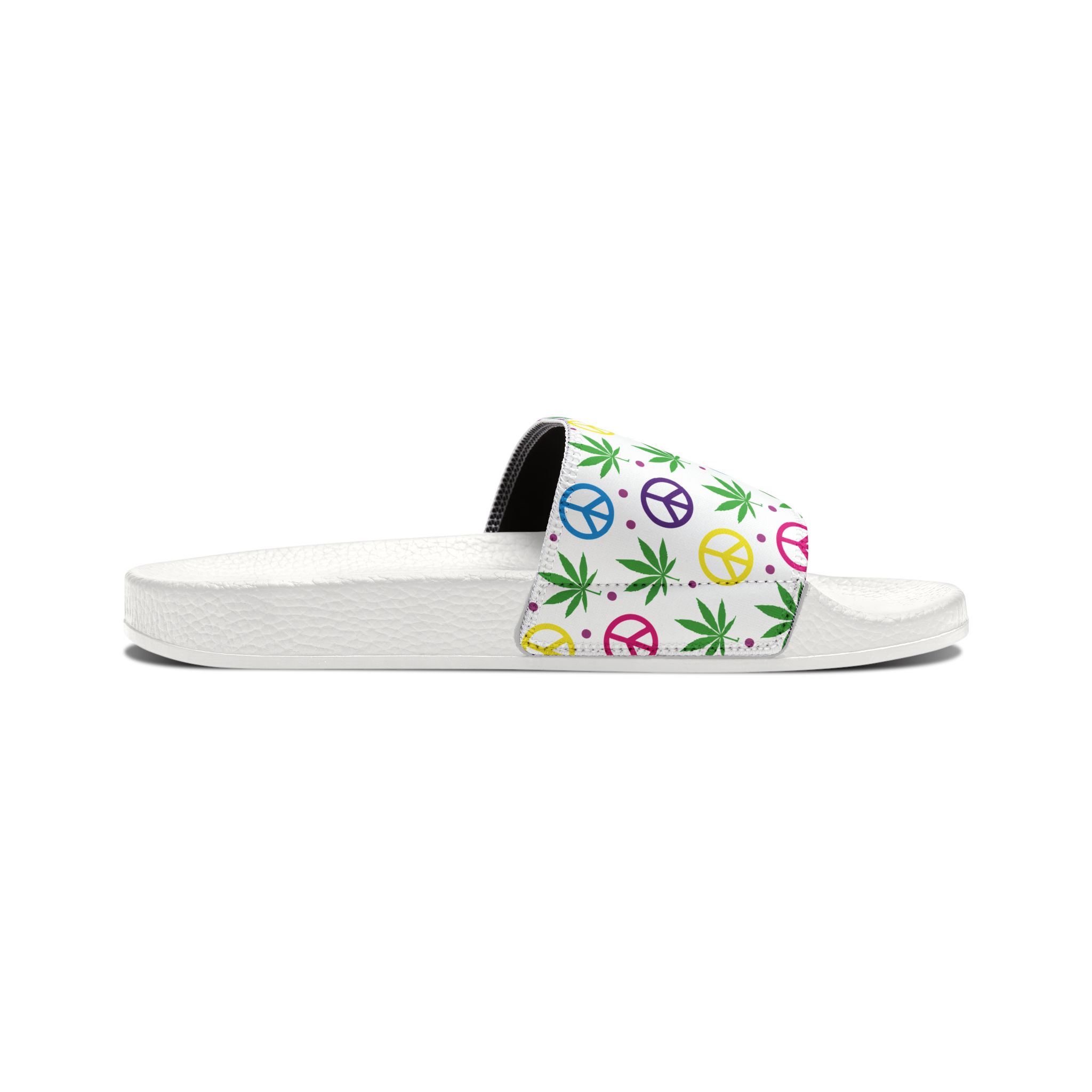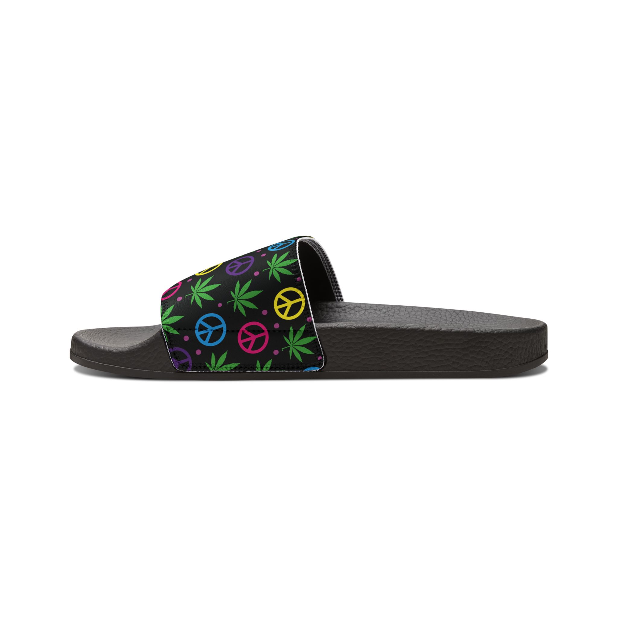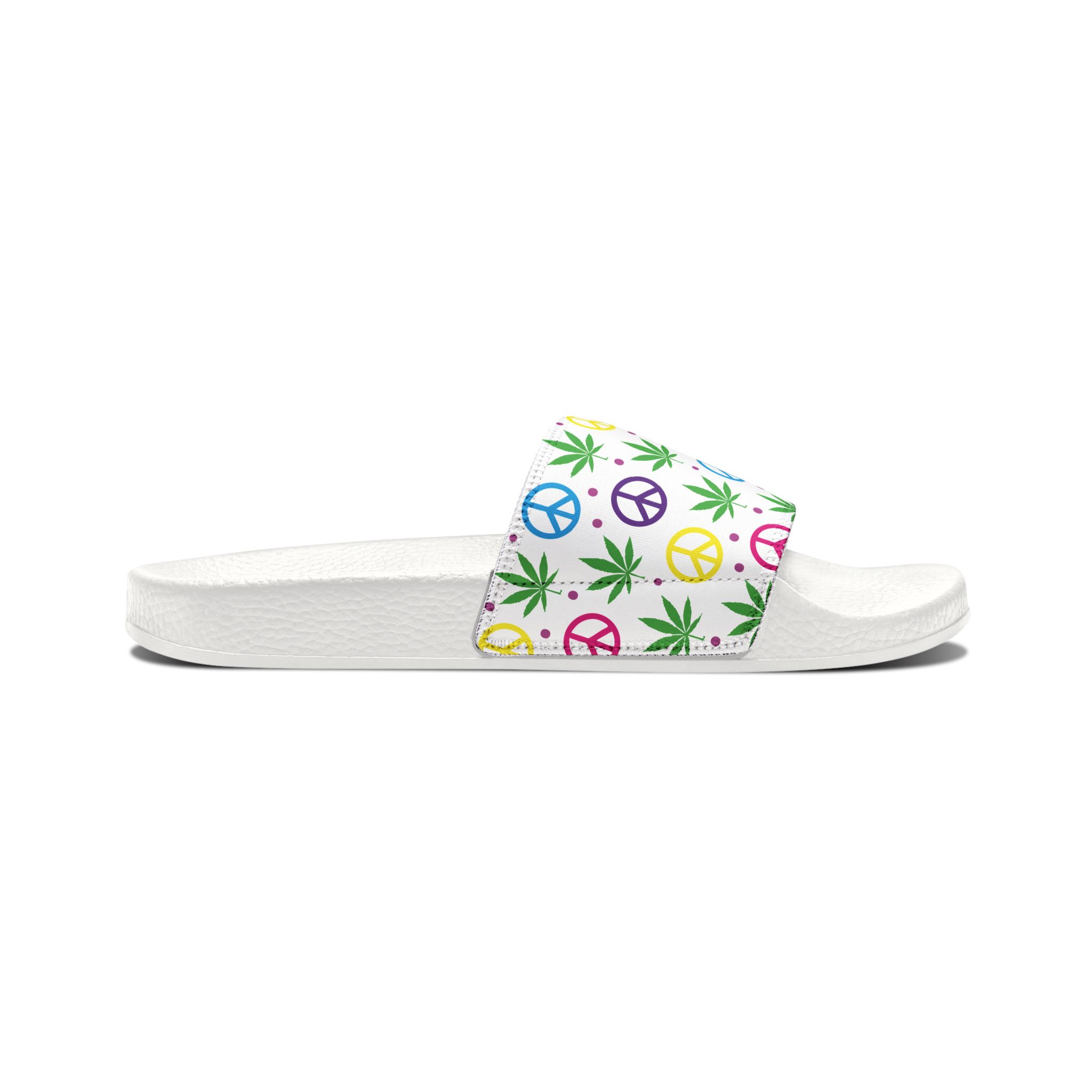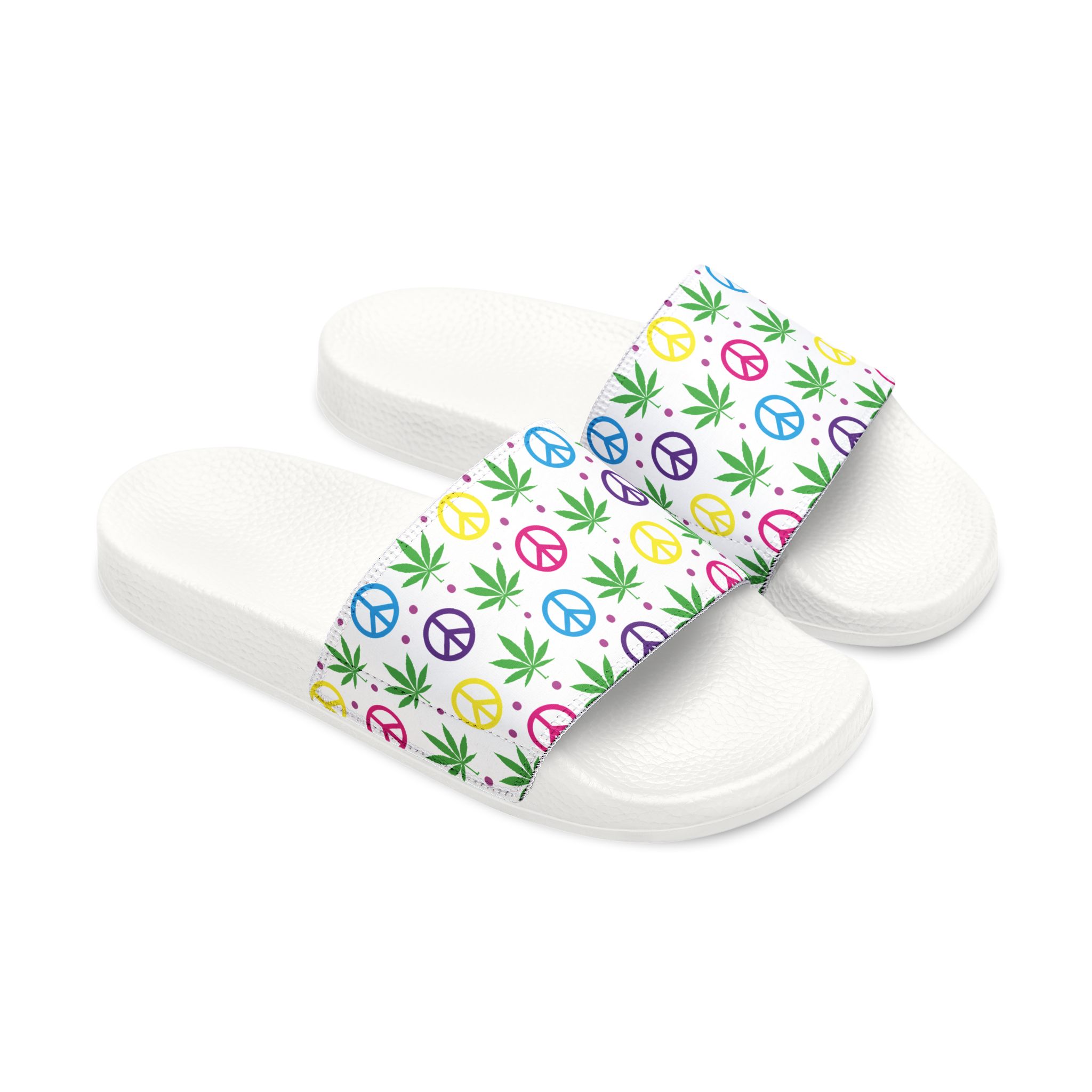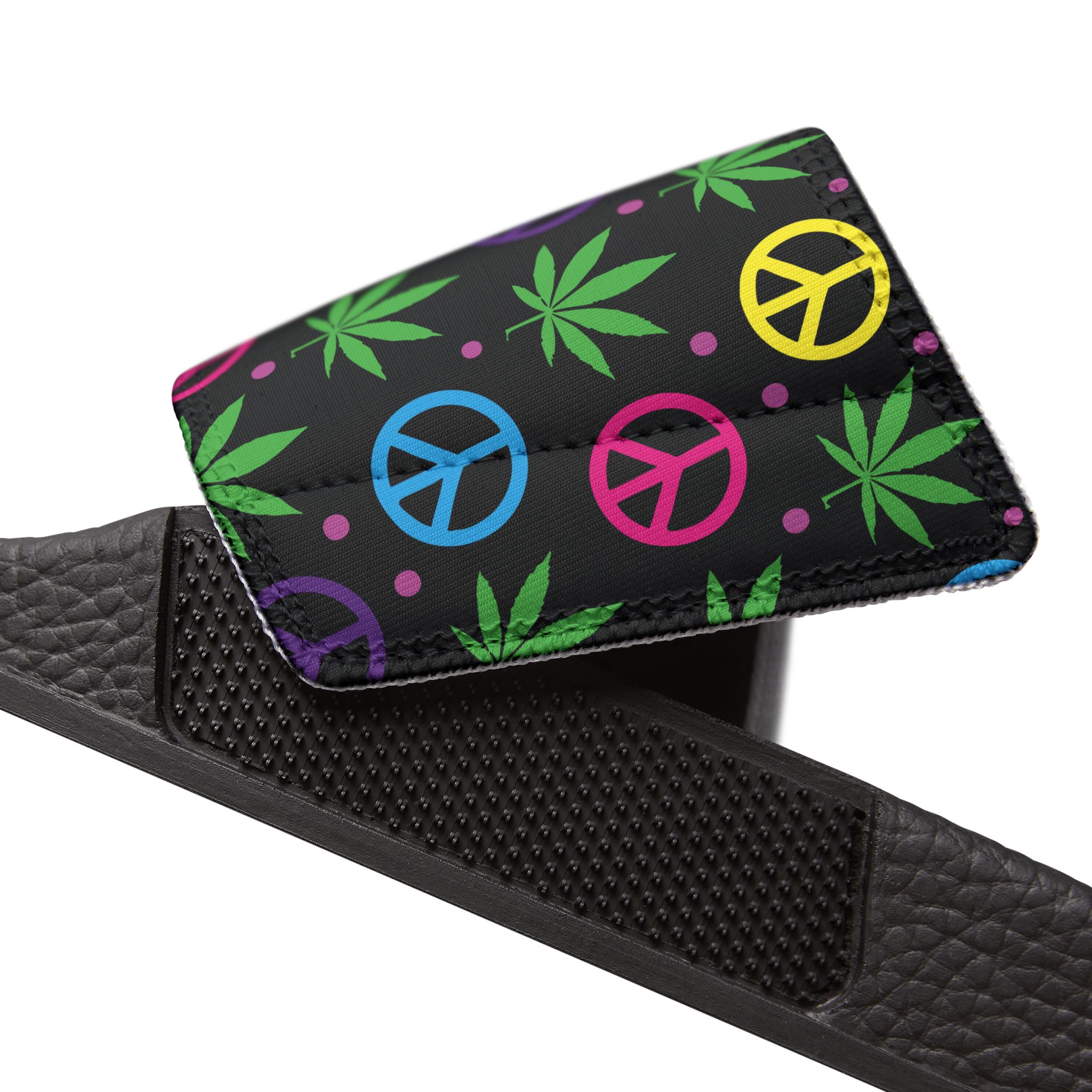 Stay cool with these women's slide sandals featuring peace signs and pot leaves. Durable PU outsoles and neoprene straps prevent chafing, while the ergonomic sole offers comfort for all your summer adventures!