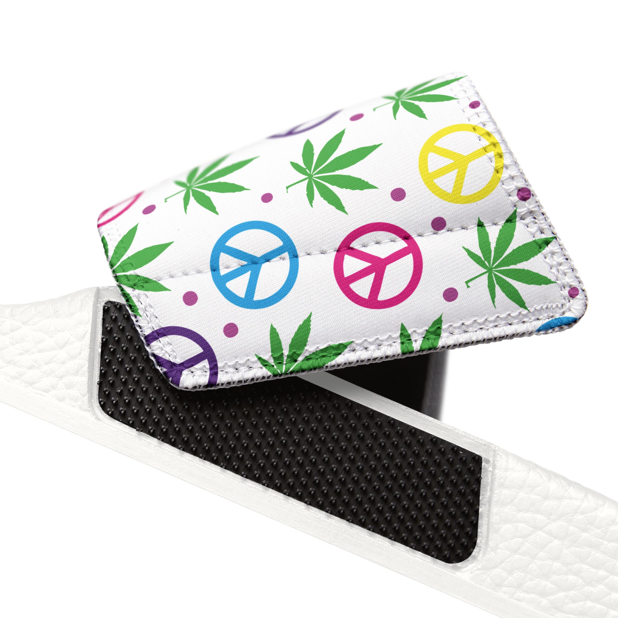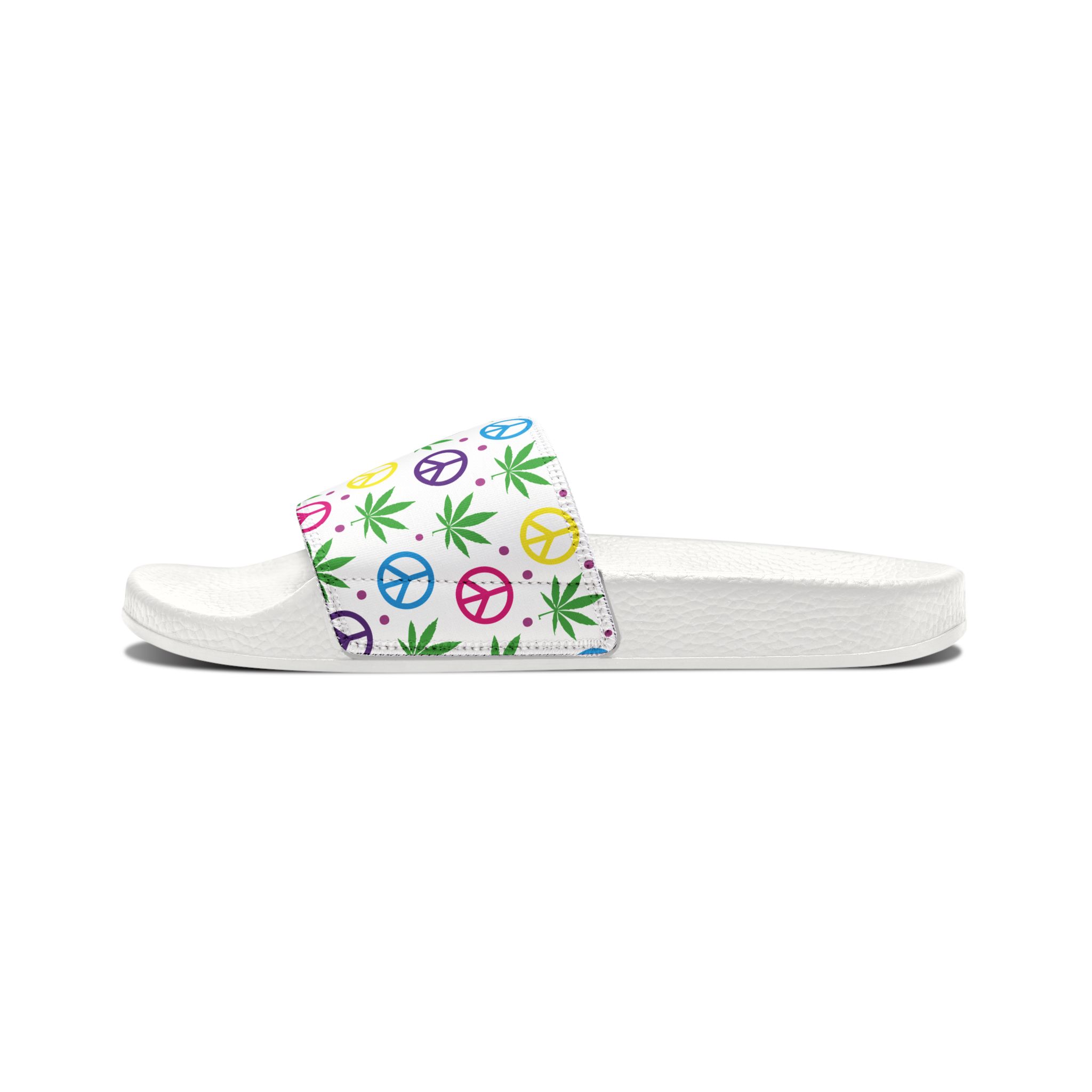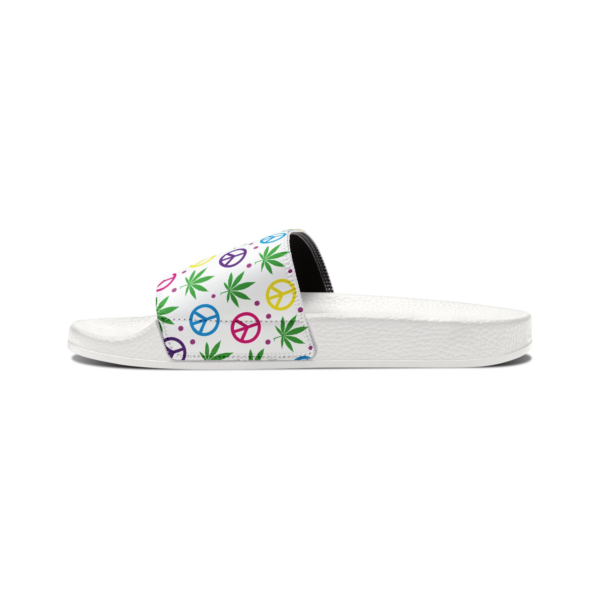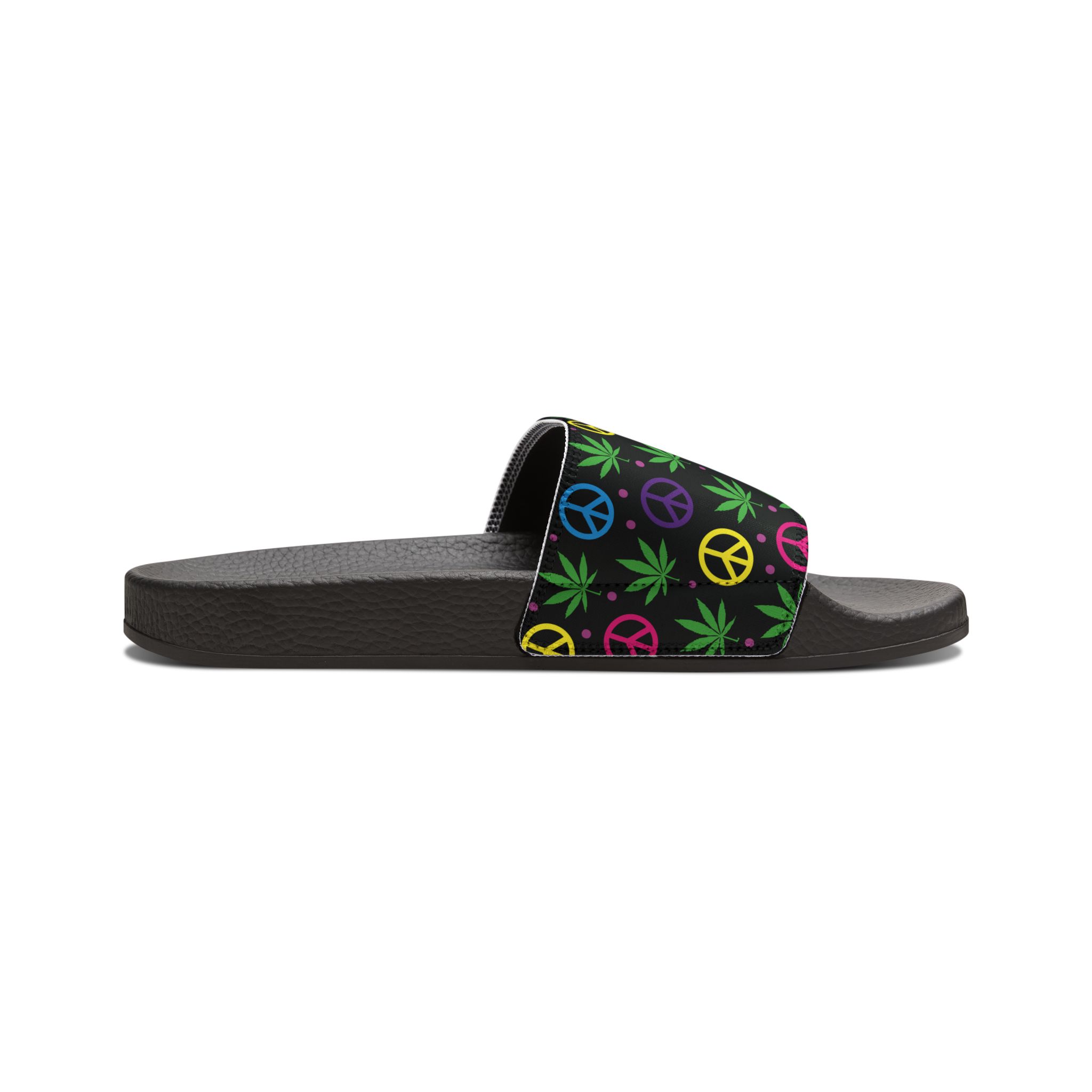 Stay cool with these women's slide sandals featuring peace signs and pot leaves. Durable PU outsoles and neoprene straps prevent chafing, while the ergonomic sole offers comfort for all your summer adventures!