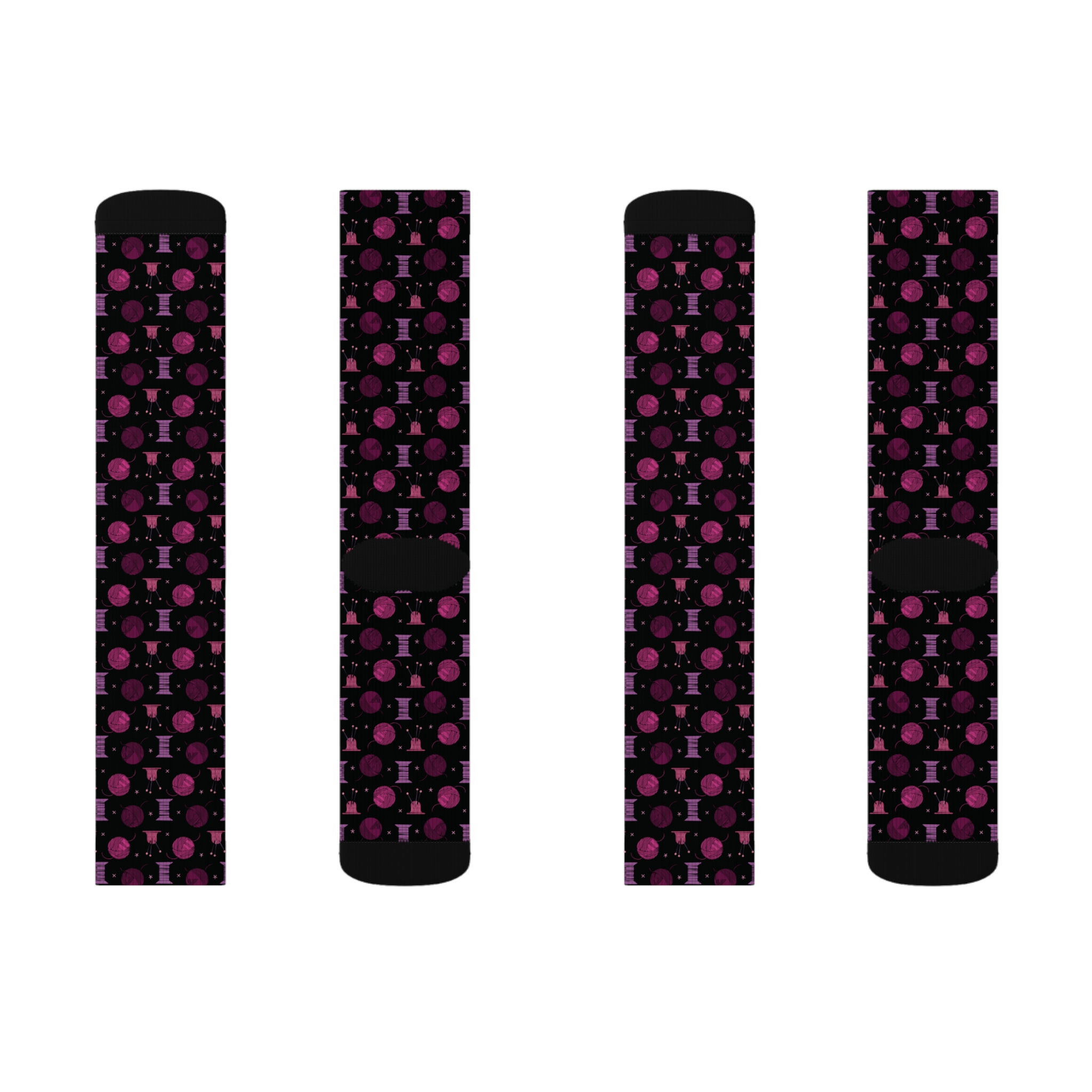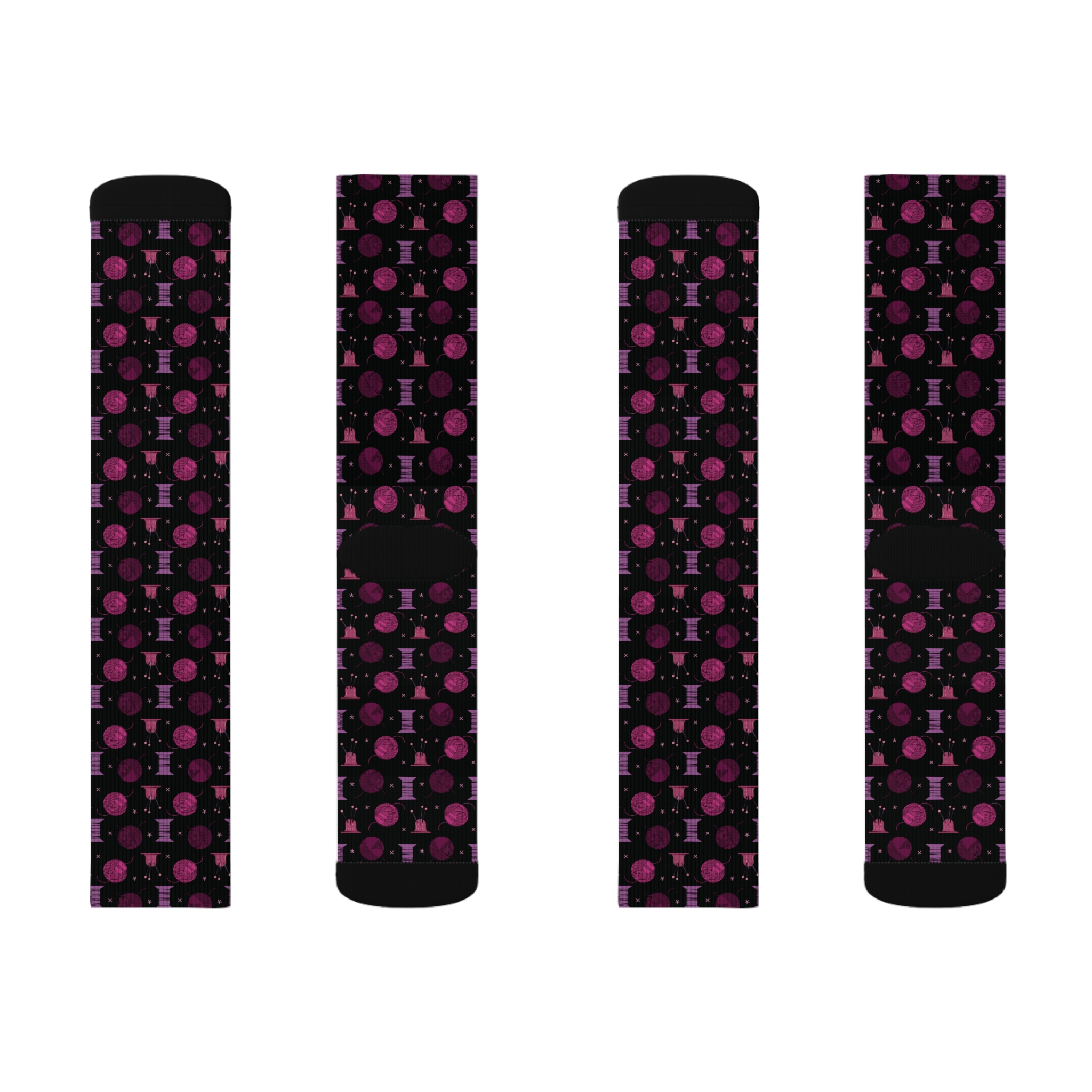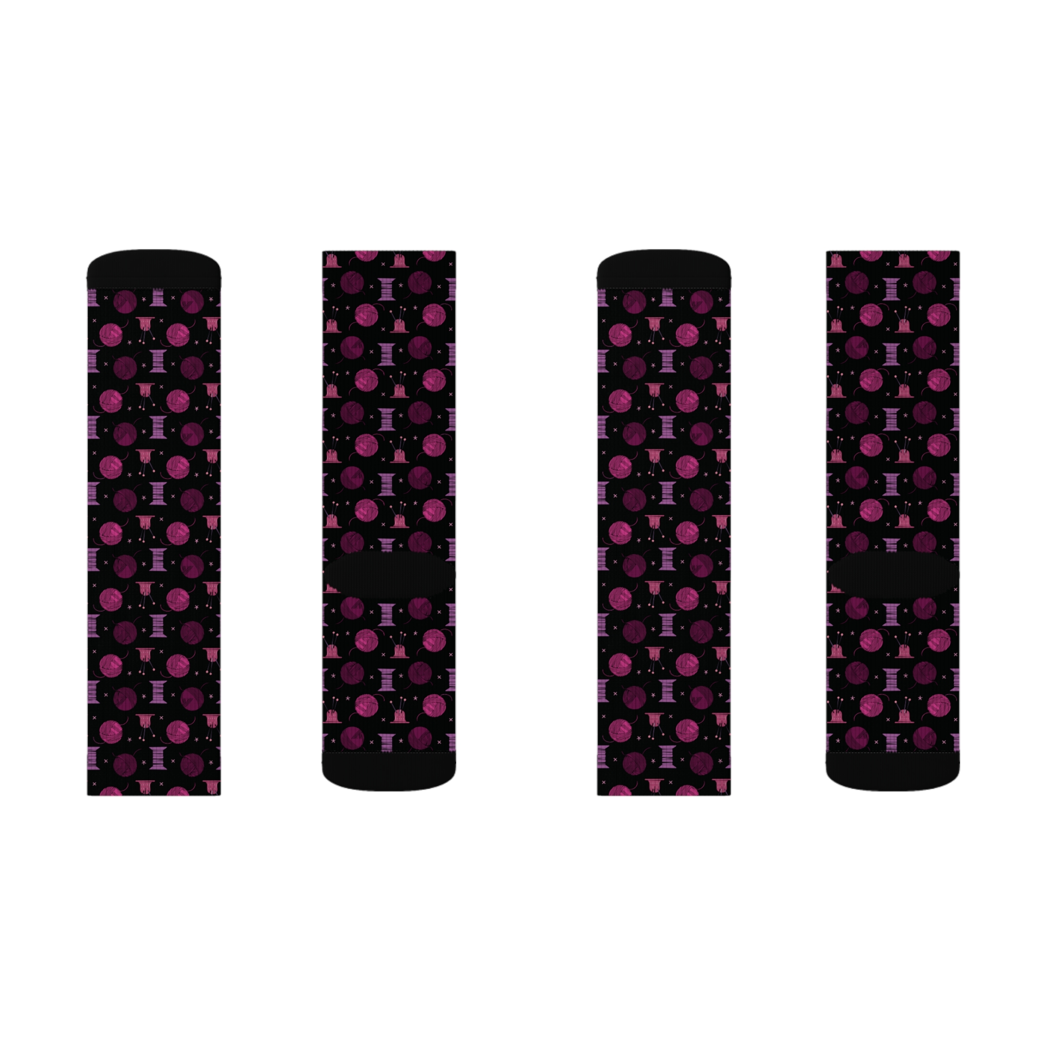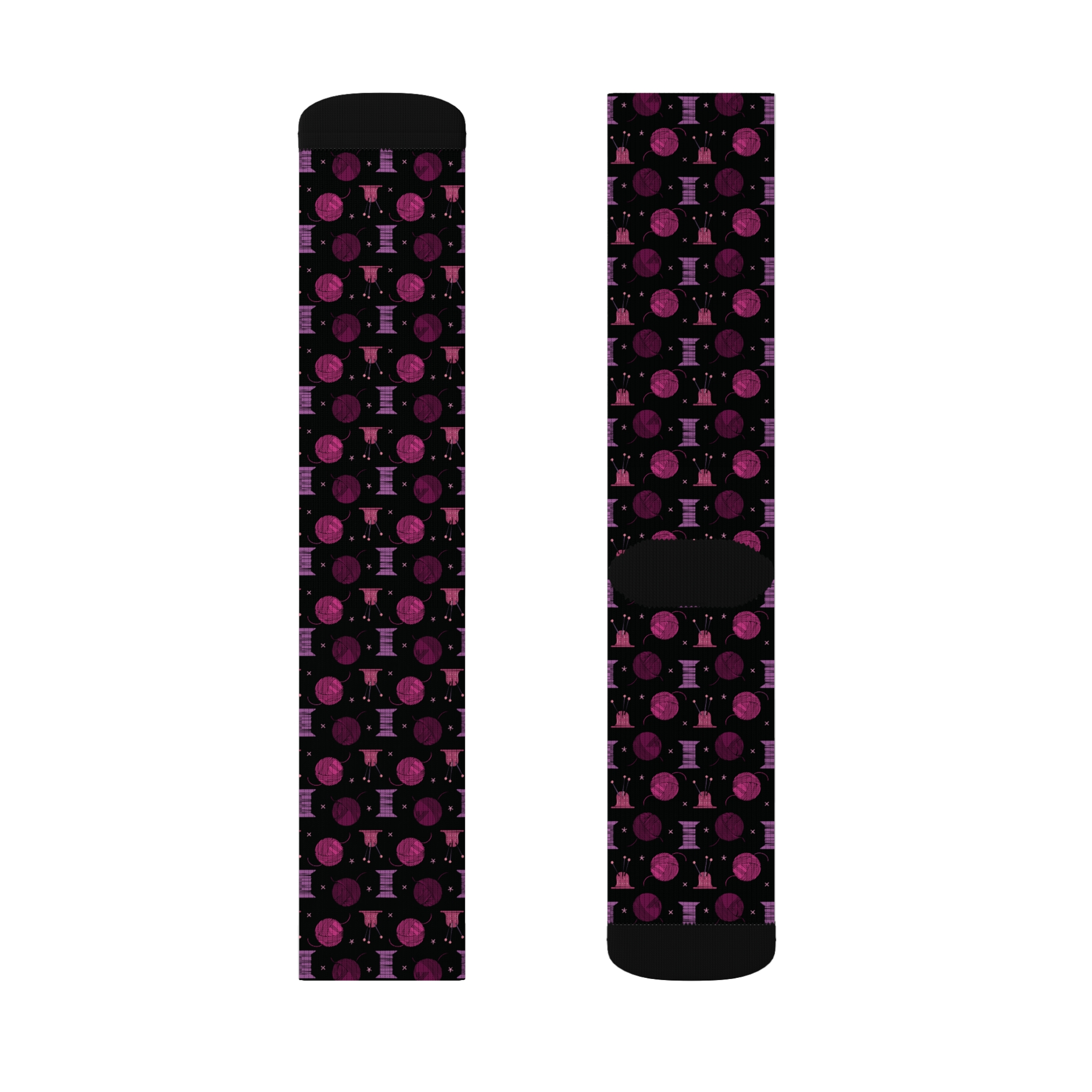 Step into comfort with these socks featuring playful patterns of yarn balls and spools of thread—perfect for crafters and knitters alike.